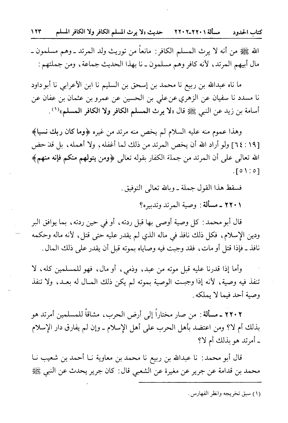 اللَّهِ - صَلَّى اللَّهُ عَلَيْهِ وَسَلَّمَ - مِنْ أَنَّهُ لَا يَرِثُ الْمُسْلِمُ الْكَافِرَ: مَانِعًا مِنْ تَوْرِيثِ وَلَدِ الْمُرْتَدِّ - وَهُمْ مُسْلِمُونَ - مَالَ أَبِيهِمْ الْمُرْتَدِّ، لِأَنَّهُ كَافِرٌ وَهُمْ مُسْلِمُونَ - أَنَا بِهَذَا الْحَدِيثِ جَمَاعَةٌ، وَمِنْ جُمْلَتِهِمْ: مَا أَنَاهُ عَبْدُ اللَّهِ بْنُ رَبِيعٍ أَنَا مُحَمَّدُ بْنُ إِسْحَاقَ بْنِ السُّلَيْمِ أَنَا ابْنُ الْأَعْرَابِيِّ أَنَا أَبُو دَاوُد أَنَا مُسَدَّدٌ أَنَا سُفْيَانُ عَنْ الزُّهْرِيِّ عَنْ عَلِيِّ بْنِ الْحُسَيْنِ عَنْ عَمْرِو بْنِ عُثْمَانَ بْنِ عَفَّانَ عَنْ أُسَامَةَ بْنِ زَيْدٍ عَنْ النَّبِيِّ - صَلَّى اللَّهُ عَلَيْهِ وَسَلَّمَ - قَالَ «لَا يَرِثُ الْمُسْلِمُ الْكَافِرَ وَلَا الْكَافِرُ الْمُسْلِمَ» .