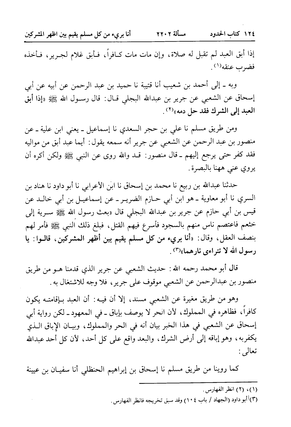 حَدَّثَنَا عَبْدُ اللَّهِ بْنُ رَبِيعٍ أَنَا مُحَمَّدُ بْنُ إِسْحَاقَ أَنَا ابْنُ الْأَعْرَابِيِّ أَنَا أَبُو دَاوُد أَنَا هَنَّادُ بْنُ السَّرِيِّ أَنَا أَبُو مُعَاوِيَةَ - هُوَ ابْنُ أَبِي خَازِمٍ الضَّرِيرُ - عَنْ إسْمَاعِيلَ بْنِ أَبِي خَالِدٍ عَنْ قَيْسِ بْنِ أَبِي حَازِمٍ عَنْ جَرِيرِ بْنِ عَبْدِ اللَّهِ الْبَجَلِيِّ قَالَ «بَعَثَ رَسُولُ اللَّهِ - صَلَّى اللَّهُ عَلَيْهِ وَسَلَّمَ - سَرِيَّةً إلَى خَثْعَمَ فَاعْتَصَمَ نَاسٌ مِنْهُمْ بِالسُّجُودِ فَأَسْرَعَ فِيهِمْ الْقَتْلَ، فَبَلَغَ ذَلِكَ النَّبِيَّ - صَلَّى اللَّهُ عَلَيْهِ وَسَلَّمَ - فَأَمَرَ لَهُمْ بِنِصْفِ الْعَقْلِ، وَقَالَ: أَنَا بَرِيءٌ مِنْ كُلِّ مُسْلِمٍ يُقِيمُ بَيْنَ أَظْهُرِ الْمُشْرِكِينَ، قَالُوا: يَا رَسُولَ اللَّهِ لَا تَتَرَاءَى نَارُهُمَا» .