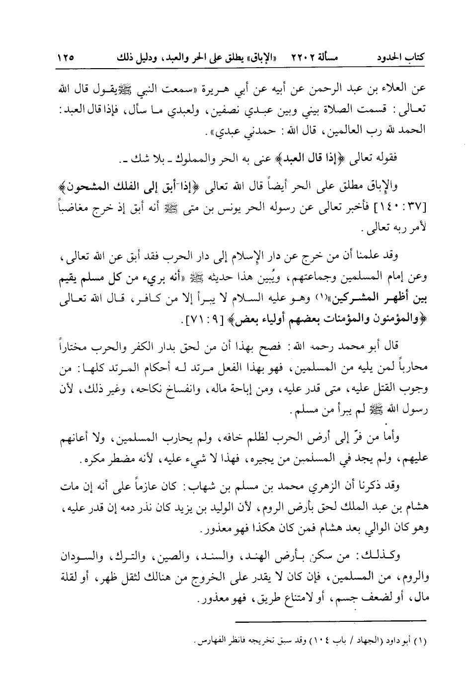وَالْإِبَاقُ مُطْلَقٌ عَلَى الْحُرِّ أَيْضًا قَالَ اللَّهُ تَعَالَى {إِذْ أَبَقَ إِلَى الْفُلْكِ الْمَشْحُونِ} [الصافات: 140] فَأَخْبَرَ تَعَالَى عَنْ رَسُولِهِ الْحُرِّ يُونُسَ بْنِ مَتَّى - صَلَّى اللَّهُ عَلَيْهِ وَسَلَّمَ - أَنَّهُ أَبَقَ إذْ خَرَجَ مُغَاضِبًا لِأَمْرِ رَبِّهِ تَعَالَى.