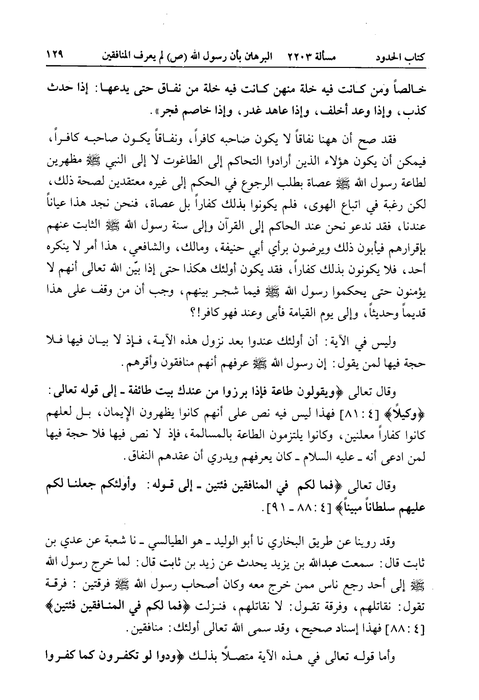 وَقَدْ رُوِّينَا عَنْ طَرِيقِ الْبُخَارِيِّ نا أَبُو الْوَلِيدِ - هُوَ الطَّيَالِسِيُّ - نا شُعْبَةُ عَنْ عَدِيِّ بْنِ ثَابِتٍ قَالَ: سَمِعْت عَبْدَ اللَّهِ بْنَ يَزِيدَ يُحَدِّثُ عَنْ زَيْدِ بْنِ ثَابِتٍ قَالَ: «لَمَّا خَرَجَ رَسُولُ اللَّهِ - صَلَّى اللَّهُ عَلَيْهِ وَسَلَّمَ - إلَى أُحُدٍ رَجَعَ نَاسٌ مِمَّنْ خَرَجَ مَعَهُ، وَكَانَ أَصْحَابُ رَسُولِ اللَّهِ - صَلَّى اللَّهُ عَلَيْهِ وَسَلَّمَ - فِرْقَتَيْنِ: فِرْقَةٌ تَقُولُ: نُقَاتِلُهُمْ، وَفِرْقَةٌ تَقُولُ: لَا نُقَاتِلُهُمْ، فَنَزَلَتْ {فَمَا لَكُمْ فِي الْمُنَافِقِينَ فِئَتَيْنِ} [النساء: 88] » فَهَذَا إسْنَادٌ صَحِيحٌ، وَقَدْ سَمَّى اللَّهُ تَعَالَى أُولَئِكَ: مُنَافِقِينَ.