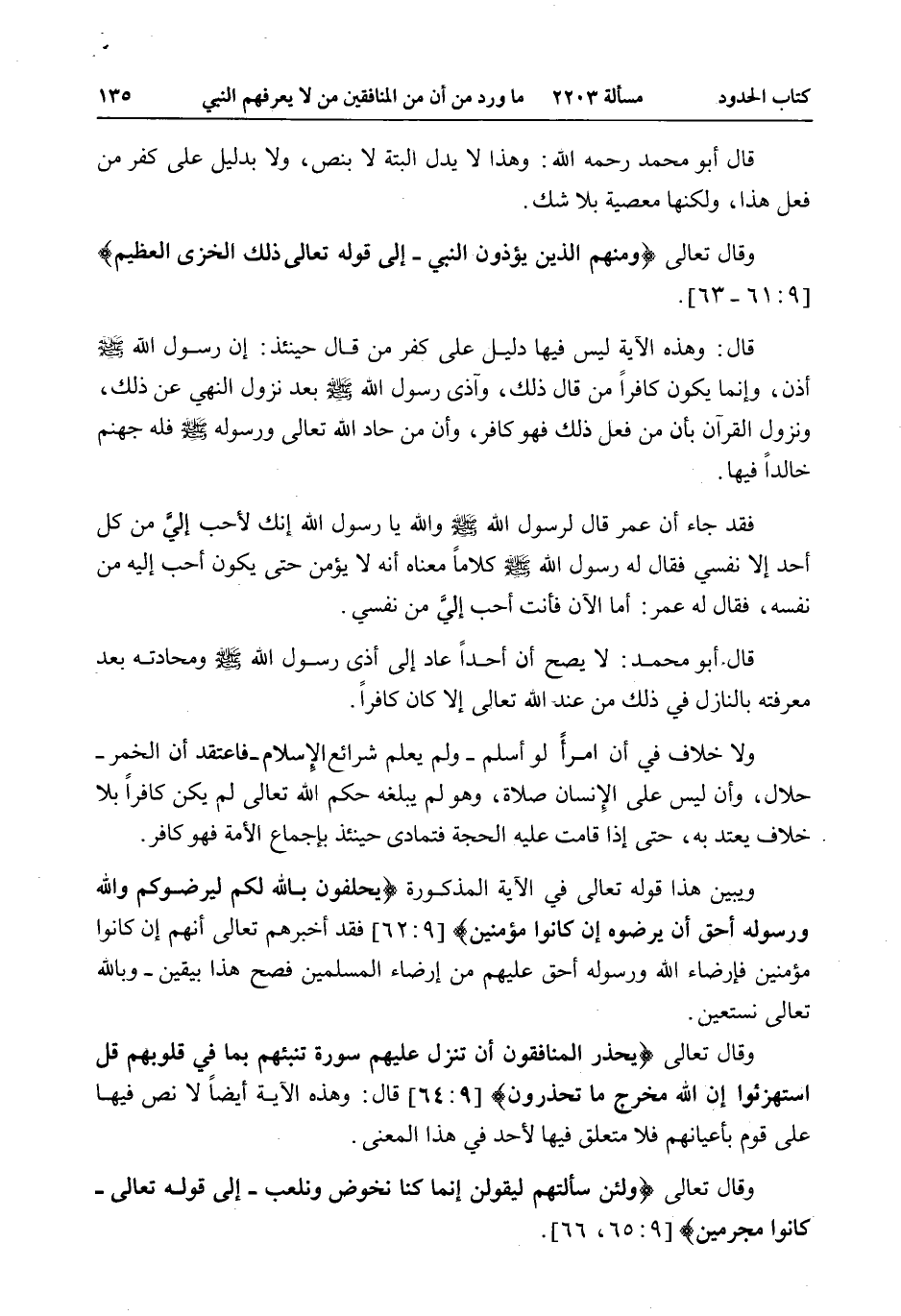 وَقَالَ تَعَالَى {يَحْذَرُ الْمُنَافِقُونَ أَنْ تُنَزَّلَ عَلَيْهِمْ سُورَةٌ تُنَبِّئُهُمْ بِمَا فِي قُلُوبِهِمْ قُلِ اسْتَهْزِئُوا إِنَّ اللَّهَ مُخْرِجٌ مَا تَحْذَرُونَ} [التوبة: 64] قَالَ: وَهَذِهِ الْآيَةُ أَيْضًا لَا نَصَّ فِيهَا عَلَى قَوْمٍ بِأَعْيَانِهِمْ فَلَا مُتَعَلَّقَ فِيهَا لِأَحَدٍ فِي هَذَا الْمَعْنَى.