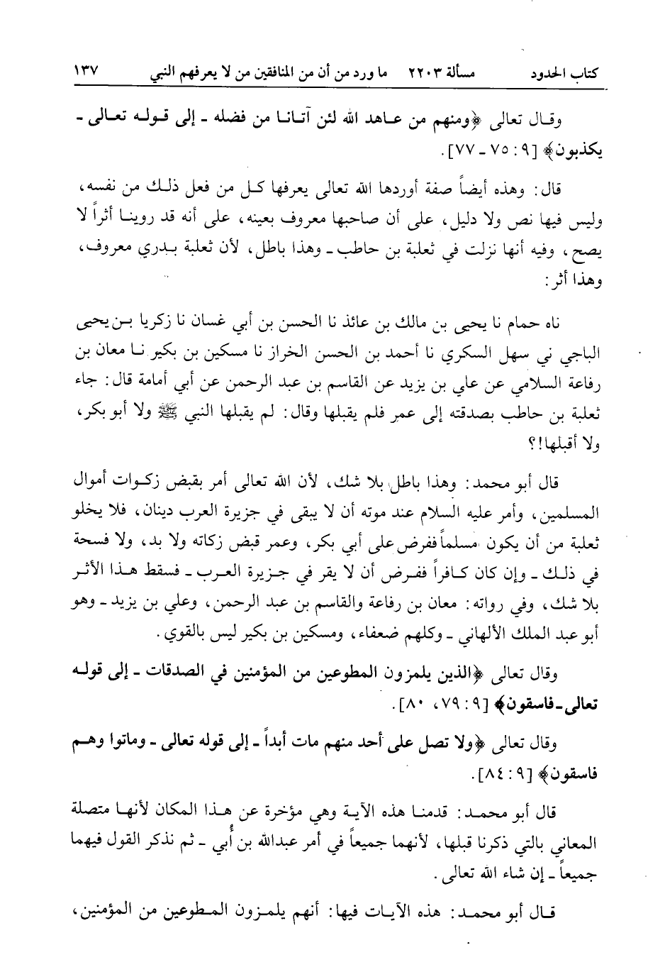 قَالَ: وَهَذِهِ أَيْضًا صِفَةٌ أَوْرَدَهَا اللَّهُ تَعَالَى يَعْرِفُهَا كُلُّ مَنْ فَعَلَ ذَلِكَ مِنْ نَفْسِهِ، وَلَيْسَ فِيهَا نَصٌّ وَلَا دَلِيلٌ، عَلَى أَنَّ صَاحِبَهَا مَعْرُوفٌ بِعَيْنِهِ، عَلَى أَنَّهُ قَدْ رُوِّينَا أَثَرًا لَا يَصِحُّ، وَفِيهِ أَنَّهَا نَزَلَتْ فِي ثَعْلَبَةَ بْنِ حَاطِبٍ - وَهَذَا بَاطِلٌ، لِأَنَّ ثَعْلَبَةَ بَدْرِيٌّ مَعْرُوفٌ، وَهَذَا أَثَرٌ: نا حُمَامٌ نا يَحْيَى بْنُ مَالِكِ بْنِ عَائِذٍ نا الْحَسَنُ بْنُ أَبِي غَسَّانَ نا زَكَرِيَّا بْنُ يَحْيَى الْبَاجِيَّ ني سَهْلٌ السُّكَّرِيُّ نا أَحْمَدُ بْنُ الْحَسَنِ الْخَرَّازُ نا مِسْكِينُ بْنُ بُكَيْرٍ نا مَعَانُ بْنُ رِفَاعَةَ السَّلَامِيُّ عَنْ عَلِيِّ بْنِ يَزِيدَ عَنْ الْقَاسِمِ بْنِ عَبْدِ الرَّحْمَنِ عَنْ أَبِي أُمَامَةَ قَالَ: «جَاءَ ثَعْلَبَةُ بْنُ حَاطِبٍ بِصَدَقَتِهِ إلَى عُمَرَ فَلَمْ يَقْبَلْهَا وَقَالَ: لَمْ يَقْبَلْهَا النَّبِيُّ - صَلَّى اللَّهُ عَلَيْهِ وَسَلَّمَ - وَلَا أَبُو بَكْرٍ، وَلَا أَقْبَلُهَا؟» قَالَ أَبُو مُحَمَّدٍ: وَهَذَا بَاطِلٌ بِلَا شَكٍّ، لِأَنَّ اللَّهَ تَعَالَى أَمَرَ بِقَبْضِ زَكَوَاتِ أَمْوَالِ الْمُسْلِمِينَ، وَأَمَرَ - عَلَيْهِ السَّلَامُ - عِنْدَ مَوْتِهِ أَنْ لَا يَبْقَى فِي جَزِيرَةِ الْعَرَبِ دِينَانِ، فَلَا يَخْلُو ثَعْلَبَةُ مِنْ أَنْ يَكُونَ مُسْلِمًا فَفَرَضَ عَلَى أَبِي بَكْرٍ، وَعُمَرَ قَبْضَ زَكَاتِهِ وَلَا بُدَّ، وَلَا فُسْحَةَ فِي ذَلِكَ - وَإِنْ كَانَ كَافِرًا فَفَرَضَ أَنْ لَا يُقِرَّ فِي جَزِيرَةِ الْعَرَبِ - فَسَقَطَ هَذَا الْأَثَرُ بِلَا شَكٍّ، وَفِي رُوَاتِهِ: مَعَانُ بْنُ رِفَاعَةَ وَالْقَاسِمُ بْنُ عَبْدِ الرَّحْمَنِ، وَعَلِيُّ بْنُ يَزِيدَ - وَهُوَ أَبُو عَبْدِ الْمَلِكِ الْأَلْهَانِيُّ - وَكُلُّهُمْ ضُعَفَاءُ، وَمِسْكِينُ بْنُ بُكَيْرٍ لَيْسَ بِالْقَوِيِّ. وَقَالَ تَعَالَى {الَّذِينَ يَلْمِزُونَ الْمُطَّوِّعِينَ مِنَ الْمُؤْمِنِينَ فِي الصَّدَقَاتِ} [التوبة: 79] إلَى قَوْله تَعَالَى {فَاسِقُونَ} [المائدة: 59] . وَقَالَ تَعَالَى {وَلا تُصَلِّ عَلَى أَحَدٍ مِنْهُمْ مَاتَ أَبَدًا} [التوبة: 84] إلَى قَوْله تَعَالَى {وَمَاتُوا وَهُمْ فَاسِقُونَ} [التوبة: 84] . قَالَ أَبُو مُحَمَّدٍ: قَدَّمْنَا هَذِهِ الْآيَةَ وَهِيَ مُؤَخَّرَةٌ عَنْ هَذَا الْمَكَانِ؛ لِأَنَّهَا مُتَّصِلَةُ الْمَعَانِي بِاَلَّتِي ذَكَرْنَا قَبْلَهَا، لِأَنَّهُمَا جَمِيعًا فِي أَمْرِ عَبْدِ اللَّهِ بْنِ أُبَيٍّ - ثُمَّ نَذْكُرُ الْقَوْلَ فِيهِمَا جَمِيعًا - إنْ شَاءَ اللَّهُ تَعَالَى. قَالَ أَبُو مُحَمَّدٍ: هَذِهِ الْآيَاتُ فِيهَا: أَنَّهُمْ يَلْمِزُونَ الْمُطَّوِّعِينَ مِنْ الْمُؤْمِنِينَ،