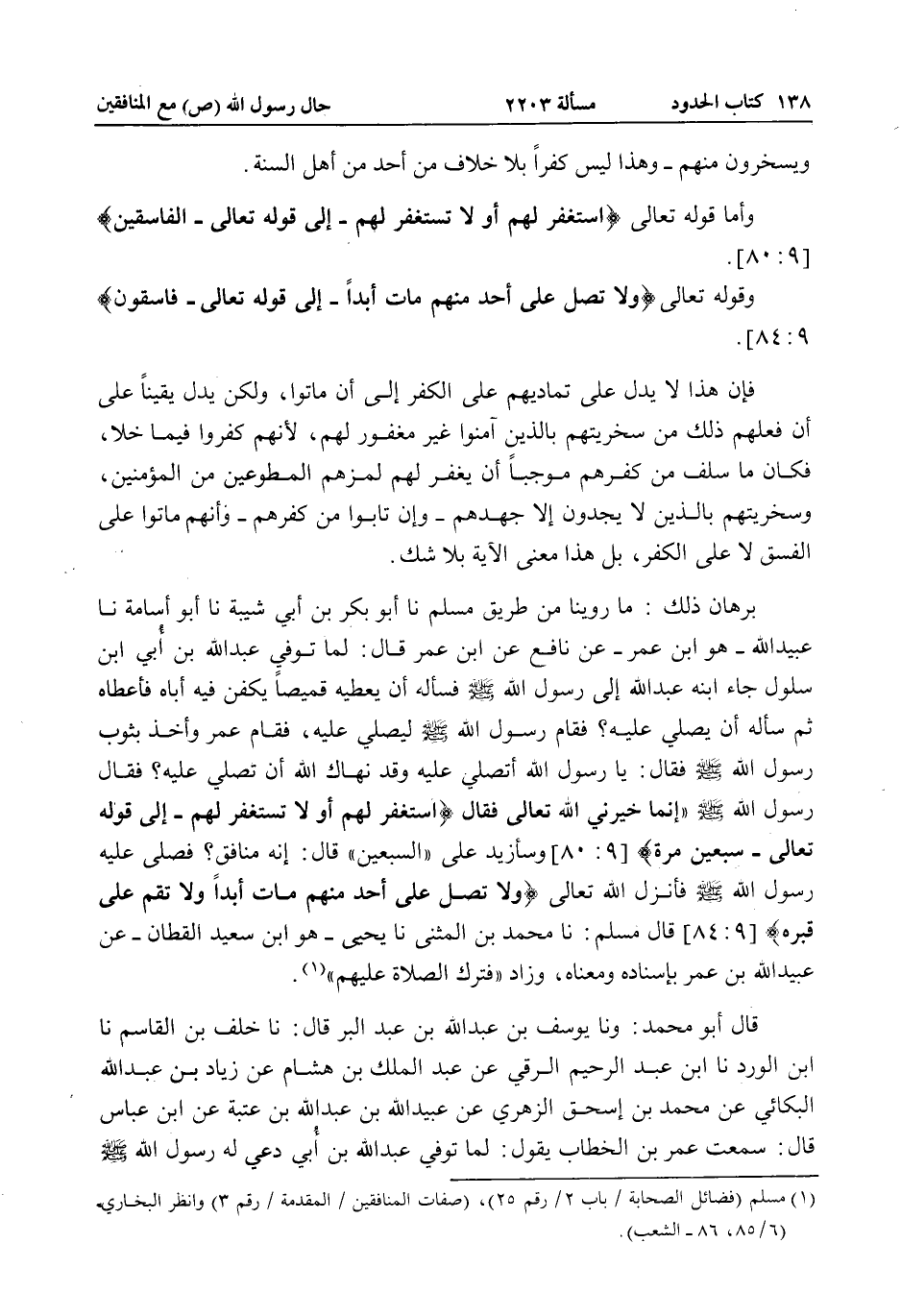 وَيَسْخَرُونَ مِنْهُمْ - وَهَذَا لَيْسَ كُفْرًا بِلَا خِلَافٍ مِنْ أَحَدٍ مِنْ أَهْلِ السُّنَّةِ. وَأَمَّا قَوْله تَعَالَى {اسْتَغْفِرْ لَهُمْ أَوْ لا تَسْتَغْفِرْ لَهُمْ} [التوبة: 80] إلَى قَوْله تَعَالَى {الْفَاسِقِينَ} [البقرة: 26] . وقَوْله تَعَالَى {وَلا تُصَلِّ عَلَى أَحَدٍ مِنْهُمْ مَاتَ أَبَدًا} [التوبة: 84] إلَى قَوْله تَعَالَى {فَاسِقُونَ} [المائدة: 59] . فَإِنَّ هَذَا لَا يَدُلُّ عَلَى تَمَادِيهِمْ عَلَى الْكُفْرِ إلَى أَنْ مَاتُوا، وَلَكِنْ يَدُلُّ يَقِينًا عَلَى أَنَّ فِعْلَهُمْ ذَلِكَ مِنْ سُخْرِيَّتِهِمْ بِاَلَّذِينَ آمَنُوا غَيْرُ مَغْفُورٍ لَهُمْ، لِأَنَّهُمْ كَفَرُوا فِيمَا خَلَا، فَكَانَ مَا سَلَفَ مِنْ كُفْرِهِمْ مُوجِبًا أَنْ يُغْفَرَ لَهُمْ لَمْزُهُمْ الْمُطَّوِّعِينَ مِنْ الْمُؤْمِنِينَ، وَسُخْرِيَّتُهُمْ بِاَلَّذِينَ لَا يَجِدُونَ إلَّا جَهْدَهُمْ - وَإِنْ تَابُوا مِنْ كُفْرِهِمْ - وَأَنَّهُمْ مَاتُوا عَلَى الْفِسْقِ لَا عَلَى الْكُفْرِ، بَلْ هَذَا مَعْنَى الْآيَةِ بِلَا شَكٍّ. بُرْهَانُ ذَلِكَ: مَا رُوِّينَا مِنْ طَرِيقِ مُسْلِمٍ نا أَبُو بَكْرِ بْنُ أَبِي شَيْبَةَ نا أَبُو أُسَامَةَ نا عُبَيْدُ اللَّهِ - هُوَ ابْنُ عُمَرَ - عَنْ نَافِعٍ عَنْ ابْنِ عُمَرَ قَالَ: «لَمَّا تُوُفِّيَ عَبْدُ اللَّهِ بْنُ أُبَيٍّ ابْنُ سَلُولَ جَاءَ ابْنُهُ عَبْدُ اللَّهِ إلَى رَسُولِ اللَّهِ - صَلَّى اللَّهُ عَلَيْهِ وَسَلَّمَ - فَسَأَلَهُ أَنْ يُعْطِيَهُ قَمِيصًا يُكَفِّنُ فِيهِ أَبَاهُ فَأَعْطَاهُ ثُمَّ سَأَلَهُ أَنْ يُصَلِّيَ عَلَيْهِ؟ فَقَامَ رَسُولُ اللَّهِ - صَلَّى اللَّهُ عَلَيْهِ وَسَلَّمَ - لِيُصَلِّيَ عَلَيْهِ، فَقَامَ عُمَرُ وَأَخَذَ بِثَوْبِ رَسُولِ اللَّهِ - صَلَّى اللَّهُ عَلَيْهِ وَسَلَّمَ - فَقَالَ: يَا رَسُولَ اللَّهِ أَتُصَلِّي عَلَيْهِ وَقَدْ نَهَاكَ اللَّهُ أَنْ تُصَلِّيَ عَلَيْهِ؟ فَقَالَ رَسُولُ اللَّهِ - صَلَّى اللَّهُ عَلَيْهِ وَسَلَّمَ - إنَّمَا خَيَّرَنِي اللَّهُ تَعَالَى فَقَالَ {اسْتَغْفِرْ لَهُمْ أَوْ لا تَسْتَغْفِرْ لَهُمْ} [التوبة: 80] إلَى قَوْله تَعَالَى {سَبْعِينَ مَرَّةً} [التوبة: 80] وَسَأَزِيدُ عَلَى السَّبْعِينَ قَالَ: إنَّهُ مُنَافِقٌ؟ فَصَلَّى عَلَيْهِ رَسُولُ اللَّهِ - صَلَّى اللَّهُ عَلَيْهِ وَسَلَّمَ - فَأَنْزَلَ اللَّهُ تَعَالَى {وَلا تُصَلِّ عَلَى أَحَدٍ مِنْهُمْ مَاتَ أَبَدًا وَلا تَقُمْ عَلَى قَبْرِهِ} [التوبة: 84] » قَالَ مُسْلِمٌ: نا مُحَمَّدُ بْنُ الْمُثَنَّى نا يَحْيَى - هُوَ ابْنُ سَعِيدٍ الْقَطَّانُ - عَنْ عُبَيْدِ اللَّهِ بْنِ عُمَرَ بِإِسْنَادِهِ وَمَعْنَاهُ، وَزَادَ «فَتَرَكَ الصَّلَاةَ عَلَيْهِمْ»