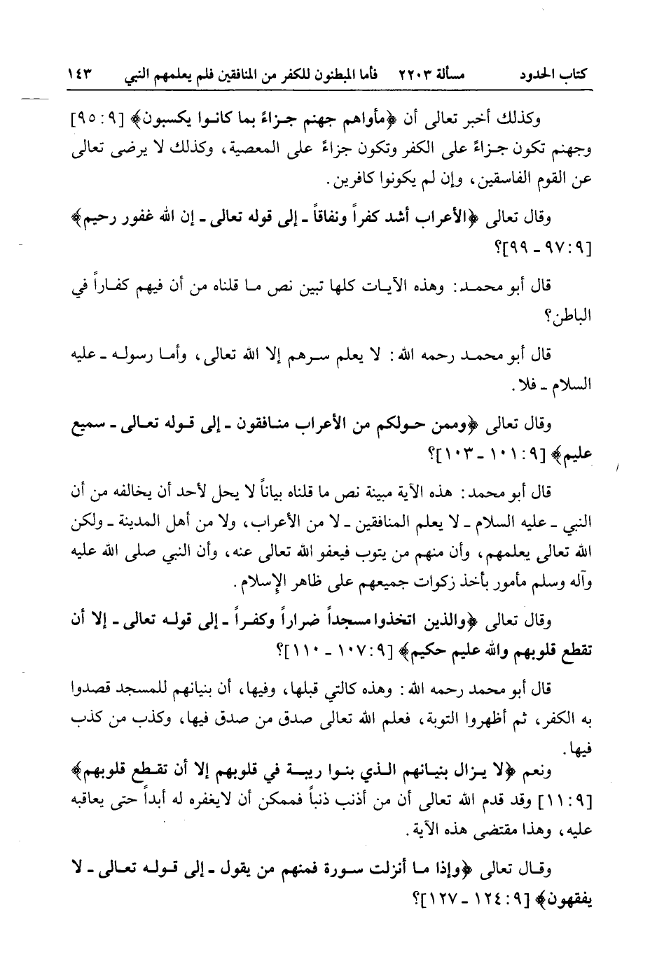 وَقَالَ تَعَالَى {الأَعْرَابُ أَشَدُّ كُفْرًا وَنِفَاقًا} [التوبة: 97] إلَى قَوْله تَعَالَى {إِنَّ اللَّهَ غَفُورٌ رَحِيمٌ} [البقرة: 173] ؟ قَالَ أَبُو مُحَمَّدٍ: وَهَذِهِ الْآيَاتُ كُلُّهَا تُبَيِّنُ نَصَّ مَا قُلْنَاهُ مِنْ أَنَّ فِيهِمْ كُفَّارًا فِي الْبَاطِنِ؟ قَالَ أَبُو مُحَمَّدٍ - رَحِمَهُ اللَّهُ -: لَا يَعْلَمُ سِرَّهُمْ إلَّا اللَّهُ تَعَالَى، وَأَمَّا رَسُولُهُ - عَلَيْهِ السَّلَامُ - فَلَا.