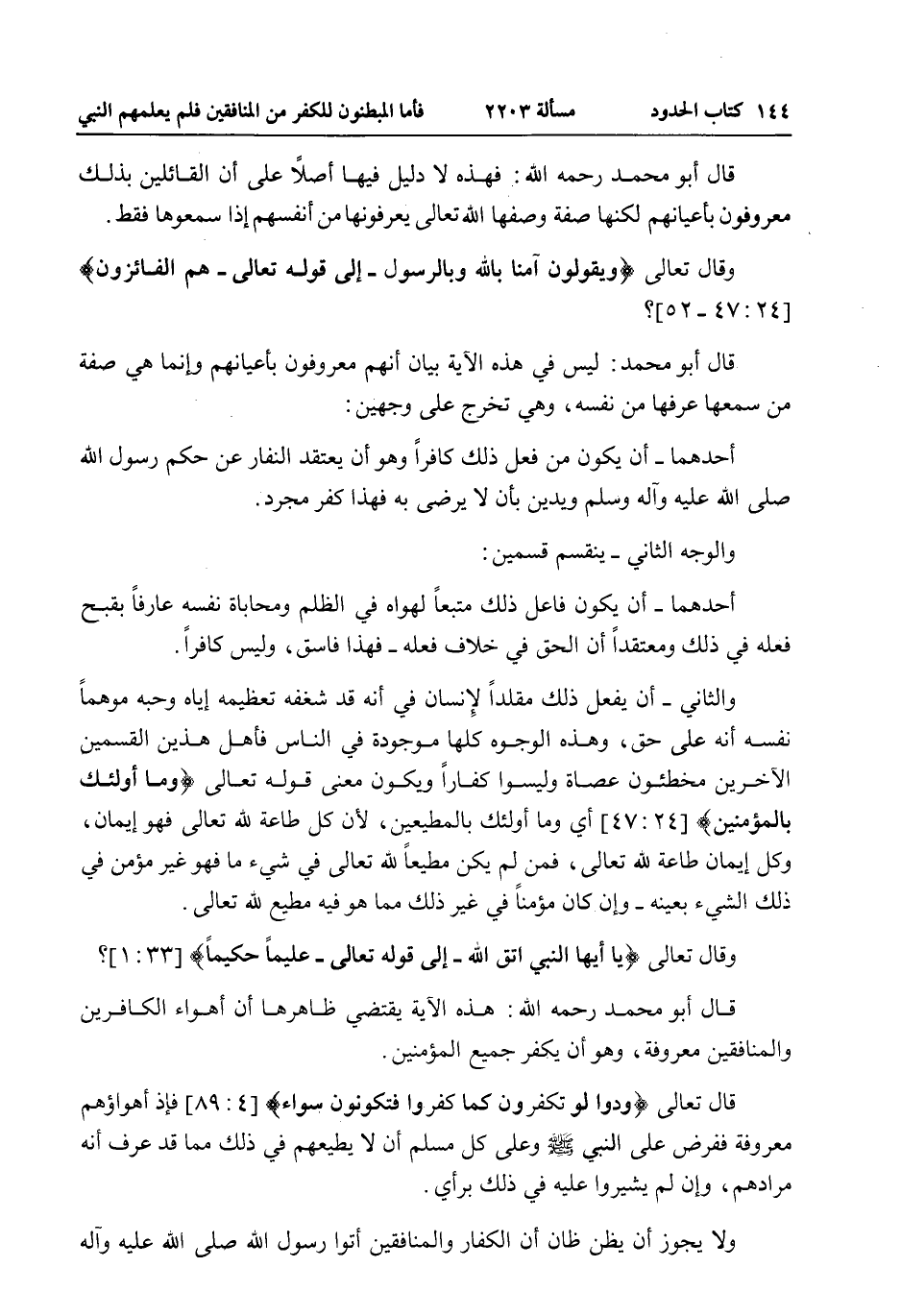 وَقَالَ تَعَالَى {يَا أَيُّهَا النَّبِيُّ اتَّقِ اللَّهَ} [الأحزاب: 1] إلَى قَوْله تَعَالَى {عَلِيمًا حَكِيمًا} [النساء: 11] ؟ قَالَ أَبُو مُحَمَّدٍ - رَحِمَهُ اللَّهُ -: هَذِهِ الْآيَةُ يَقْتَضِي ظَاهِرُهَا أَنَّ أَهْوَاءَ الْكَافِرِينَ وَالْمُنَافِقِينَ مَعْرُوفَةٌ، وَهُوَ أَنْ يَكْفُرَ جَمِيعُ الْمُؤْمِنِينَ.