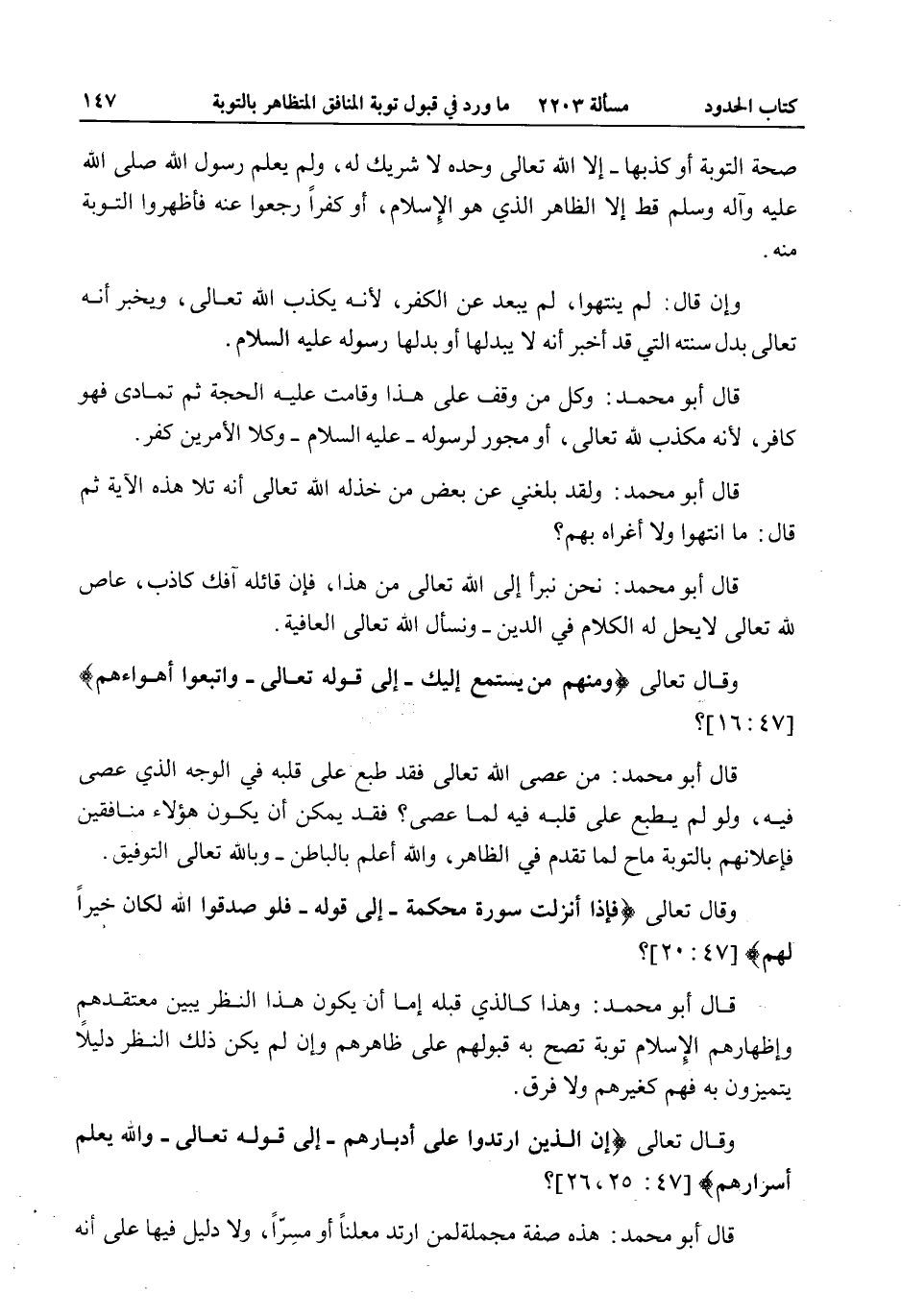 وَقَالَ تَعَالَى {وَمِنْهُمْ مَنْ يَسْتَمِعُ إِلَيْكَ} [الأنعام: 25] إلَى قَوْله تَعَالَى {وَاتَّبَعُوا أَهْوَاءَهُمْ} [محمد: 14] ؟ قَالَ أَبُو مُحَمَّدٍ: مَنْ عَصَى اللَّهَ تَعَالَى فَقَدْ طَبَعَ عَلَى قَلْبِهِ فِي الْوَجْهِ الَّذِي عَصَى فِيهِ، وَلَوْ لَمْ يَطْبَعْ عَلَى قَلْبِهِ فِيهِ لَمَا عَصَى؟ فَقَدْ يُمْكِنُ أَنْ يَكُونَ هَؤُلَاءِ مُنَافِقِينَ فَإِعْلَانُهُمْ بِالتَّوْبَةِ مَاحٍ لِمَا تَقَدَّمَ فِي الظَّاهِرِ، وَاَللَّهُ أَعْلَمُ بِالْبَاطِنِ وَبِاَللَّهِ تَعَالَى التَّوْفِيقُ.