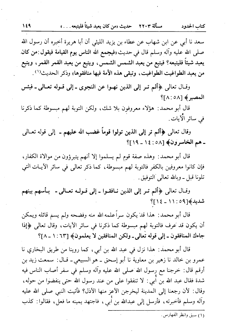 وَقَالَ تَعَالَى {أَلَمْ تَرَ إِلَى الَّذِينَ نَافَقُوا} [الحشر: 11] إلَى قَوْله تَعَالَى {بَأْسُهُمْ بَيْنَهُمْ شَدِيدٌ} [الحشر: 14] ؟ قَالَ أَبُو مُحَمَّدٍ: هَذَا قَدْ يَكُونُ سِرًّا عَلَّمَهُ اللَّهُ مِنْهُ وَفَضَحَهُ وَلَمْ يُسَمِّ قَائِلَهُ وَيُمْكِنُ أَنْ يَكُونَ قَدْ عَرَفَ فَالتَّوْبَةُ لَهُمْ مَبْسُوطَةٌ كَمَا ذَكَرْنَا فِي سَائِرِ الْآيَاتِ، وَقَالَ تَعَالَى {إِذَا جَاءَكَ الْمُنَافِقُونَ} [المنافقون: 1] إلَى قَوْله تَعَالَى {وَلَكِنَّ الْمُنَافِقِينَ لا يَعْلَمُونَ} [المنافقون: 8] ؟ قَالَ أَبُو مُحَمَّدٍ: هَذَا نَزَلَ فِي عَبْدِ اللَّهِ بْنِ أُبَيٍّ، كَمَا رُوِّينَا مِنْ طَرِيقِ الْبُخَارِيِّ نا عَمْرُو بْنُ خَالِدٍ نا زُهَيْرُ بْنُ مُعَاوِيَةَ نا أَبُو إِسْحَاقَ هُوَ السَّبِيعِيُّ قَالَ: سَمِعْتُ زَيْدَ بْنَ أَرْقَمَ قَالَ: «خَرَجْنَا مَعَ رَسُولِ اللَّهِ - صَلَّى اللَّهُ عَلَيْهِ وَآلِهِ وَسَلَّمَ - فِي سَفَرٍ أَصَابَ النَّاسَ فِيهِ شِدَّةٌ فَقَالَ عَبْدُ اللَّهِ بْنُ أُبَيٍّ: لَا تُنْفِقُوا عَلَى مَنْ عِنْدَ رَسُولِ اللَّهِ حَتَّى يَنْفَضُّوا مِنْ حَوْلِهِ، وَقَالَ: لَئِنْ رَجَعْنَا إلَى الْمَدِينَةِ لَيُخْرِجَنَّ الْأَعَزُّ مِنْهَا الْأَذَلَّ؟ فَأَتَيْتُ النَّبِيَّ - صَلَّى اللَّهُ عَلَيْهِ وَآلِهِ وَسَلَّمَ - فَأَخْبَرْتُهُ، فَأَرْسَلَ إلَى عَبْدِ اللَّهِ بْنِ أُبَيٍّ، فَاجْتَهَدَ يَمِينَهُ مَا فَعَلَ، فَقَالُوا: كَذَبَ