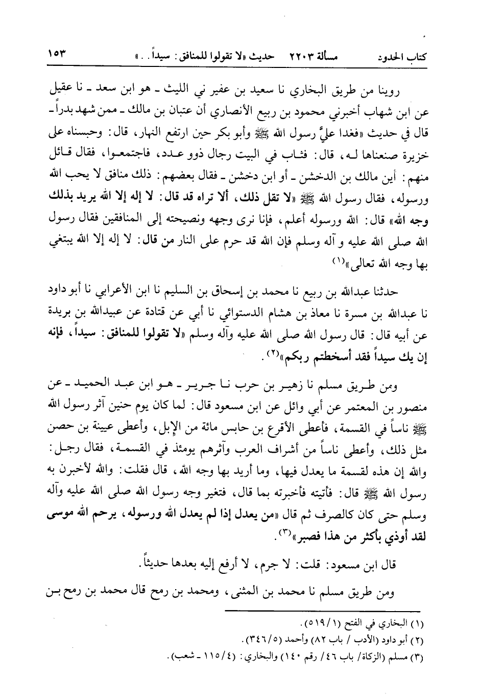 رُوِّينَا مِنْ طَرِيقِ الْبُخَارِيِّ نا سَعِيدُ بْنُ عُفَيْرٍ ني اللَّيْثُ هُوَ ابْنُ سَعْدٍ - نا عُقَيْلٌ عَنْ ابْنِ شِهَابٍ أَخْبَرَنِي مَحْمُودُ بْنُ رَبِيعٍ الْأَنْصَارِيُّ أَنَّ «عِتْبَانَ بْنَ مَالِكٍ - مِمَّنْ شَهِدَ بَدْرًا - قَالَ فِي حَدِيثٍ فَغَدَا عَلَيَّ رَسُولُ اللَّهِ - صَلَّى اللَّهُ عَلَيْهِ وَسَلَّمَ - وَأَبُو بَكْرٍ حِينَ ارْتَفَعَ النَّهَارُ، قَالَ: وَحَبَسْنَاهُ عَلَى خَزِيرَةٍ صَنَعْنَاهَا لَهُ، قَالَ: فَثَابَ فِي الْبَيْتِ رِجَالٌ ذَوُو عَدَدٍ، فَاجْتَمَعُوا، فَقَالَ قَائِلٌ مِنْهُمْ: أَيْنَ مَالِكُ بْنُ الدِّخْشَنِ - أَوْ ابْنُ دَخْشَنٍ - فَقَالَ بَعْضُهُمْ: ذَلِكَ مُنَافِقٌ لَا يُحِبُّ اللَّهَ وَرَسُولَهُ، فَقَالَ رَسُولُ اللَّهِ - صَلَّى اللَّهُ عَلَيْهِ وَسَلَّمَ - لَا تَقُلْ ذَلِكَ، أَلَا تَرَاهُ قَدْ قَالَ: لَا إلَهَ إلَّا اللَّهُ يُرِيدُ بِذَلِكَ وَجْهَ اللَّهِ قَالَ: اللَّهُ وَرَسُولُهُ أَعْلَمُ، فَإِنَّا نَرَى وَجْهَهُ وَنَصِيحَتَهُ إلَى الْمُنَافِقِينَ فَقَالَ رَسُولُ اللَّهِ - صَلَّى اللَّهُ عَلَيْهِ وَآلِهِ وَسَلَّمَ - فَإِنَّ اللَّهَ قَدْ حَرَّمَ عَلَى النَّارِ مَنْ قَالَ: لَا إلَهَ إلَّا اللَّهُ يَبْتَغِي بِهَا وَجْهَ اللَّهِ تَعَالَى» حَدَّثَنَا عَبْدُ اللَّهِ بْنُ رَبِيعٍ نا بْنُ إِسْحَاقَ بْنِ السُّلَيْمِ نا ابْنُ الْأَعْرَابِيِّ نا أَبُو دَاوُد نا عَبْدُ اللَّهِ بْنُ مَسَرَّةَ نا مُعَاذُ بْنُ هِشَامٍ الدَّسْتُوَائِيُّ نا أَبِي عَنْ قَتَادَةَ عَنْ عُبَيْدِ اللَّهِ بْنِ بُرَيْدَةَ عَنْ أَبِيهِ قَالَ: قَالَ رَسُولُ اللَّهِ - صَلَّى اللَّهُ عَلَيْهِ وَآلِهِ وَسَلَّمَ - «لَا تَقُولُوا لِلْمُنَافِقِ: سَيِّدًا، فَإِنَّهُ إنْ يَكُ سَيِّدًا فَقَدْ أَسْخَطْتُمْ رَبَّكُمْ» .