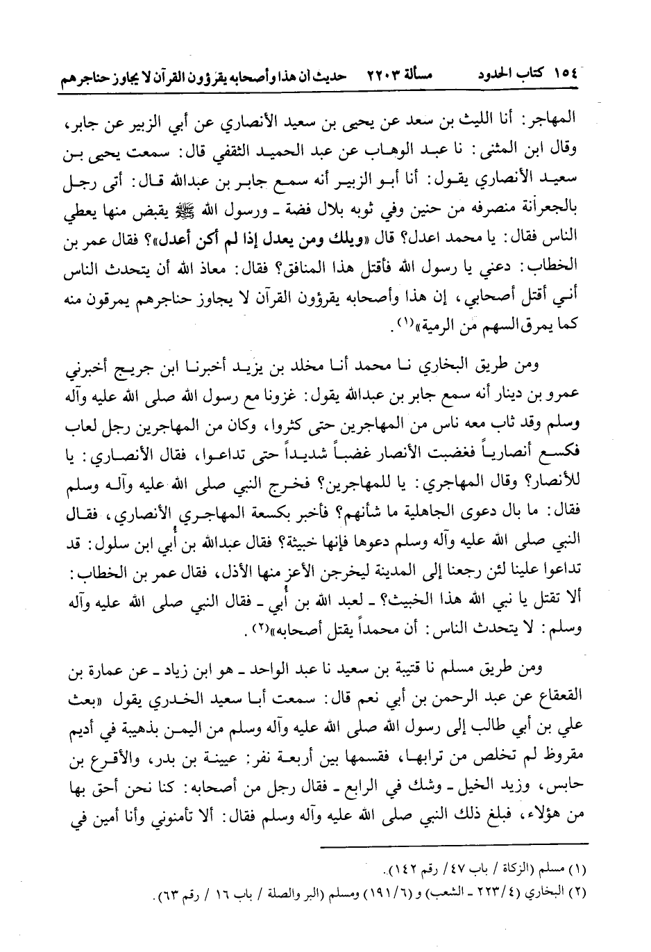 أَنَا اللَّيْثُ بْنُ سَعْدٍ عَنْ يَحْيَى بْنِ سَعِيدٍ الْأَنْصَارِيِّ عَنْ أَبِي الزُّبَيْرِ عَنْ جَابِرٍ، وَقَالَ ابْنُ الْمُثَنَّى: نا عَبْدُ الْوَهَّابِ عَنْ عَبْدِ الْحَمِيدِ الثَّقَفِيِّ قَالَ: سَمِعْت يَحْيَى بْنَ سَعِيدٍ الْأَنْصَارِيَّ يَقُولُ: أَنَا أَبُو الزُّبَيْرِ أَنَّهُ سَمِعَ جَابِرَ بْنَ عَبْدِ اللَّهِ قَالَ: «أَتَى رَجُلٌ بِالْجِعْرَانَةِ مُنْصَرَفَهُ مِنْ حُنَيْنٍ وَفِي ثَوْبِ بِلَالٍ فِضَّةٌ - وَرَسُولُ اللَّهِ - صَلَّى اللَّهُ عَلَيْهِ وَسَلَّمَ - يَقْبِضُ مِنْهَا يُعْطِي النَّاسَ فَقَالَ: يَا مُحَمَّدُ اعْدِلْ؟ قَالَ وَيْلَكَ وَمَنْ يَعْدِلُ إذَا لَمْ أَكُنْ أَعْدِلُ؟ فَقَالَ عُمَرُ بْنُ الْخَطَّابِ: دَعْنِي يَا رَسُولَ اللَّهِ فَأَقْتُلَ هَذَا الْمُنَافِقَ؟ فَقَالَ: مَعَاذَ اللَّهِ أَنْ يَتَحَدَّثَ النَّاسُ أَنِّي أَقْتُلُ أَصْحَابِي، إنَّ هَذَا وَأَصْحَابَهُ يَقْرَءُونَ الْقُرْآنَ لَا يُجَاوِزُ حَنَاجِرَهُمْ يَمْرُقُونَ مِنْهُ كَمَا يَمْرُقُ السَّهْمُ مِنْ الرَّمِيَّةِ» .