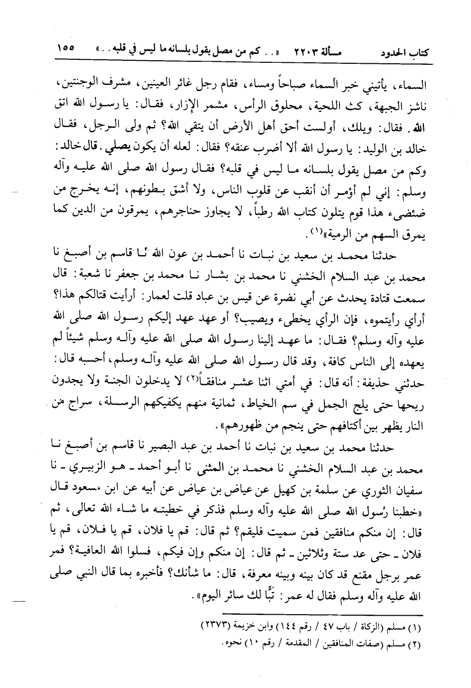 حَدَّثَنَا مُحَمَّدُ بْنُ سَعِيدِ بْنِ نَبَاتٍ نا أَحْمَدُ بْنُ عَبْدِ الْبَصِيرِ نا قَاسِمُ بْنُ أَصْبَغَ نا مُحَمَّدُ بْنُ عَبْدِ السَّلَامِ الْخُشَنِيُّ نا مُحَمَّدُ بْنُ الْمُثَنَّى نا أَبُو أَحْمَدَ - هُوَ الزُّبَيْرِيُّ - نا سُفْيَانُ الثَّوْرِيُّ عَنْ سَلَمَةَ بْنِ كُهَيْلٍ عَنْ عِيَاضِ بْنِ عِيَاضٍ أَبِيهِ عَنْ ابْنِ مَسْعُودٍ قَالَ «خَطَبَنَا رَسُولُ اللَّهِ - صَلَّى اللَّهُ عَلَيْهِ وَآلِهِ وَسَلَّمَ - فَذَكَرَ فِي خُطْبَتِهِ مَا شَاءَ اللَّهُ تَعَالَى، ثُمَّ قَالَ: إنَّ مِنْكُمْ مُنَافِقِينَ فَمَنْ سَمَّيْتُ فَلْيَقُمْ؟ ثُمَّ قَالَ: قُمْ يَا فُلَانُ، قُمْ يَا فُلَانُ، قُمْ يَا فُلَانُ - حَتَّى عَدَّ سِتَّةً وَثَلَاثِينَ - ثُمَّ قَالَ: إنَّ مِنْكُمْ وَإِنَّ فِيكُمْ، فَسَلُوا اللَّهَ الْعَافِيَةَ؟ فَمَرَّ عُمَرُ بِرَجُلٍ مُقَنَّعٍ قَدْ كَانَ بَيْنَهُ وَبَيْنَهُ مَعْرِفَةٌ، قَالَ: مَا شَأْنُكَ؟ فَأَخْبَرَهُ بِمَا قَالَ النَّبِيُّ - صَلَّى اللَّهُ عَلَيْهِ وَآلِهِ وَسَلَّمَ - فَقَالَ لَهُ عُمَرُ: تَبًّا لَكَ سَائِرَ الْيَوْمِ» .
