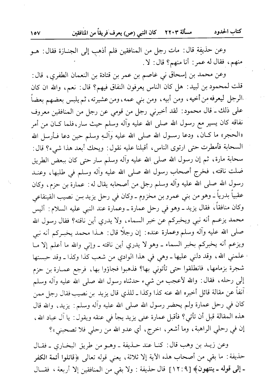 وَعَنْ مُحَمَّدِ بْنِ إِسْحَاقَ ثَنْي «عَاصِمُ بْنُ عُمَرَ بْنِ قَتَادَةَ بْنِ النُّعْمَانِ الظَّفَرِيُّ، قَالَ: قُلْت لِمَحْمُودِ بْنِ لَبِيدٍ: هَلْ كَانَ النَّاسُ يَعْرِفُونَ النِّفَاقَ فِيهِمْ؟ قَالَ: نَعَمْ، وَاَللَّهِ إنْ كَانَ الرَّجُلُ لَيَعْرِفُهُ مِنْ أَخِيهِ، وَمِنْ أَبِيهِ، وَمِنْ بَنِي عَمِّهِ، وَمِنْ عَشِيرَتِهِ، ثُمَّ يُلْبِسُ بَعْضَهُمْ بَعْضًا عَلَى ذَلِكَ - قَالَ مَحْمُودٌ: لَقَدْ أَخْبَرَنِي رَجُلٌ مِنْ قَوْمِي عَنْ رَجُلٍ مِنْ الْمُنَافِقِينَ مَعْرُوفٍ نِفَاقُهُ كَانَ يَسِيرُ مَعَ رَسُولِ اللَّهِ - صَلَّى اللَّهُ عَلَيْهِ وَآلِهِ وَسَلَّمَ - حَيْثُ سَارَ، فَلَمَّا كَانَ مِنْ أَمْرِ الْحَجَرِ مَا كَانَ، وَدَعَا رَسُولُ اللَّهِ - صَلَّى اللَّهُ عَلَيْهِ وَآلِهِ وَسَلَّمَ - حِينَ دَعَا فَأَرْسَلَ اللَّهُ السَّحَابَةَ فَأَمْطَرَتْ حَتَّى ارْتَوَى النَّاسُ، أَقْبَلْنَا عَلَيْهِ نَقُولُ: وَيْحُكَ أَبَعْدَ هَذَا شَيْءٌ؟ قَالَ: سَحَابَةٌ مَارَّةٌ، ثُمَّ إنَّ رَسُولَ اللَّهِ - صَلَّى اللَّهُ عَلَيْهِ وَآلِهِ وَسَلَّمَ - سَارَ حَتَّى كَانَ بِبَعْضِ الطَّرِيقِ ضَلَّتْ نَاقَتُهُ، فَخَرَجَ أَصْحَابُ رَسُولِ اللَّهِ - صَلَّى اللَّهُ عَلَيْهِ وَآلِهِ وَسَلَّمَ - فِي طَلَبِهَا، وَعِنْدَ رَسُولِ اللَّهِ - صَلَّى اللَّهُ عَلَيْهِ وَآلِهِ وَسَلَّمَ - رَجُلٌ مِنْ أَصْحَابِهِ يُقَالُ لَهُ: عُمَارَةُ بْنُ حَزْمٍ، وَكَانَ عَقَبِيًّا بَدْرِيًّا - وَهُوَ مِنْ بَنِي عَمْرِو بْنِ مَخْزُومٍ - وَكَانَ فِي رَحْلِ يَزِيدَ بْنِ نَصِيبٍ الْقَيْنُقَاعِيِّ وَكَانَ مُنَافِقًا، فَقَالَ يَزِيدُ - وَهُوَ فِي رَحْلِ عُمَارَةَ - وَعُمَارَةُ عِنْدَ النَّبِيِّ - عَلَيْهِ السَّلَامُ -: أَلَيْسَ مُحَمَّدٌ يَزْعُمُ أَنَّهُ نَبِيٌّ وَيُخْبِرُكُمْ عَنْ خَبَرِ السَّمَاءِ، وَلَا يَدْرِي أَيْنَ نَاقَتُهُ؟ فَقَالَ رَسُولُ اللَّهِ - صَلَّى اللَّهُ عَلَيْهِ وَآلِهِ وَسَلَّمَ - وَعُمَارَةُ عِنْدَهُ: إنَّ رَجُلًا قَالَ: هَذَا مُحَمَّدٌ يُخْبِرُكُمْ أَنَّهُ نَبِيٌّ وَيَزْعُمُ أَنَّهُ يُخْبِرُكُمْ بِخَبَرِ السَّمَاءِ - هُوَ لَا يَدْرِي أَيْنَ نَاقَتُهُ - وَإِنِّي وَاَللَّهِ مَا أَعْلَمُ إلَّا مَا عَلَّمَنِي اللَّهُ، وَقَدْ دَلَّنِي عَلَيْهَا - وَهِيَ فِي هَذَا الْوَادِي مِنْ شِعْبِ كَذَا وَكَذَا - وَقَدْ حَبَسَتْهَا شَجَرَةٌ بِزِمَامِهَا، فَانْطَلِقُوا حَتَّى تَأْتُونِي بِهَا؟ فَذَهَبُوا فَجَاءُوا بِهَا، فَرَجَعَ عُمَارَةُ بْنُ حَزْمٍ إلَى رَحْلِهِ، فَقَالَ: وَاَللَّهِ لَأَعْجَبُ شَيْءٍ حَدَّثْنَاهُ رَسُولَ اللَّهِ - صَلَّى اللَّهُ عَلَيْهِ وَآلِهِ وَسَلَّمَ - آنِفًا عَنْ مَقَالَةِ قَائِلٍ أَخْبَرَهُ اللَّهُ عَنْهُ كَذَا وَكَذَا - لِلَّذِي قَالَ يَزِيدُ بْنُ نَصِيبٍ فَقَالَ رَجُلٌ مِمَّنْ كَانَ فِي رَحْلِ عُمَارَةَ وَلَمْ يَحْضُرْ رَسُولَ اللَّهِ - صَلَّى اللَّهُ عَلَيْهِ وَآلِهِ وَسَلَّمَ -: يَزِيدُ، وَاَللَّهِ قَالَ هَذِهِ الْمَقَالَةَ قَبْلَ أَنْ تَأْتِيَ؟ فَأَقْبَلَ عُمَارَةُ عَلَى يَزِيدَ يَجَأُ فِي عُنُقِهِ وَيَقُولُ: يَا آلَ عِبَادِ اللَّهِ، إنَّ فِي رَحْلِي الرَّاهِبَةَ، وَمَا أَشْعُرُ، اُخْرُجْ، أَيْ عَدُوَّ اللَّهِ مِنْ رَحْلِي فَلَا تَصْحَبْنِي» ؟ وَعَنْ زَيْدِ بْنِ وَهْبٍ قَالَ: كُنَّا عِنْدَ حُذَيْفَةَ - وَهُوَ مِنْ طَرِيقِ الْبُخَارِيِّ - فَقَالَ حُذَيْفَةُ: مَا بَقِيَ مِنْ أَصْحَابِ هَذِهِ الْآيَةِ إلَّا ثَلَاثَةٌ، يَعْنِي قَوْله تَعَالَى {فَقَاتِلُوا أَئِمَّةَ الْكُفْرِ} [التوبة: 12] إلَى قَوْلِهِ {يَنْتَهُونَ} [التوبة: 12] قَالَ حُذَيْفَةُ: وَلَا بَقِيَ مِنْ الْمُنَافِقِينَ إلَّا أَرْبَعَةٌ، فَقَالَ