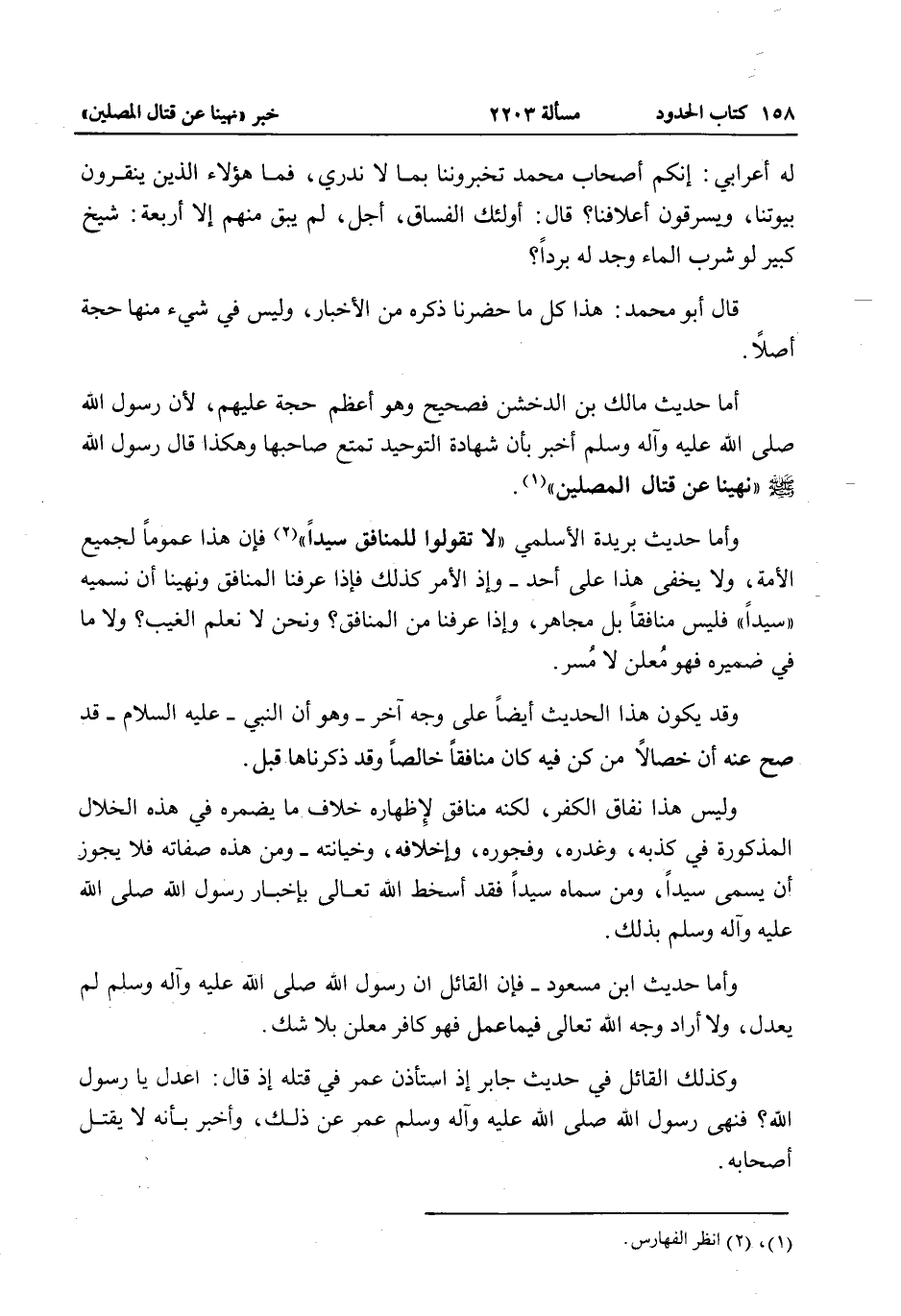 أَمَّا حَدِيثُ مَالِكِ بْنِ الدِّخْشَنِ فَصَحِيحٌ وَهُوَ أَعْظَمُ حُجَّةً عَلَيْهِمْ، لِأَنَّ رَسُولَ اللَّهِ - صَلَّى اللَّهُ عَلَيْهِ وَآلِهِ وَسَلَّمَ - أَخْبَرَ بِأَنَّ شَهَادَةَ التَّوْحِيدِ تَمْنَعُ صَاحِبَهَا وَهَكَذَا قَالَ رَسُولُ اللَّهِ - صَلَّى اللَّهُ عَلَيْهِ وَسَلَّمَ - «نُهِينَا عَنْ قِتَالِ الْمُصَلُّونً» .