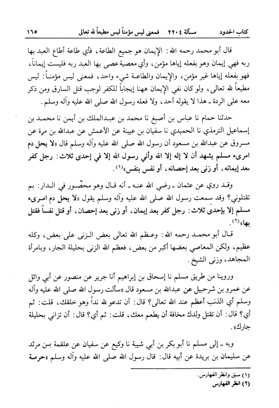 حَدَّثَنَا حُمَامٌ نا عَبَّاسُ بْنُ أَصْبَغَ نا مُحَمَّدُ بْنُ عَبْدِ الْمَلِكِ بْنِ أَيْمَنَ نا مُحَمَّدُ بْنُ إسْمَاعِيلَ التِّرْمِذِيُّ نا الْحُمَيْدِيُّ نا سُفْيَانُ بْنُ عُيَيْنَةَ عَنْ الْأَعْمَشِ عَنْ عَبْدِ اللَّهِ بْنِ مُرَّةَ عَنْ مَسْرُوقٍ عَنْ عَبْدِ اللَّهِ بْنِ مَسْعُودٍ أَنَّ رَسُولَ اللَّهِ - صَلَّى اللَّهُ عَلَيْهِ وَآلِهِ وَسَلَّمَ - قَالَ «لَا يَحِلُّ دَمُ امْرِئٍ مُسْلِمٍ يَشْهَدُ أَنْ لَا إلَهَ إلَّا اللَّهُ وَأَنِّي رَسُولُ اللَّهِ إلَّا فِي إحْدَى ثَلَاثٍ: رَجُلٌ كَفَرَ بَعْدَ إيمَانِهِ، أَوْ زَنَى بَعْدَ إحْصَانِهِ، أَوْ نَفْسٌ بِنَفْسٍ» .