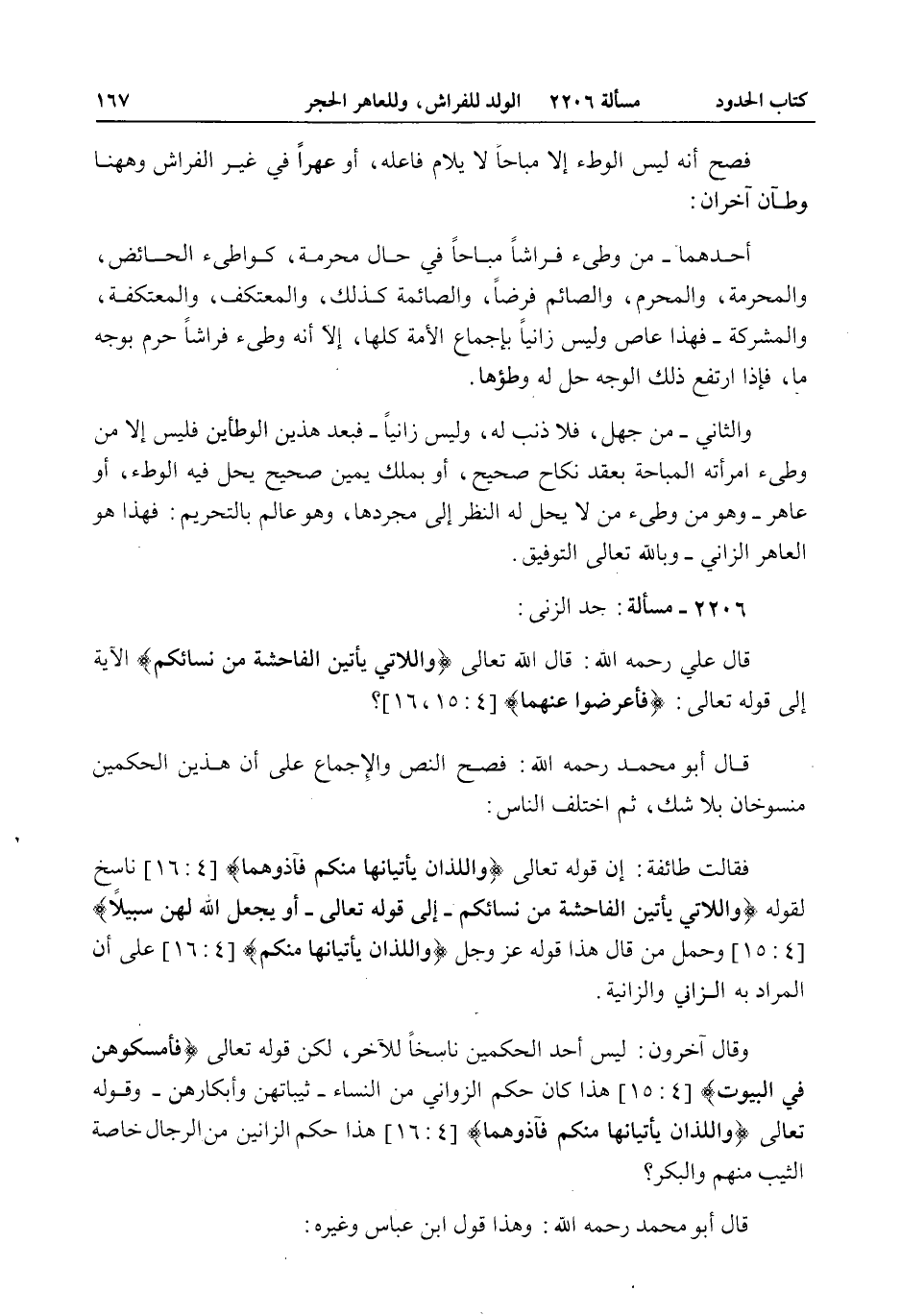 2206 - مَسْأَلَةٌ: حَدُّ الزِّنَى: قَالَ عَلِيٌّ - رَحِمَهُ اللَّهُ -: قَالَ اللَّهُ تَعَالَى {وَاللاتِي يَأْتِينَ الْفَاحِشَةَ مِنْ نِسَائِكُمْ} [النساء: 15] الْآيَةَ إلَى قَوْله تَعَالَى: {فَأَعْرِضُوا عَنْهُمَا} [النساء: 16] ؟ قَالَ أَبُو مُحَمَّدٍ - رَحِمَهُ اللَّهُ -: فَصَحَّ النَّصُّ وَالْإِجْمَاعُ عَلَى أَنَّ هَذَيْنِ الْحُكْمَيْنِ مَنْسُوخَانِ بِلَا شَكٍّ، ثُمَّ اخْتَلَفَ النَّاسُ: فَقَالَتْ طَائِفَةٌ: إنَّ قَوْله تَعَالَى {وَاللَّذَانِ يَأْتِيَانِهَا مِنْكُمْ فَآذُوهُمَا} [النساء: 16] نَاسِخٌ لِقَوْلِهِ {وَاللاتِي يَأْتِينَ الْفَاحِشَةَ مِنْ نِسَائِكُمْ} [النساء: 15] إلَى قَوْله تَعَالَى {أَوْ يَجْعَلَ اللَّهُ لَهُنَّ سَبِيلا} [النساء: 15] وَحَمَلَ مَنْ قَالَ هَذَا قَوْلَهُ عَزَّ وَجَلَّ {وَاللَّذَانِ يَأْتِيَانِهَا مِنْكُمْ} [النساء: 16] عَلَى أَنَّ الْمُرَادَ بِهِ الزَّانِي وَالزَّانِيَةُ.
