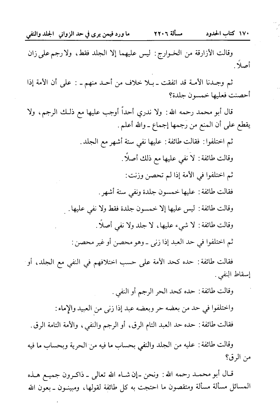 وَقَالَتْ طَائِفَةٌ: عَلَيْهِ مِنْ الْجَلْدِ وَالنَّفْيِ بِحِسَابِ مَا فِيهِ مِنْ الْحُرِّيَّةِ وَبِحِسَابِ مَا فِيهِ مِنْ الرِّقِّ؟ قَالَ أَبُو مُحَمَّدٍ - رَحِمَهُ اللَّهُ -: وَنَحْنُ - إنْ شَاءَ اللَّهُ تَعَالَى - ذَاكِرُونَ جَمِيعَ هَذِهِ الْمَسَائِلِ مَسْأَلَةً مَسْأَلَةً وَمُتَقَصُّونَ مَا احْتَجَّتْ بِهِ كُلُّ طَائِفَةٍ لِقَوْلِهَا، وَمُبَيِّنُونَ - بِعَوْنِ اللَّهِ