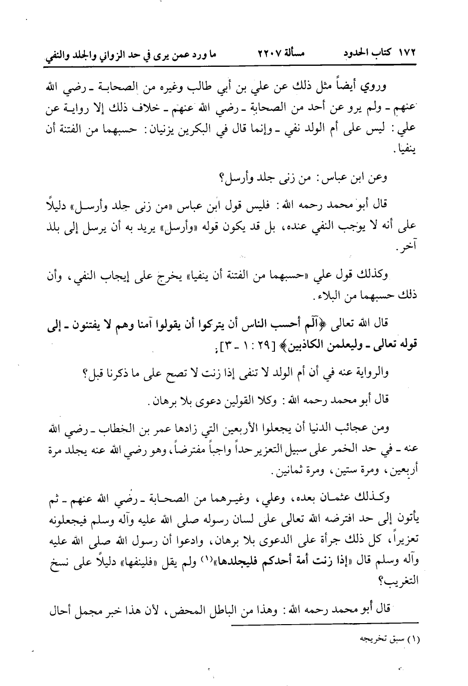 قَالَ اللَّهُ تَعَالَى {الم - أَحَسِبَ النَّاسُ أَنْ يُتْرَكُوا أَنْ يَقُولُوا آمَنَّا وَهُمْ لا يُفْتَنُونَ} [العنكبوت: 1 - 2] إلَى قَوْله تَعَالَى {وَلَيَعْلَمَنَّ الْكَاذِبِينَ} [العنكبوت: 3] وَالرِّوَايَةُ عَنْهُ فِي أَنَّ أُمَّ الْوَلَدِ لَا تُنْفَى إذَا زَنَتْ لَا تَصِحُّ عَلَى مَا ذَكَرْنَا قَبْلُ؟ قَالَ أَبُو مُحَمَّدٍ - رَحِمَهُ اللَّهُ -: وَكِلَا الْقَوْلَيْنِ دَعْوَى بِلَا بُرْهَانٍ.