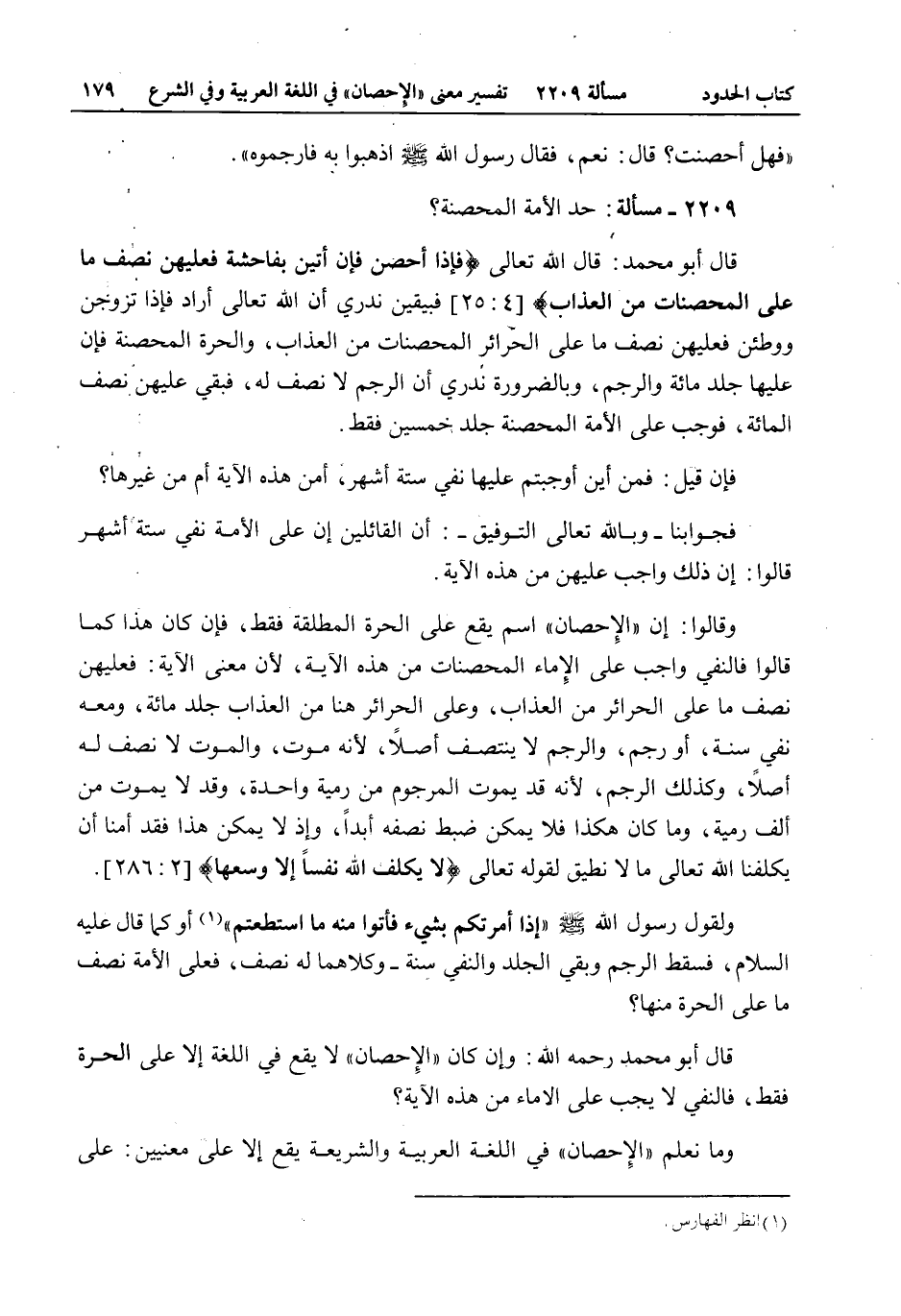2209 - مَسْأَلَةٌ: حَدُّ الْأَمَةِ الْمُحْصَنَةِ؟ قَالَ أَبُو مُحَمَّدٍ: قَالَ اللَّهُ تَعَالَى {فَإِذَا أُحْصِنَّ فَإِنْ أَتَيْنَ بِفَاحِشَةٍ فَعَلَيْهِنَّ نِصْفُ مَا عَلَى الْمُحْصَنَاتِ مِنَ الْعَذَابِ} [النساء: 25] فَبِيَقِينٍ نَدْرِي أَنَّ اللَّهَ تَعَالَى أَرَادَ فَإِذَا تَزَوَّجْنَ وَوُطِئْنَ فَعَلَيْهِنَّ نِصْفُ مَا عَلَى الْحَرَائِرِ الْمُحْصَنَاتِ مِنْ الْعَذَابِ، وَالْحُرَّةُ الْمُحْصَنَةُ فَإِنَّ عَلَيْهَا جِلْدَ مِائَةٍ وَالرَّجْمَ، وَبِالضَّرُورَةِ نَدْرِي أَنَّ الرَّجْمَ لَا نِصْفَ لَهُ، فَبَقِيَ عَلَيْهِنَّ نِصْفُ الْمِائَةِ، فَوَجَبَ عَلَى الْأَمَةِ الْمُحْصَنَةِ جَلْدُ خَمْسِينَ فَقَطْ.