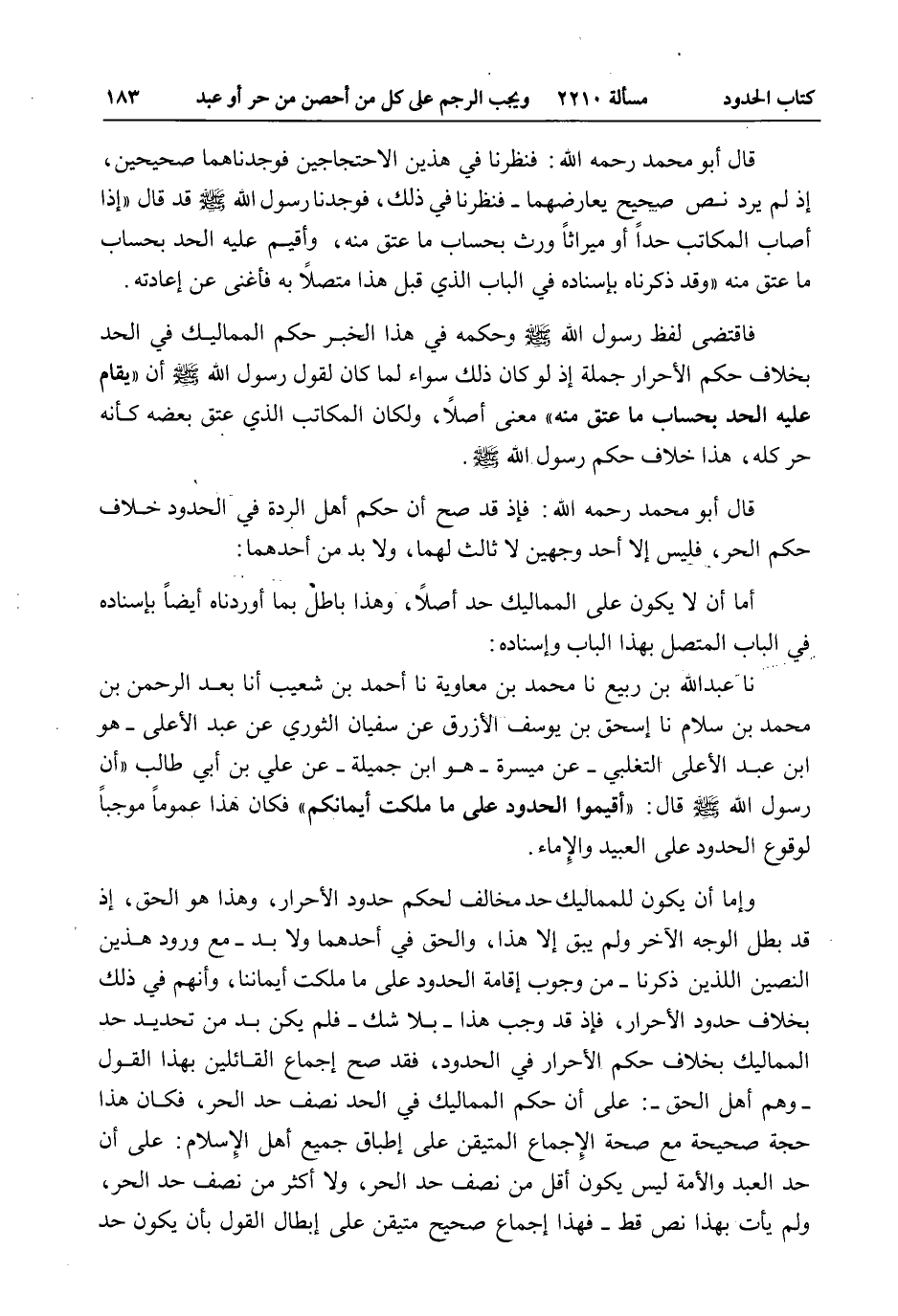 قَالَ أَبُو مُحَمَّدٍ - رَحِمَهُ اللَّهُ -: فَإِذْ قَدْ صَحَّ أَنَّ حُكْمَ أَهْلِ الرِّدَّةِ فِي الْحُدُودِ خِلَافُ حُكْمِ الْحُرِّ، فَلَيْسَ إلَّا أَحَدُ وَجْهَيْنِ لَا ثَالِثَ لَهُمَا، وَلَا بُدَّ مِنْ أَحَدِهِمَا: إمَّا أَنْ لَا يَكُونَ عَلَى الْمَمَالِيكِ حَدٌّ أَصْلًا، وَهَذَا بَاطِلٌ بِمَا أَوْرَدْنَاهُ أَيْضًا بِإِسْنَادِهِ فِي الْبَابِ الْمُتَّصِلِ بِهَذَا الْبَابِ وَإِسْنَادُهُ: نا عَبْدُ اللَّهِ بْنُ رَبِيعٍ نا مُحَمَّدُ بْنُ مُعَاوِيَةَ نا أَحْمَدُ بْنُ شُعَيْبٍ نا عَبْدُ الرَّحْمَنِ بْنُ مُحَمَّدِ بْنِ سَلَامٍ نا إِسْحَاقُ بْنُ يُوسُفَ الْأَزْرَقُ عَنْ سُفْيَانَ الثَّوْرِيِّ عَنْ عَبْدِ الْأَعْلَى - هُوَ ابْنُ عَبْدِ الْأَعْلَى التَّغْلِبِيَّ - عَنْ مَيْسَرَةَ - هُوَ ابْنُ جَمِيلَةَ - عَنْ عَلِيِّ بْنِ أَبِي طَالِبٍ " أَنَّ رَسُولَ اللَّهِ - صَلَّى اللَّهُ عَلَيْهِ وَسَلَّمَ - قَالَ: «أَقِيمُوا الْحُدُودَ عَلَى مَا مَلَكَتْ أَيْمَانُكُمْ» فَكَانَ هَذَا عُمُومًا مُوجِبًا لِوُقُوعِ الْحُدُودِ عَلَى الْعَبِيدِ وَالْإِمَاءِ.