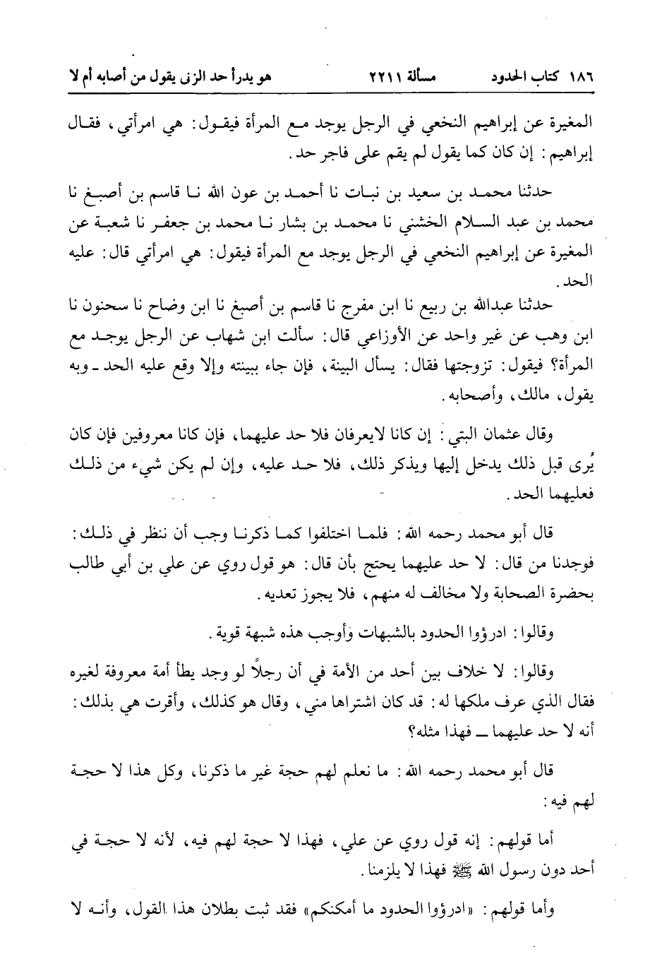 حَدَّثَنَا مُحَمَّدُ بْنُ سَعِيدِ بْنِ نَبَاتٍ نا أَحْمَدُ بْنُ عَوْنِ اللَّهِ نا قَاسِمُ بْنُ أَصْبَغَ نا مُحَمَّدُ بْنُ عَبْدِ السَّلَامِ الْخُشَنِيُّ نا مُحَمَّدُ بْنُ بَشَّارٍ نا مُحَمَّدُ بْنُ جَعْفَرٍ نا شُعْبَةُ عَنْ الْمُغِيرَةِ عَنْ إبْرَاهِيمَ النَّخَعِيِّ فِي الرَّجُلِ يُوجَدُ مَعَ الْمَرْأَةِ فَيَقُولُ: هِيَ امْرَأَتِي قَالَ: عَلَيْهِ الْحَدُّ.