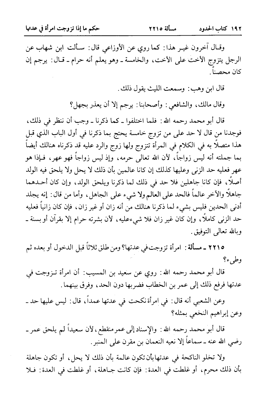 2215 - مَسْأَلَةٌ: امْرَأَةٌ تَزَوَّجَتْ فِي عِدَّتِهَا؟ وَمَنْ طَلَّقَ ثَلَاثًا قَبْلَ الدُّخُولِ أَوْ بَعْدِهِ ثُمَّ وَطِئَ؟ قَالَ أَبُو مُحَمَّدٍ - رَحِمَهُ اللَّهُ -: رُوِيَ عَنْ سَعِيدِ بْنِ الْمُسَيِّبِ: أَنَّ امْرَأَةً تَزَوَّجَتْ فِي عِدَّتِهَا فَرُفِعَ ذَلِكَ إلَى عُمَرَ بْنِ الْخَطَّابِ فَضَرَبَهَا دُونَ الْحَدِّ، وَفَرَّقَ بَيْنَهُمَا.