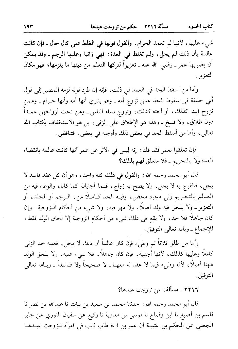 2216 - مَسْأَلَةٌ: مَنْ تَزَوَّجَتْ عَبْدَهَا؟ قَالَ أَبُو مُحَمَّدٍ - رَحِمَهُ اللَّهُ -: حَدَّثَنَا مُحَمَّدُ بْنُ سَعِيدِ بْنِ نَبَاتٍ نا عَبْدُ اللَّهِ بْنُ نَصْرٍ نا قَاسِمُ بْنُ أَصْبَغَ نا ابْنُ وَضَّاحٍ نا مُوسَى بْنُ مُعَاوِيَةَ نا وَكِيعٌ عَنْ سُفْيَانَ الثَّوْرِيِّ عَنْ جَابِرٍ الْجُعْفِيِّ عَنْ الْحَكَمِ بْنِ عُتَيْبَةَ أَنَّ عُمَرَ بْنَ الْخَطَّابِ كَتَبَ فِي امْرَأَةٍ تَزَوَّجَتْ عَبْدَهَا