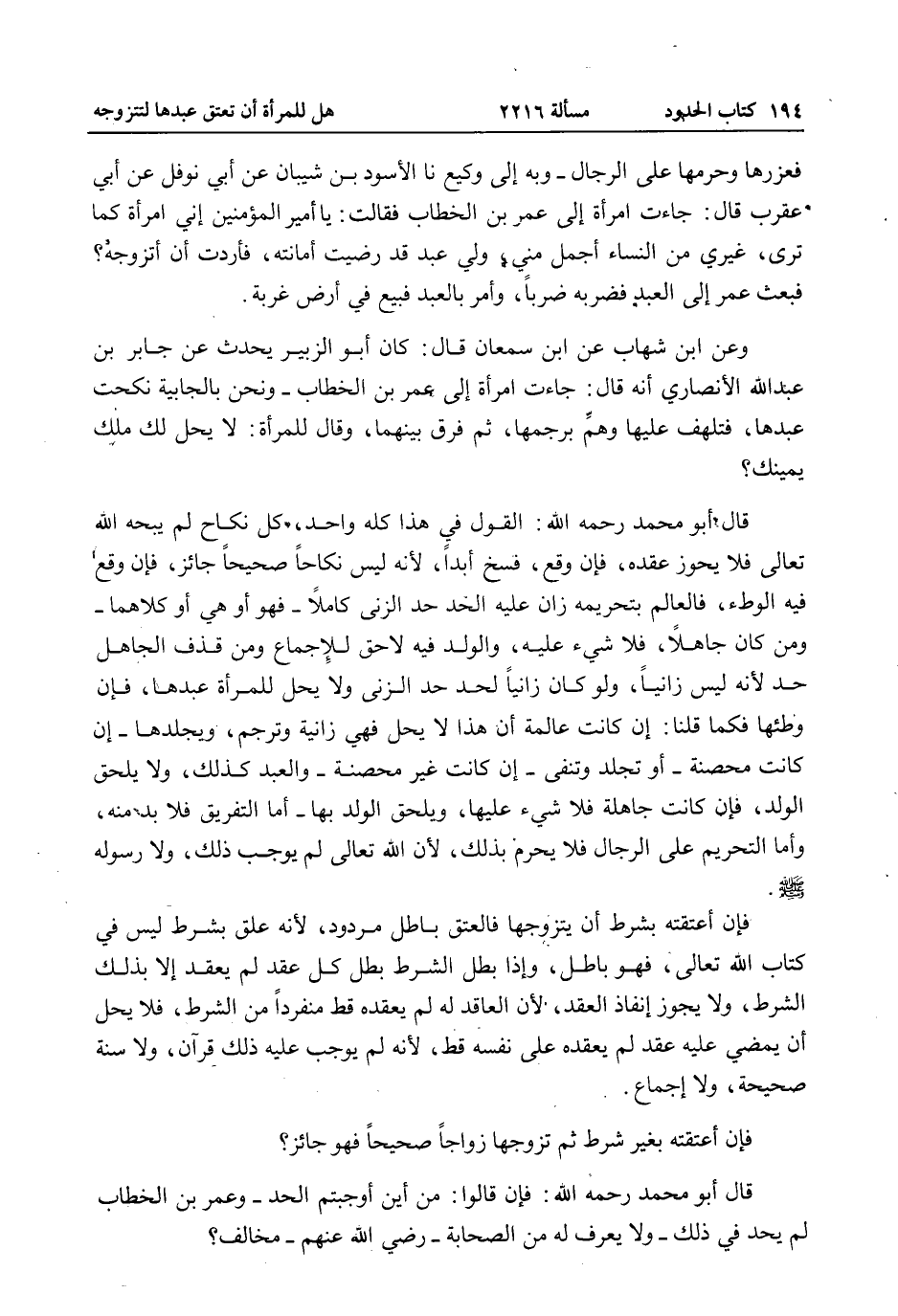 فَإِنْ أَعْتَقَتْهُ بِغَيْرِ شَرْطٍ ثُمَّ تَزَوَّجَهَا زَوَاجًا صَحِيحًا فَهُوَ جَائِزٌ؟ قَالَ أَبُو مُحَمَّدٍ - رَحِمَهُ اللَّهُ -: فَإِنْ قَالُوا: مِنْ أَيْنَ أَوْجَبْتُمْ الْحَدَّ - وَعُمَرُ بْنُ الْخَطَّابِ لَمْ يَحُدَّ فِي ذَلِكَ - وَلَا يُعْرَفُ لَهُ مِنْ الصَّحَابَةِ - رَضِيَ اللَّهُ عَنْهُمْ - مُخَالِفٌ؟