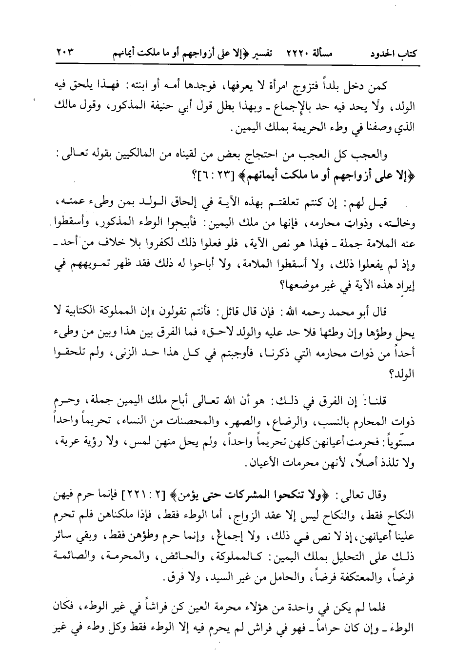 وَالْعَجَبُ كُلُّ الْعَجَبِ مِنْ احْتِجَاجِ بَعْضِ مَنْ لَقِينَاهُ مِنْ الْمَالِكِيِّينَ بِقَوْلِهِ تَعَالَى: {إِلا عَلَى أَزْوَاجِهِمْ أوْ مَا مَلَكَتْ أَيْمَانُهُمْ} [المؤمنون: 6] ؟ قِيلَ لَهُمْ: إنْ كُنْتُمْ تَعَلَّقْتُمْ بِهَذِهِ الْآيَةِ فِي إلْحَاقِ الْوَلَدِ بِمَنْ وَطِئَ عَمَّتَهُ، وَخَالَتَهُ، وَذَوَاتَ مَحَارِمِهِ، فَإِنَّهَا مِنْ مِلْكِ الْيَمِينِ: فَأَبِيحُوا الْوَطْءَ الْمَذْكُورَ، وَأَسْقِطُوا عَنْهُ الْمَلَامَةَ جُمْلَةً - فَهَذَا هُوَ نَصُّ الْآيَةِ، فَلَوْ فَعَلُوا ذَلِكَ لَكَفَرُوا بِلَا خِلَافٍ مِنْ أَحَدٍ - وَإِذْ لَمْ يَفْعَلُوا ذَلِكَ، وَلَا أَسْقَطُوا الْمَلَامَةَ، وَلَا أَبَاحُوا لَهُ ذَلِكَ قَدْ ظَهَرَ تَمْوِيهُهُمْ فِي إيرَادِ هَذِهِ الْآيَةِ فِي غَيْرِ مَوْضِعِهَا؟ قَالَ أَبُو مُحَمَّدٍ - رَحِمَهُ اللَّهُ -: فَإِنْ قَالَ قَائِلٌ: فَأَنْتُمْ تَقُولُونَ " إنَّ الْمَمْلُوكَةَ الْكِتَابِيَّةَ لَا يَحِلُّ وَطْؤُهَا وَإِنْ وَطِئَهَا فَلَا حَدَّ عَلَيْهِ وَالْوَلَدُ لَاحِقٌ " فَمَا الْفَرْقُ بَيْنَ هَذَا وَبَيْنَ مَنْ وَطِئَ أَحَدًا مِنْ ذَوَاتِ مَحَارِمِهِ الَّتِي ذَكَرْنَا فَأَوْجَبْتُمْ فِي كُلِّ هَذَا حَدَّ الزِّنَى، وَلَمْ تُلْحِقُوا الْوَلَدَ؟