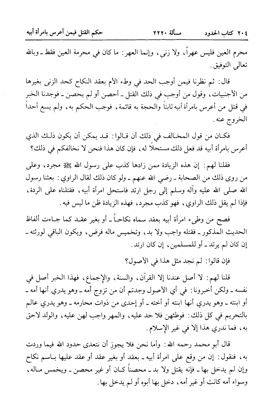 فَإِنْ قَالُوا: لَمْ نَجِدْ مِثْلَ هَذَا فِي الْأُصُولِ؟ قُلْنَا لَهُمْ: لَا أَصْلَ عِنْدَنَا إلَّا الْقُرْآنُ، وَالسُّنَّةُ، وَالْإِجْمَاعُ، فَهَذَا الْخَبَرُ أَصْلٌ فِي نَفْسِهِ - وَلَكِنْ أَخْبِرُونَا: فِي أَيِّ الْأُصُولِ وَجَدْتُمْ أَنَّ مَنْ تَزَوَّجَ أُمَّهُ - وَهُوَ يَدْرِي أَنَّهَا أُمُّهُ - أَوْ ابْنَتُهُ - وَهُوَ يَدْرِي أَنَّهَا ابْنَتُهُ أَوْ أُخْتُهُ - أَوْ إحْدَى ذَوَاتِ مَحَارِمِهِ - وَهُوَ يَدْرِي عَالِمٌ بِالتَّحْرِيمِ فِي كُلِّ ذَلِكَ: فَوَطِئَهُنَّ فَلَا حَدَّ عَلَيْهِ، وَالْمَهْرُ وَاجِبٌ لَهُنَّ عَلَيْهِ، وَالْوَلَدُ لَاحِقٌ بِهِ، فَمَا نَدْرِي هَذَا إلَّا فِي غَيْرِ الْإِسْلَامِ. قَالَ أَبُو مُحَمَّدٍ - رَحِمَهُ اللَّهُ -: وَأَمَّا نَحْنُ فَلَا يَجُوزُ أَنْ نَتَعَدَّى حُدُودَ اللَّهِ فِيمَا وَرَدَتْ بِهِ، فَنَقُولُ: إنَّ مَنْ وَقَعَ عَلَى امْرَأَةِ أَبِيهِ - بِعَقْدٍ أَوْ بِغَيْرِ عَقْدٍ أَوْ عَقَدَ عَلَيْهَا بِاسْمِ نِكَاحٍ وَإِنْ لَمْ يَدْخُلْ بِهَا - فَإِنَّهُ يُقْتَلُ وَلَا بُدَّ - مُحْصَنًا كَانَ أَوْ غَيْرَ مُحْصَنٍ - وَيُخَمَّسُ مَالُهُ، وَسَوَاءٌ أُمَّهُ كَانَتْ أَوْ غَيْرَ أُمِّهِ، دَخَلَ بِهَا أَبُوهُ أَوْ لَمْ يَدْخُلْ بِهَا.