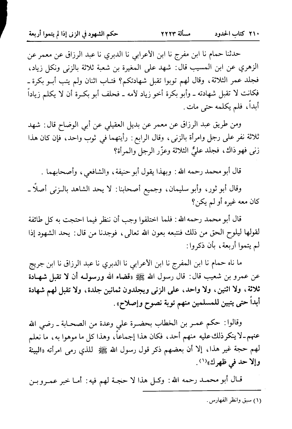 قَالَ أَبُو مُحَمَّدٍ - رَحِمَهُ اللَّهُ -: فَلَمَّا اخْتَلَفُوا وَجَبَ أَنْ نَنْظُرَ فِيمَا احْتَجَّتْ بِهِ كُلُّ طَائِفَةٍ لِقَوْلِهَا لِيَلُوحَ الْحَقُّ مِنْ ذَلِكَ فَنَتَّبِعُهُ بِعَوْنِ اللَّهِ تَعَالَى، فَوَجَدْنَا مَنْ قَالَ: يُحَدُّ الشُّهُودُ إذَا لَمْ يُتِمُّوا أَرْبَعَةً، بِأَنْ ذَكَرُوا: مَا ناه حُمَامٌ نا ابْنُ الْمُفَرِّجِ نا ابْنُ الْأَعْرَابِيِّ نا الدَّبَرِيُّ نا عَبْدُ الرَّزَّاقِ نا ابْنُ جُرَيْجٍ عَنْ عَمْرِو بْنِ شُعَيْبٍ قَالَ: قَالَ رَسُولُ اللَّهِ - صَلَّى اللَّهُ عَلَيْهِ وَسَلَّمَ - «قَضَاءُ اللَّهِ وَرَسُولِهِ أَنْ لَا تُقْبَلَ شَهَادَةُ ثَلَاثَةٍ، وَلَا اثْنَيْنِ، وَلَا وَاحِدٍ، عَلَى الزِّنَى وَيُجْلَدُونَ ثَمَانِينَ جَلْدَةً، وَلَا تُقْبَلُ لَهُمْ شَهَادَةٌ أَبَدًا حَتَّى يَتَبَيَّنَ لِلْمُسْلِمِينَ مِنْهُمْ تَوْبَةٌ نَصُوحٌ وَإِصْلَاحٌ» .