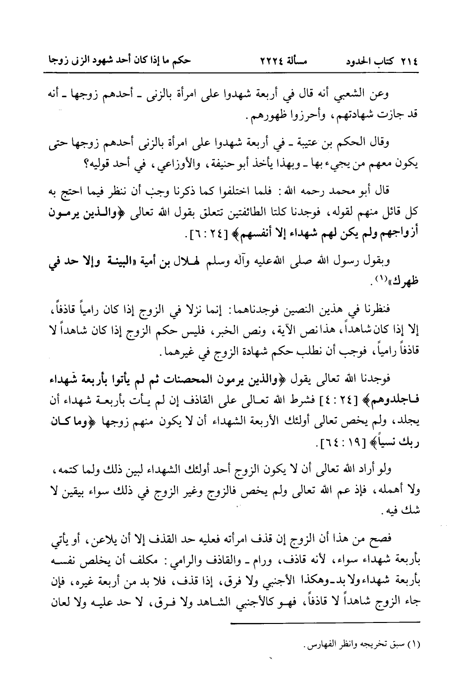 فَوَجَدْنَا اللَّهَ تَعَالَى يَقُولُ {وَالَّذِينَ يَرْمُونَ الْمُحْصَنَاتِ ثُمَّ لَمْ يَأْتُوا بِأَرْبَعَةِ شُهَدَاءَ فَاجْلِدُوهُمْ} [النور: 4] فَشَرَطَ اللَّهُ تَعَالَى عَلَى الْقَاذِفِ إنْ لَمْ يَأْتِ بِأَرْبَعَةِ شُهَدَاءَ أَنْ يُجْلَدَ، وَلَمْ يَخُصَّ تَعَالَى أُولَئِكَ الْأَرْبَعَةَ الشُّهَدَاءَ أَنْ لَا يَكُونَ مِنْهُمْ زَوْجُهَا {وَمَا كَانَ رَبُّكَ نَسِيًّا} [مريم: 64] .