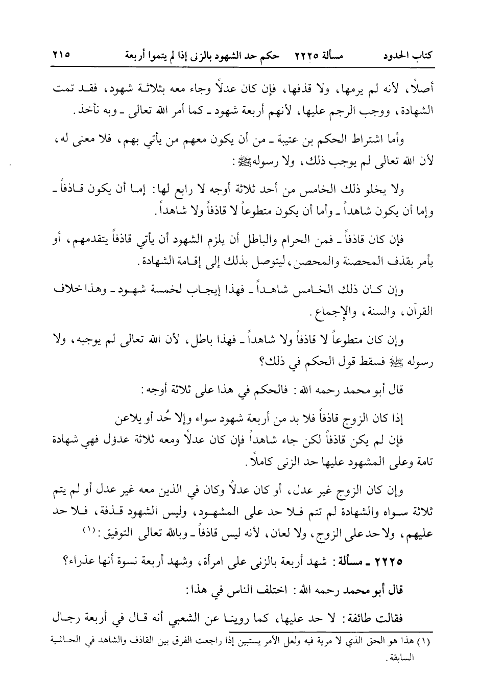 2225 - مَسْأَلَةٌ: شَهِدَ أَرْبَعَةٌ بِالزِّنَى عَلَى امْرَأَةٍ، وَشَهِدَ أَرْبَعَةُ نِسْوَةٍ أَنَّهَا عَذْرَاءُ؟ قَالَ أَبُو مُحَمَّدٍ - رَحِمَهُ اللَّهُ -: اخْتَلَفَ النَّاسُ فِي هَذَا: فَقَالَتْ طَائِفَةٌ: لَا حَدَّ عَلَيْهَا، كَمَا رُوِّينَا عَنْ الشَّعْبِيِّ أَنَّهُ قَالَ فِي أَرْبَعَةِ رِجَالٍ