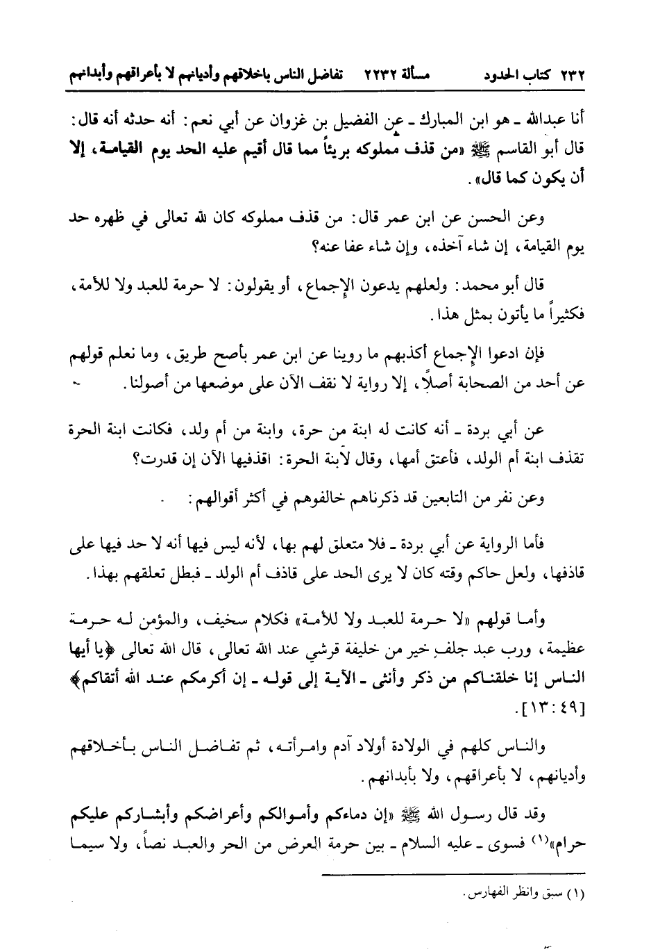 وَقَدْ قَالَ رَسُولُ اللَّهِ - صَلَّى اللَّهُ عَلَيْهِ وَسَلَّمَ - «إنَّ دِمَاءَكُمْ وَأَمْوَالَكُمْ وَأَعْرَاضَكُمْ وَأَبْشَارَكُمْ عَلَيْكُمْ حَرَامٌ» فَسَوَّى - عَلَيْهِ السَّلَامُ - بَيْنَ حُرْمَةِ الْعِرْضِ مِنْ الْحُرِّ وَالْعَبْدِ نَصًّا، وَلَا سِيَّمَا