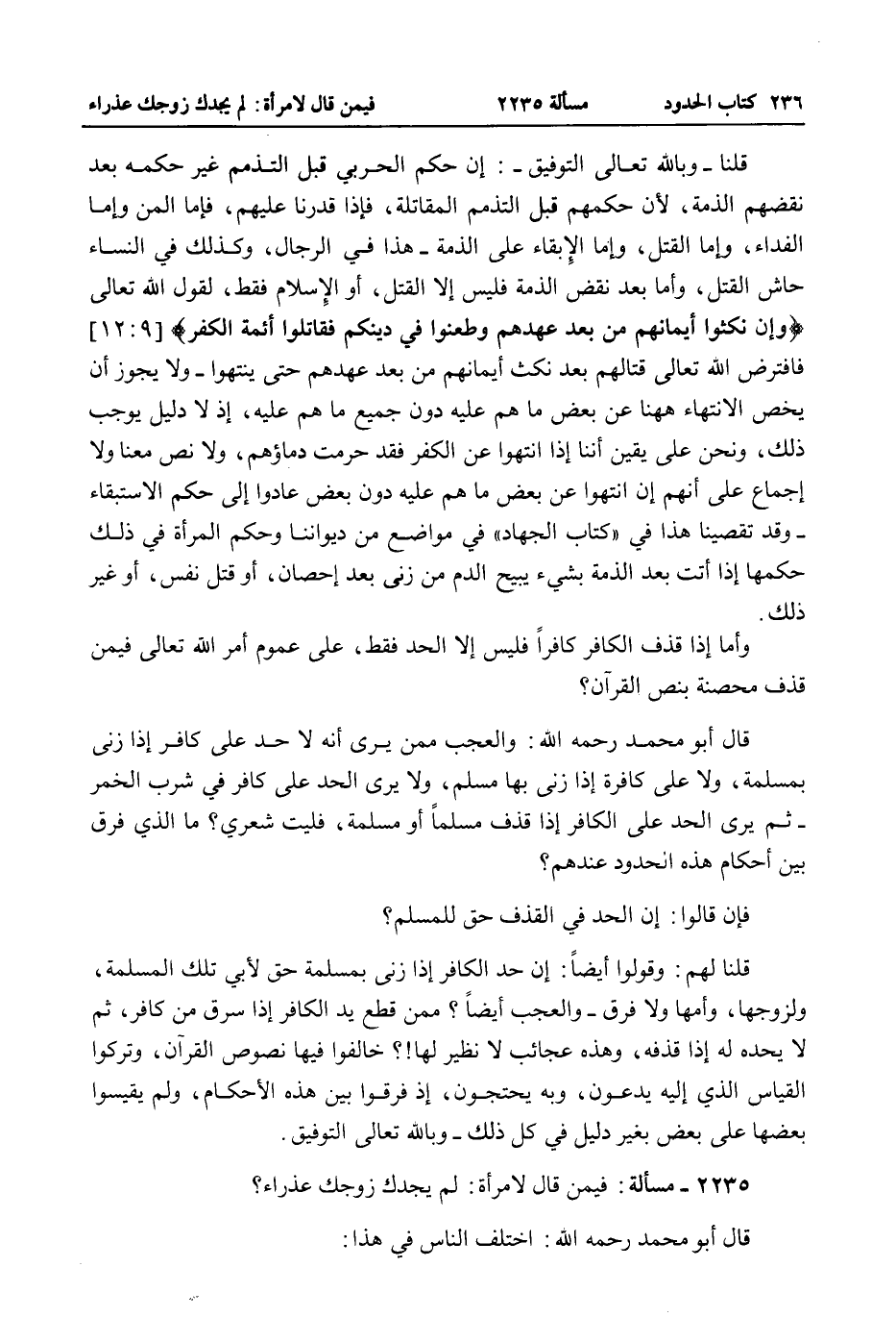 2235 - مَسْأَلَةٌ: فِيمَنْ قَالَ لِامْرَأَةٍ: لَمْ يَجِدْك زَوْجُك عَذْرَاءَ؟ قَالَ أَبُو مُحَمَّدٍ - رَحِمَهُ اللَّهُ -: اخْتَلَفَ النَّاسُ فِي هَذَا: