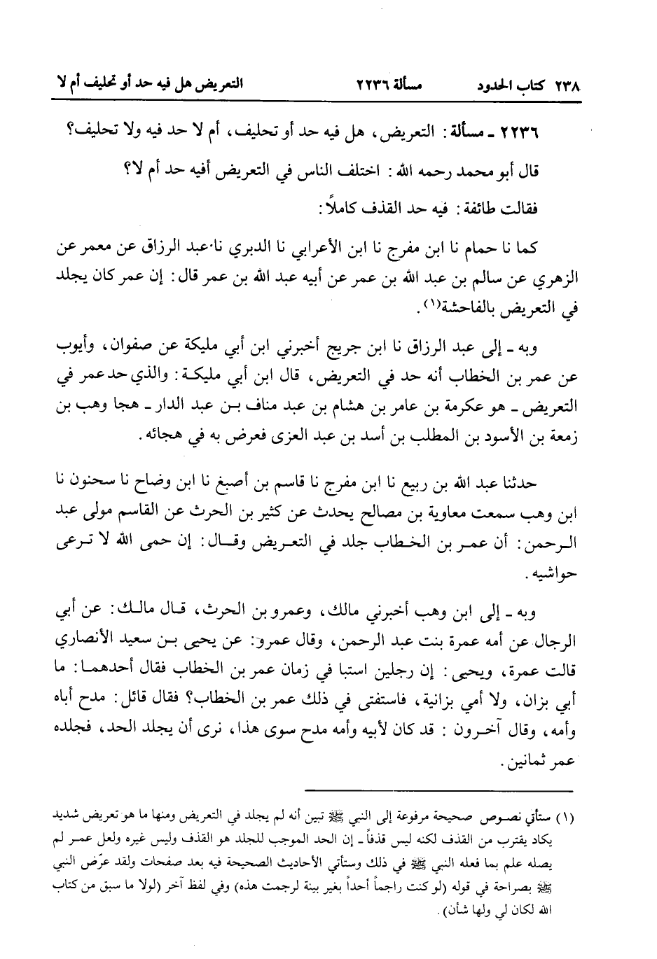 ٌ، أَمْ لَا حَدَّ فِيهِ وَلَا تَحْلِيفَ؟ قَالَ أَبُو مُحَمَّدٍ - رَحِمَهُ اللَّهُ -: اخْتَلَفَ النَّاسُ فِي التَّعْرِيضِ أَفِيه حَدٌّ أَمْ لَا؟ فَقَالَتْ طَائِفَةٌ: فِيهِ حَدُّ الْقَذْفِ كَامِلًا كَمَا نا حُمَامٌ نا ابْنُ مُفَرِّجٍ نا ابْنُ الْأَعْرَابِيِّ نا الدَّبَرِيُّ نا عَبْدُ الرَّزَّاقِ عَنْ مَعْمَرٍ عَنْ الزُّهْرِيِّ عَنْ سَالِمِ بْنِ عَبْدِ اللَّهِ بْنِ عُمَرَ عَنْ أَبِيهِ عَبْدِ اللَّهِ بْنِ عُمَرَ قَالَ: إنَّ عُمَرَ كَانَ يَجْلِدُ فِي التَّعْرِيضِ بِالْفَاحِشَةِ. وَبِهِ - إلَى عَبْدِ الرَّزَّاقِ نا ابْنُ جُرَيْجٍ أَخْبَرَنِي ابْنُ أَبِي مُلَيْكَةَ عَنْ صَفْوَانَ، وَأَيُّوبَ عَنْ عُمَرَ بْنِ الْخَطَّابِ أَنَّهُ حَدَّ فِي التَّعْرِيضِ، قَالَ ابْنُ أَبِي مُلَيْكَةَ: وَاَلَّذِي حَدَّهُ عُمَرُ فِي التَّعْرِيضِ - هُوَ عِكْرِمَةُ بْنُ عَامِرِ بْنِ هِشَامِ بْنِ عَبْدِ مَنَافِ بْنِ عَبْدِ الدَّارِ - هَجَا وَهْبَ بْنَ زَمْعَةَ بْنِ الْأَسْوَدِ بْنِ الْمُطَّلِبِ بْنِ أَسَدِ بْنِ عَبْدِ الْعُزَّى فَعَرَّضَ بِهِ فِي هِجَائِهِ.