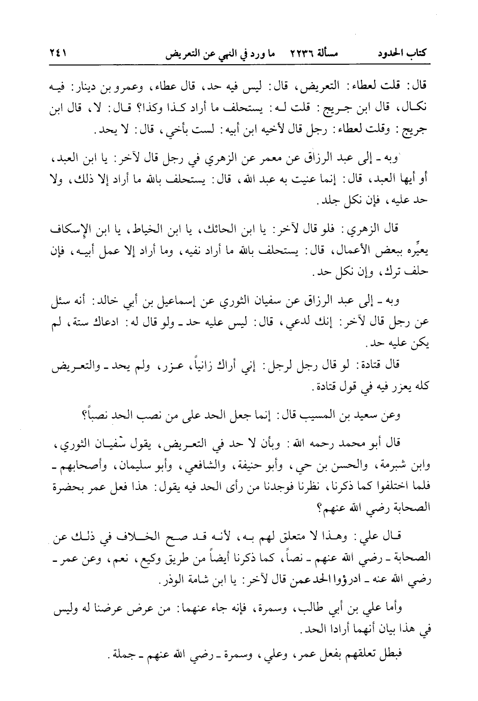 قَالَ: قُلْت لِعَطَاءٍ: التَّعْرِيضُ، قَالَ: لَيْسَ فِيهِ حَدٌّ، قَالَ عَطَاءٌ، وَعَمْرُو بْنُ دِينَارٍ: فِيهِ نَكَالٌ، قَالَ ابْنُ جُرَيْجٍ: قُلْت لَهُ: يُسْتَحْلَفُ مَا أَرَادَ كَذَا وَكَذَا؟ قَالَ: لَا، قَالَ ابْنُ جُرَيْجٍ: وَقُلْت لِعَطَاءٍ: رَجُلٌ قَالَ لِأَخِيهِ ابْنِ أَبِيهِ: لَسْت بِأَخِي، قَالَ: لَا يُحَدُّ. وَبِهِ - إلَى عَبْدِ الرَّزَّاقِ عَنْ مَعْمَرٍ عَنْ الزُّهْرِيِّ فِي رَجُلٍ قَالَ لِآخَرَ: يَا ابْنَ الْعَبْدِ، أَوْ أَيُّهَا الْعَبْدُ، قَالَ: إنَّمَا عَنَيْتُ بِهِ عَبْدَ اللَّهِ، قَالَ: يُسْتَحْلَفُ بِاَللَّهِ مَا أَرَادَ إلَّا ذَلِكَ، وَلَا حَدَّ عَلَيْهِ، فَإِنْ نَكَلَ جُلِدَ. وَقَالَ الزُّهْرِيُّ: فَلَوْ قَالَ لِآخَرَ: يَا ابْنَ الْحَائِكِ، يَا ابْنَ الْخَيَّاطِ، يَا ابْنَ الْإِسْكَافِ يُعَيِّرُهُ بِبَعْضِ الْأَعْمَالِ، قَالَ: يُسْتَحْلَفُ بِاَللَّهِ مَا أَرَادَ نَفْيَهُ، وَمَا أَرَادَ إلَّا عَمَلَ أَبِيهِ، فَإِنْ حَلَفَ تُرِكَ، وَإِنْ نَكَلَ حُدَّ. وَبِهِ - إلَى عَبْدِ الرَّزَّاقِ عَنْ سُفْيَانَ الثَّوْرِيِّ عَنْ إسْمَاعِيلَ بْنِ أَبِي خَالِدٍ: أَنَّهُ سُئِلَ عَنْ رَجُلٍ قَالَ لِآخَرَ: إنَّك لَدَعِيٌّ قَالَ: لَيْسَ عَلَيْهِ حَدٌّ - وَلَوْ قَالَ لَهُ: ادَّعَاك سِتَّةٌ، لَمْ يَكُنْ عَلَيْهِ حَدٌّ. قَالَ قَتَادَةُ: لَوْ قَالَ رَجُلٌ لِرَجُلٍ: إنِّي أَرَاك زَانِيًا، عُزِّرَ، وَلَمْ يُحَدَّ - وَالتَّعْرِيضُ كُلُّهُ يُعَزَّرُ فِيهِ فِي قَوْلِ قَتَادَةَ. وَعَنْ سَعِيدِ بْنِ الْمُسَيِّبِ قَالَ: إنَّمَا جُعِلَ الْحَدُّ عَلَى مَنْ نَصَبَ الْحَدَّ نَصْبًا قَالَ أَبُو مُحَمَّدٍ - رَحِمَهُ اللَّهُ -: بِأَنْ لَا حَدَّ فِي التَّعْرِيضِ، يَقُولُ سُفْيَانُ الثَّوْرِيُّ، وَابْنُ شُبْرُمَةَ، وَالْحَسَنُ بْنُ حَيٍّ، وَأَبُو حَنِيفَةَ، وَالشَّافِعِيُّ، وَأَبُو سُلَيْمَانَ، وَأَصْحَابُهُمْ - فَلَمَّا اخْتَلَفُوا كَمَا ذَكَرْنَا، نَظَرْنَا فَوَجَدْنَا مَنْ رَأَى الْحَدَّ فِيهِ يَقُولُ: هَذَا فِعْلُ عُمَرَ بِحَضْرَةِ الصَّحَابَةِ - رَضِيَ اللَّهُ عَنْهُمْ -؟ قَالَ عَلِيٌّ: وَهَذَا لَا مُتَعَلَّقَ لَهُمْ بِهِ، لِأَنَّهُ قَدْ صَحَّ الْخِلَافُ فِي ذَلِكَ عَنْ الصَّحَابَةِ - رَضِيَ اللَّهُ عَنْهُمْ - نَصًّا، كَمَا ذَكَرْنَا أَيْضًا مِنْ طَرِيقِ وَكِيعٍ، نَعَمْ، وَعَنْ عُمَرَ - رَضِيَ اللَّهُ عَنْهُ - ادْرَءُوا الْحَدَّ عَمَّنْ قَالَ لِآخَرَ: يَا ابْنَ شَامَّةِ الْوَذْرِ. وَأَمَّا عَلِيُّ بْنُ أَبِي طَالِبٍ، وَسَمُرَةُ، فَإِنَّهُ جَاءَ عَنْهُمَا: مَنْ عَرَّضَ عَرَّضْنَا لَهُ وَلَيْسَ فِي هَذَا بَيَانُ أَنَّهُمَا أَرَادَا الْحَدَّ. فَبَطَلَ تَعَلُّقُهُمْ بِفِعْلِ عُمَرَ، وَعَلِيٍّ، وَسَمُرَةَ - رَضِيَ اللَّهُ عَنْهُمْ - جُمْلَةً.
