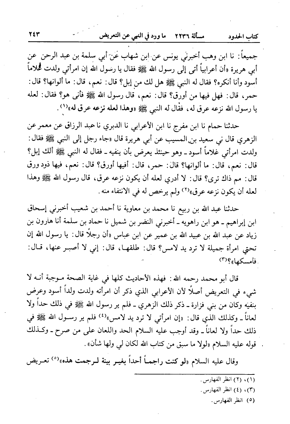 جَمِيعًا: نا ابْنُ وَهْبٍ أَخْبَرَنِي يُونُسُ عَنْ ابْنِ شِهَابٍ عَنْ أَبِي سَلَمَةَ بْنِ عَبْدِ الرَّحْمَنِ عَنْ أَبِي هُرَيْرَةَ «أَنَّ أَعْرَابِيًّا أَتَى إلَى رَسُولِ اللَّهِ - صَلَّى اللَّهُ عَلَيْهِ وَسَلَّمَ - فَقَالَ يَا رَسُولَ اللَّهِ إنَّ امْرَأَتِي وَلَدَتْ غُلَامًا أَسْوَدَ وَأَنَا أُنْكِرُهُ؟ فَقَالَ لَهُ النَّبِيُّ - صَلَّى اللَّهُ عَلَيْهِ وَسَلَّمَ - هَلْ لَك مِنْ إبِلٍ؟ قَالَ: نَعَمْ، قَالَ: مَا أَلْوَانُهَا؟ قَالَ: حُمْرٌ، قَالَ: فَهَلْ فِيهَا مِنْ أَوْرَقَ؟ قَالَ: نَعَمْ، قَالَ رَسُولُ اللَّهِ فَأَنَّى هُوَ؟ فَقَالَ لَعَلَّهُ يَا رَسُولَ اللَّهِ نَزَعَهُ عِرْقٌ لَهُ فَقَالَ لَهُ النَّبِيُّ - صَلَّى اللَّهُ عَلَيْهِ وَسَلَّمَ - وَهَذَا لَعَلَّهُ نَزَعَهُ عِرْقٌ لَهُ» حَدَّثَنَا حُمَامٌ نا ابْنُ مُفَرِّجٍ نا ابْنُ الْأَعْرَابِيِّ نا الدَّبَرِيُّ نا عَبْدُ الرَّزَّاقِ عَنْ مَعْمَرٍ عَنْ الزُّهْرِيِّ قَالَ ني سَعِيدُ بْنُ الْمُسَيِّبِ عَنْ أَبِي هُرَيْرَةَ قَالَ «جَاءَ رَجُلٌ إلَى النَّبِيِّ - صَلَّى اللَّهُ عَلَيْهِ وَسَلَّمَ - فَقَالَ: وَلَدَتْ امْرَأَتِي غُلَامًا أَسْوَدَ - وَهُوَ حِينَئِذٍ يُعَرِّضُ بِأَنْ يَنْفِيَهُ - فَقَالَ لَهُ النَّبِيُّ - صَلَّى اللَّهُ عَلَيْهِ وَسَلَّمَ - أَلَك إبِلٌ؟ قَالَ: نَعَمْ، قَالَ: مَا أَلْوَانُهَا؟ قَالَ: حُمْرٌ، قَالَ: أَفِيهَا أَوْرَقُ؟ قَالَ: نَعَمْ، فِيهَا ذَوْدٌ وُرْقٌ قَالَ: مِمَّ ذَاكَ تَرَى؟ قَالَ: لَا أَدْرِي لَعَلَّهُ أَنْ يَكُونَ نَزَعَهُ عِرْقٌ، قَالَ رَسُولُ اللَّهِ - صَلَّى اللَّهُ عَلَيْهِ وَسَلَّمَ - وَهَذَا لَعَلَّهُ أَنْ يَكُونَ نَزَعَهُ عِرْقٌ» وَلَمْ يُرَخِّصْ لَهُ فِي الِانْتِفَاءِ مِنْهُ. حَدَّثَنَا عَبْدُ اللَّهِ بْنُ رَبِيعٍ نا مُحَمَّدُ بْنُ مُعَاوِيَةَ نا أَحْمَدُ بْنُ شُعَيْبٍ أَخْبَرَنِي إِسْحَاقُ بْنُ إبْرَاهِيمَ - هُوَ ابْنُ رَاهْوَيْهِ - أَخْبَرَنِي النَّضْرُ بْنُ شُمَيْلٍ نا حَمَّادُ بْنُ سَلَمَةَ أَنَا هَارُونُ بْنُ زِيَادٍ عَنْ عَبْدِ اللَّهِ بْنِ عَبْدِ اللَّهِ بْنِ عُمَيْرٍ عَنْ ابْنِ عَبَّاسٍ «أَنَّ رَجُلًا قَالَ: يَا رَسُولَ اللَّهِ إنَّ تَحْتِي امْرَأَةً جَمِيلَةً لَا تَرُدُّ يَدَ لَامِسٍ؟ قَالَ: طَلِّقْهَا، قَالَ: إنِّي لَا أَصْبِرُ عَنْهَا، قَالَ: فَأَمْسِكْهَا» قَالَ أَبُو مُحَمَّدٍ - رَحِمَهُ اللَّهُ -: فَهَذِهِ الْأَحَادِيثُ كُلُّهَا فِي غَايَةِ الصِّحَّةِ مُوجِبَةٌ أَنَّهُ لَا شَيْءَ فِي التَّعْرِيضِ أَصْلًا؛ لِأَنَّ الْأَعْرَابِيَّ الَّذِي ذَكَرَ أَنَّ امْرَأَتَهُ وَلَدَتْ وَلَدًا أَسْوَدَ وَعَرَّضَ بِنَفْيِهِ وَكَانَ مِنْ بَنِي فَزَارَةَ - ذَكَرَ ذَلِكَ الزُّهْرِيُّ - فَلَمْ يَرَ رَسُولُ اللَّهِ - صَلَّى اللَّهُ عَلَيْهِ وَسَلَّمَ - فِي ذَلِكَ حَدًّا وَلَا لِعَانًا - وَكَذَلِكَ الَّذِي قَالَ: " إنَّ امْرَأَتِي لَا تَرُدُّ يَدَ لَامِسٍ " فَلَمْ يَرَ رَسُولُ اللَّهِ - صَلَّى اللَّهُ عَلَيْهِ وَسَلَّمَ - فِي ذَلِكَ حَدًّا وَلَا لِعَانًا - وَقَدْ أَوْجَبَ - عَلَيْهِ السَّلَامُ - الْحَدَّ وَاللِّعَانَ عَلَى مَنْ صَرَّحَ - وَكَذَلِكَ قَوْلُهُ - عَلَيْهِ السَّلَامُ - «لَوْلَا مَا سَبَقَ مِنْ كِتَابِ اللَّهِ لَكَانَ لِي وَلَهَا شَأْنٌ» . وَقَالَ - عَلَيْهِ السَّلَامُ - «لَوْ كُنْتُ رَاجِمًا أَحَدًا بِغَيْرِ بَيِّنَةٍ لَرَجَمْتُ هَذِهِ» تَعْرِيضٌ