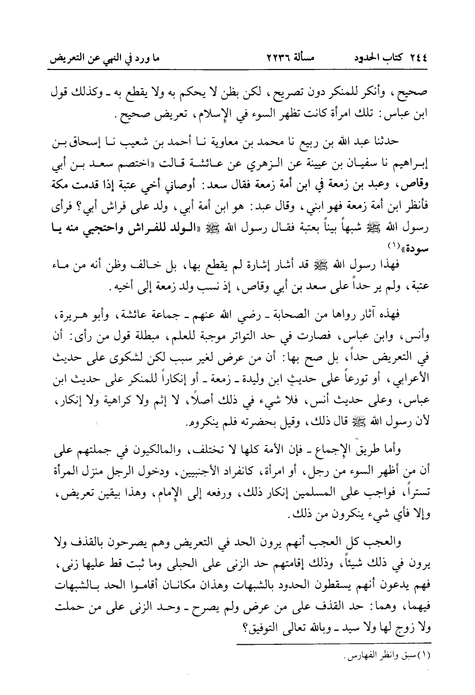 صَحِيحٌ، وَأَنْكَرُ لِلْمُنْكَرِ دُونَ تَصْرِيحٍ، لَكِنْ بِظَنٍّ لَا يُحْكَمُ بِهِ وَلَا يُقْطَعُ بِهِ - وَكَذَلِكَ قَوْلُ ابْنِ عَبَّاسٍ: تِلْكَ امْرَأَةٌ كَانَتْ تُظْهِرُ السُّوءَ فِي الْإِسْلَامِ، تَعْرِيضٌ صَحِيحٌ. حَدَّثَنَا عَبْدُ اللَّهِ بْنُ رَبِيعٍ نا مُحَمَّدُ بْنُ مُعَاوِيَةَ نا أَحْمَدُ بْنُ شُعَيْبٍ نا إِسْحَاقُ بْنُ إبْرَاهِيمَ نا سُفْيَانُ بْنُ عُيَيْنَةَ عَنْ الزُّهْرِيِّ عَنْ عَائِشَةَ قَالَتْ «اخْتَصَمَ سَعْدُ بْنُ أَبِي وَقَّاصٍ، وَعَبْدُ بْنُ زَمْعَةَ فِي ابْن أَمَةِ زَمْعَةَ فَقَالَ سَعْدٌ: أَوْصَانِي أَخِي عُتْبَةُ إذَا قَدِمْتُ مَكَّةَ فَأَنْظُرُ ابْنَ أَمَةِ زَمْعَةَ فَهُوَ ابْنِي، وَقَالَ عَبْدٌ: هُوَ ابْنُ أَمَةِ أَبِي وُلِدَ عَلَى فِرَاشِ أَبِي؟ فَرَأَى رَسُولُ اللَّهِ - صَلَّى اللَّهُ عَلَيْهِ وَسَلَّمَ - شَبَهًا بَيِّنًا بِعُتْبَةَ فَقَالَ رَسُولُ اللَّهِ - صَلَّى اللَّهُ عَلَيْهِ وَسَلَّمَ - الْوَلَدُ لِلْفِرَاشِ وَاحْتَجِبِي مِنْهُ يَا سَوْدَةُ» فَهَذَا رَسُولُ اللَّهِ - صَلَّى اللَّهُ عَلَيْهِ وَسَلَّمَ - قَدْ أَشَارَ إشَارَةً لَمْ يَقْطَعْ بِهَا، بَلْ خَالَفَ وَظَنَّ أَنَّهُ مِنْ مَاءِ عُتْبَةَ، وَلَمْ يَرَ حَدًّا عَلَى سَعْدِ بْنِ أَبِي وَقَّاصٍ، إذْ نَسَبَ وَلَدَ زَمْعَةَ إلَى أَخِيهِ. فَهَذِهِ آثَارٌ رَوَاهَا مِنْ الصَّحَابَةِ - رَضِيَ اللَّهُ عَنْهُمْ - جَمَاعَةٌ عَائِشَةُ، وَأَبُو هُرَيْرَةَ، وَأَنَسٌ، وَابْنُ عَبَّاسٍ، فَصَارَتْ فِي حَدِّ التَّوَاتُرِ مُوجِبَةً لِلْعِلْمِ، مُبْطِلَةً قَوْلَ مَنْ رَأَى: أَنَّ فِي التَّعْرِيضِ حَدًّا، بَلْ صَحَّ بِهَا: أَنَّ مَنْ عَرَّضَ لِغَيْرِ سَبَبٍ لَكِنْ لِشَكْوًى عَلَى حَدِيثِ الْأَعْرَابِيِّ، أَوْ تَوَرُّعًا عَلَى حَدِيثِ ابْنِ وَلِيدَةَ - زَمْعَةَ - أَوْ إنْكَارًا لِلْمُنْكَرِ عَلَى حَدِيثِ ابْنِ عَبَّاسٍ، وَعَلَى حَدِيثِ أَنَسٍ، فَلَا شَيْءَ فِي ذَلِكَ أَصْلًا، لَا إثْمَ وَلَا كَرَاهِيَةَ وَلَا إنْكَارَ؛ لِأَنَّ رَسُولَ اللَّهِ - صَلَّى اللَّهُ عَلَيْهِ وَسَلَّمَ - قَالَ ذَلِكَ، وَقِيلَ بِحَضْرَتِهِ فَلَمْ يُنْكِرْهُ. وَأَمَّا طَرِيقُ الْإِجْمَاعِ - فَإِنَّ الْأُمَّةَ كُلَّهَا لَا تَخْتَلِفُ، وَالْمَالِكِيُّونَ فِي جُمْلَتِهِمْ عَلَى أَنَّ مَنْ أَظْهَرَ السُّوءَ مِنْ رَجُلٍ، أَوْ امْرَأَةٍ، كَانْفِرَادِ الْأَجْنَبِيَّيْنِ، وَدُخُولِ الرَّجُلِ مَنْزِلَ الْمَرْأَةِ تَسَتُّرًا، فَوَاجِبٌ عَلَى الْمُسْلِمِينَ إنْكَارُ ذَلِكَ، وَرَفْعُهُ إلَى الْإِمَامِ، وَهَذَا بِيَقِينٍ تَعْرِيضٌ، وَإِلَّا فَأَيُّ شَيْءٍ يُنْكِرُونَ مِنْ ذَلِكَ. وَالْعَجَبُ كُلَّ الْعَجَبِ أَنَّهُمْ يَرَوْنَ الْحَدَّ فِي التَّعْرِيضِ وَهُمْ يُصَرِّحُونَ بِالْقَذْفِ وَلَا يَرَوْنَ فِي ذَلِكَ شَيْئًا، وَذَلِكَ إقَامَتُهُمْ حَدَّ الزِّنَى عَلَى الْحُبْلَى وَمَا ثَبَتَ قَطُّ عَلَيْهَا زِنًا، فَهُمْ يَدَّعُونَ أَنَّهُمْ يُسْقِطُونَ الْحُدُودَ بِالشُّبُهَاتِ وَهَذَانِ مَكَانَانِ أَقَامُوا الْحَدَّ بِالشُّبُهَاتِ فِيهِمَا، وَهُمَا: حَدُّ الْقَذْفِ عَلَى مَنْ عَرَّضَ وَلَمْ يُصَرِّحْ - وَحَدُّ الزِّنَا عَلَى مَنْ حَمَلَتْ وَلَا زَوْجَ لَهَا وَلَا سَيِّدَ - وَبِاَللَّهِ تَعَالَى التَّوْفِيقُ؟