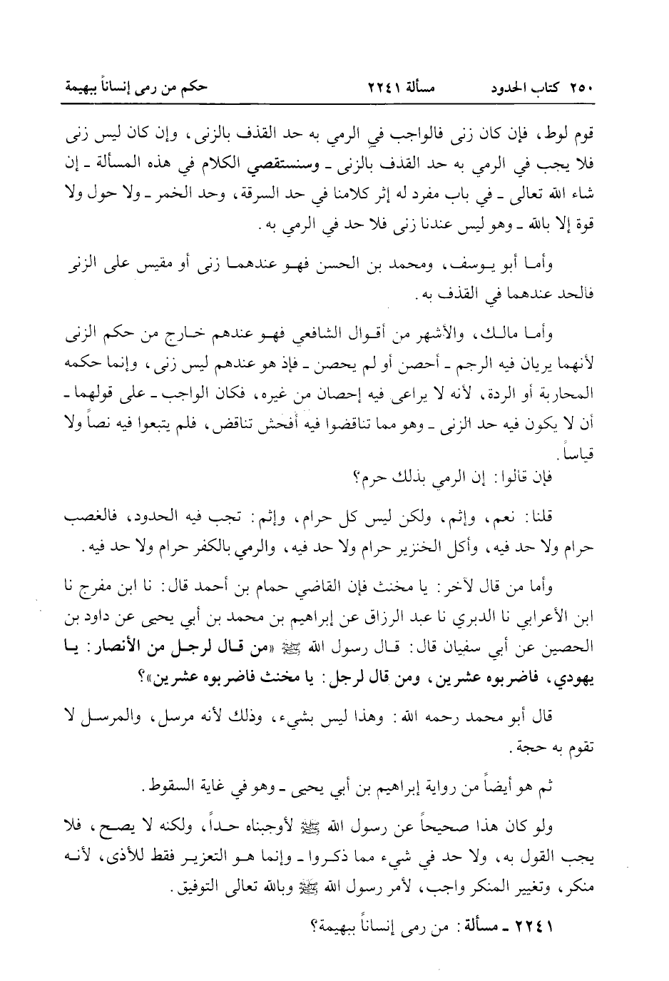 قَوْمِ لُوطٍ، فَإِنْ كَانَ زَنَى فَالْوَاجِبُ فِي الرَّمْيِ بِهِ حَدُّ الْقَذْفِ بِالزِّنَى، وَإِنْ كَانَ لَيْسَ زَنَى فَلَا يَجِبُ فِي الرَّمْيِ بِهِ حَدُّ الْقَذْفِ بِالزِّنَا - وَسَنَسْتَقْصِي الْكَلَامَ فِي هَذِهِ الْمَسْأَلَةِ - إنْ شَاءَ اللَّهُ تَعَالَى - فِي بَابٍ مُفْرَدٍ لَهُ إثْرَ كَلَامِنَا فِي حَدِّ السَّرِقَةِ، وَحَدِّ الْخَمْرِ - وَلَا حَوْلَ وَلَا قُوَّةَ إلَّا بِاَللَّهِ - وَهُوَ لَيْسَ عِنْدَنَا زِنًا فَلَا حَدَّ فِي الرَّمْيِ بِهِ. وَأَمَّا أَبُو يُوسُفَ، وَمُحَمَّدُ بْنُ الْحَسَنِ فَهُوَ عِنْدَهُمَا زِنًا أَوْ مَقِيسٌ عَلَى الزِّنَا فَالْحَدُّ عِنْدَهُمَا فِي الْقَذْفِ بِهِ. وَأَمَّا مَالِكٌ، وَالْأَشْهَرُ مِنْ أَقْوَالِ الشَّافِعِيِّ فَهُوَ عِنْدَهُمْ خَارِجٌ مِنْ حُكْمِ الزِّنَا؛ لِأَنَّهُمَا يَرَيَانِ فِيهِ الرَّجْمَ - أَحْصَنَ أَوْ لَمْ يُحْصَنْ - فَإِذْ هُوَ عِنْدَهُمْ لَيْسَ زِنًا، وَإِنَّمَا حُكْمُهُ الْمُحَارَبَةُ أَوْ الرِّدَّةُ؛ لِأَنَّهُ لَا يُرَاعَى فِيهِ إحْصَانٌ مِنْ غَيْرِهِ، فَكَانَ الْوَاجِبُ - عَلَى قَوْلِهِمَا - أَنْ لَا يَكُونَ فِيهِ حَدُّ الزِّنَا - وَهُوَ مِمَّا تَنَاقَضُوا فِيهِ أَفْحَشَ تَنَاقُضٍ، فَلَمْ يَتَّبِعُوا فِيهِ نَصًّا وَلَا قِيَاسًا. فَإِنْ قَالُوا: إنَّ الرَّمْيَ بِذَلِكَ حُرِّمَ؟ قُلْنَا: نَعَمْ، وَإِثْمٌ، وَلَكِنْ لَيْسَ كُلُّ حَرَامٍ، وَإِثْمٍ: تَجِبُ فِيهِ الْحُدُودُ، فَالْغَصْبُ حَرَامٌ وَلَا حَدَّ فِيهِ، وَأَكْلُ الْخِنْزِيرِ حَرَامٌ وَلَا حَدَّ فِيهِ، وَالرَّمْيُ بِالْكُفْرِ حَرَامٌ وَلَا حَدَّ فِيهِ. وَأَمَّا مَنْ قَالَ لِآخَرَ: يَا مُخَنَّثٌ فَإِنَّ الْقَاضِي حُمَامَ بْنَ أَحْمَدَ قَالَ: نا ابْنُ مُفَرِّجٍ نا ابْنُ الْأَعْرَابِيِّ نا الدَّبَرِيُّ نا عَبْدُ الرَّزَّاقِ عَنْ إبْرَاهِيمَ بْنِ مُحَمَّدِ بْنِ أَبِي يَحْيَى عَنْ دَاوُد بْنِ الْحُصَيْنِ عَنْ أَبِي سُفْيَانَ قَالَ: قَالَ رَسُولُ اللَّهِ - صَلَّى اللَّهُ عَلَيْهِ وَسَلَّمَ - «مَنْ قَالَ لِرَجُلٍ مِنْ الْأَنْصَارِ: يَا يَهُودِيُّ، فَاضْرِبُوهُ عِشْرِينَ، وَمَنْ قَالَ لِرَجُلٍ: يَا مُخَنَّثُ فَاضْرِبُوهُ عِشْرِينَ» قَالَ أَبُو مُحَمَّدٍ - رَحِمَهُ اللَّهُ -: وَهَذَا لَيْسَ بِشَيْءٍ، وَذَلِكَ؛ لِأَنَّهُ مُرْسَلٌ، وَالْمُرْسَلُ لَا تَقُومُ بِهِ حُجَّةٌ. ثُمَّ هُوَ أَيْضًا مِنْ رِوَايَةِ إبْرَاهِيمَ بْنِ أَبِي يَحْيَى - وَهُوَ فِي غَايَةِ السُّقُوطِ. وَلَوْ كَانَ هَذَا صَحِيحًا عَنْ رَسُولِ اللَّهِ - صَلَّى اللَّهُ عَلَيْهِ وَسَلَّمَ - لَأَوْجَبْنَاهُ حَدًّا، وَلَكِنَّهُ لَا يَصِحُّ، فَلَا يَجِبُ الْقَوْلُ بِهِ، وَلَا حَدَّ فِي شَيْءٍ مِمَّا ذَكَرُوا - وَإِنَّمَا هُوَ التَّعْزِيرُ فَقَطْ لِلْأَذَى؛ لِأَنَّهُ مُنْكَرٌ، وَتَغْيِيرُ الْمُنْكَرِ وَاجِبٌ، لِأَمْرِ رَسُولِ اللَّهِ - صَلَّى اللَّهُ عَلَيْهِ وَسَلَّمَ - وَبِاَللَّهِ تَعَالَى التَّوْفِيقُ