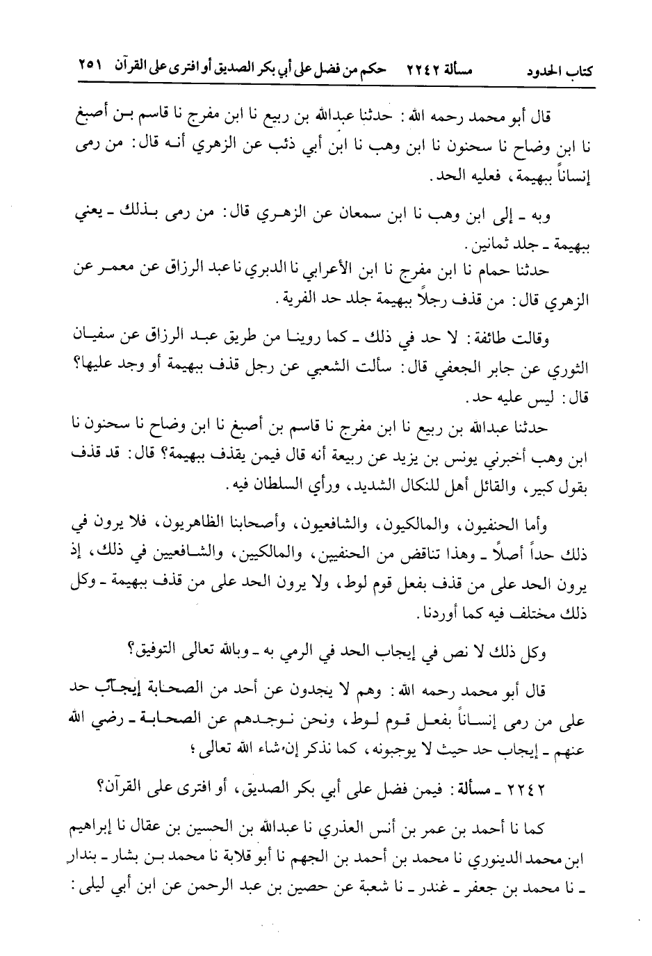 قَالَ أَبُو مُحَمَّدٍ - رَحِمَهُ اللَّهُ -: حَدَّثَنَا عَبْدُ اللَّهِ بْنُ رَبِيعٍ نا ابْنُ مُفَرِّجٍ نا قَاسِمُ بْنُ أَصْبَغَ نا ابْنُ وَضَّاحٍ نا سَحْنُونٌ نا ابْنُ وَهْبٍ نا ابْنُ أَبِي ذِئْبٍ عَنْ الزُّهْرِيِّ أَنَّهُ قَالَ: مَنْ رَمَى إنْسَانًا بِبَهِيمَةٍ، فَعَلَيْهِ الْحَدُّ. وَبِهِ - إلَى ابْنِ وَهْبٍ نا ابْنُ سَمْعَانَ عَنْ الزُّهْرِيِّ قَالَ: مَنْ رُمِيَ بِذَلِكَ - يَعْنِي بِبَهِيمَةٍ - جُلِدَ ثَمَانِينَ. حَدَّثَنَا حُمَامٌ نا ابْنُ مُفَرِّجٍ نا ابْنُ الْأَعْرَابِيِّ نا الدَّبَرِيُّ نا عَبْدُ الرَّزَّاقِ عَنْ مَعْمَرٍ عَنْ الزُّهْرِيِّ قَالَ: مَنْ قَذَفَ رَجُلًا بِبَهِيمَةٍ جُلِدَ حَدَّ الْفِرْيَةِ. وَقَالَتْ طَائِفَةٌ: لَا حَدَّ فِي ذَلِكَ - كَمَا رُوِّينَا مِنْ طَرِيقِ عَبْدِ الرَّزَّاقِ عَنْ سُفْيَانَ الثَّوْرِيِّ عَنْ جَابِرٍ الْجُعْفِيِّ قَالَ: سَأَلْت الشَّعْبِيَّ عَنْ رَجُلٍ قُذِفَ بِبَهِيمَةٍ أَوْ وُجِدَ عَلَيْهَا؟ قَالَ: لَيْسَ عَلَيْهِ حَدٌّ. حَدَّثَنَا عَبْدُ اللَّهِ بْنُ رَبِيعٍ نا ابْنُ مُفَرِّجٍ نا قَاسِمُ بْنُ أَصْبَغَ نا ابْنُ وَضَّاحٍ نا سَحْنُونٌ نا ابْنُ وَهْبٍ أَخْبَرَنِي يُونُسُ بْنُ يَزِيدَ عَنْ رَبِيعَةَ أَنَّهُ قَالَ فِيمَنْ يُقْذَفُ بِبَهِيمَةٍ؟ قَالَ: قَدْ قُذِفَ بِقَوْلٍ كَبِيرٍ، وَالْقَائِلُ أَهْلٌ لِلنَّكَالِ الشَّدِيدِ، وَرَأْيِ السُّلْطَانِ فِيهِ. وَأَمَّا الْحَنَفِيُّونَ، وَالْمَالِكِيُّونَ، وَالشَّافِعِيُّونَ، وَأَصْحَابُنَا الظَّاهِرِيُّونَ، فَلَا يَرَوْنَ فِي ذَلِكَ حَدًّا أَصْلًا - وَهَذَا تَنَاقُضٌ مِنْ الْحَنَفِيِّينَ، وَالْمَالِكِيِّينَ، وَالشَّافِعِيِّينَ فِي ذَلِكَ، إذْ يَرَوْنَ الْحَدَّ عَلَى مَنْ قُذِفَ بِفِعْلِ قَوْمِ لُوطٍ، وَلَا يَرَوْنَ الْحَدَّ عَلَى مِنْ قُذِفَ بِبَهِيمَةٍ - وَكُلُّ ذَلِكَ مُخْتَلَفٌ فِيهِ كَمَا أَوْرَدْنَا. وَكُلُّ ذَلِكَ لَا نَصَّ فِي إيجَابِ الْحَدِّ فِي الرَّمْيِ بِهِ - وَبِاَللَّهِ تَعَالَى التَّوْفِيقُ قَالَ أَبُو مُحَمَّدٍ - رَحِمَهُ اللَّهُ -: وَهُمْ لَا يَجِدُونَ عَنْ أَحَدٍ مِنْ الصَّحَابَةِ إيجَابُ حَدٍّ عَلَى مَنْ رَمَى إنْسَانًا بِفِعْلِ قَوْمِ لُوطٍ، وَنَحْنُ نُوجِدُهُمْ عَنْ الصَّحَابَةِ - رَضِيَ اللَّهُ عَنْهُمْ - إيجَابَ حَدٍّ حَيْثُ لَا يُوجِبُونَهُ، كَمَا نَذْكُرُ إنْ شَاءَ اللَّهُ تَعَالَى؛