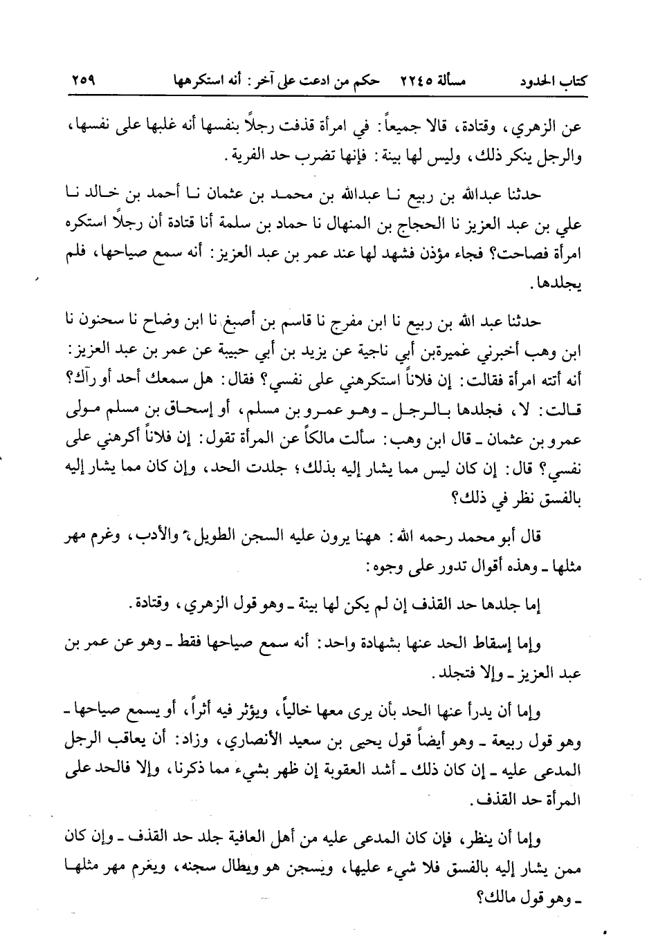 عَنْ الزُّهْرِيِّ، وَقَتَادَةَ قَالَا جَمِيعًا: فِي امْرَأَةٍ قَذَفَتْ رَجُلًا بِنَفْسِهَا أَنَّهُ غَلَبَهَا عَلَى نَفْسِهَا، وَالرَّجُلُ يُنْكِرُ ذَلِكَ، وَلَيْسَ لَهَا بَيِّنَةٌ: فَإِنَّهَا تُضْرَبُ حَدَّ الْفِرْيَةِ. حَدَّثَنَا عَبْدُ اللَّهِ بْنُ رَبِيعٍ نا عَبْدُ اللَّهِ بْنُ مُحَمَّدِ بْنِ عُثْمَانَ نا أَحْمَدُ بْنُ خَالِدٍ نا عَلِيُّ بْنُ عَبْدِ الْعَزِيزِ نا الْحَجَّاجُ بْنُ الْمِنْهَالِ نا حَمَّادُ بْنُ سَلَمَةَ أَنَا قَتَادَةُ أَنَّ رَجُلًا اسْتَكْرَهَ امْرَأَةً فَصَاحَتْ؟ فَجَاءَ مُؤَذِّنٌ فَشَهِدَ لَهَا عِنْدَ عُمَرَ بْنِ عَبْدِ الْعَزِيزِ: أَنَّهُ سَمِعَ صِيَاحَهَا، فَلَمْ يَجْلِدْهَا. حَدَّثَنَا عَبْدُ اللَّهِ بْنُ رَبِيعٍ نا ابْنُ مُفَرِّجٍ نا قَاسِمُ بْنُ أَصْبَغَ نا ابْنُ وَضَّاحٍ نا سَحْنُونٌ نا ابْنُ وَهْبٍ أَخْبَرَنِي عُمَيْرَةُ بْنُ أَبِي نَاجِيَةَ عَنْ يَزِيدَ بْنِ أَبِي حَبِيبَةَ عَنْ عُمَرَ بْنِ عَبْدِ الْعَزِيزِ: أَنَّهُ أَتَتْهُ امْرَأَةٌ فَقَالَتْ: إنَّ فُلَانًا اسْتَكْرَهَنِي عَلَى نَفْسِي؟ فَقَالَ: هَلْ سَمِعَكِ أَحَدٌ أَوْ رَآك؟ قَالَتْ: لَا، فَجَلَدَهَا بِالرَّجُلِ - وَهُوَ عَمْرُو بْنُ مُسْلِمٍ، أَوْ إِسْحَاقُ بْنُ مُسْلِمٍ مَوْلَى عَمْرِو بْنِ عُثْمَانَ - قَالَ ابْنُ وَهْبٍ: سَأَلْت مَالِكًا عَنْ الْمَرْأَةِ تَقُولُ: إنَّ فُلَانًا أَكْرَهَنِي عَلَى نَفْسِي؟ قَالَ: إنْ كَانَ لَيْسَ مِمَّا يُشَارُ إلَيْهِ بِذَلِكَ؛ جُلِدَتْ الْحَدَّ، وَإِنْ كَانَ مِمَّا يُشَارُ إلَيْهِ بِالْفِسْقِ نُظِرَ فِي ذَلِكَ قَالَ أَبُو مُحَمَّدٍ - رَحِمَهُ اللَّهُ -: هَاهُنَا يَرَوْنَ عَلَيْهِ السِّجْنَ الطَّوِيلَ، وَالْأَدَبَ، وَغُرْمَ مَهْرِ مِثْلِهَا - وَهَذِهِ أَقْوَالٌ تَدُورُ عَلَى وُجُوهٍ: إمَّا جَلْدُهَا حَدَّ الْقَذْفِ إنْ لَمْ يَكُنْ لَهَا بَيِّنَةٌ - وَهُوَ قَوْلُ الزُّهْرِيِّ، وَقَتَادَةَ. وَإِمَّا إسْقَاطُ الْحَدِّ عَنْهَا بِشَهَادَةِ وَاحِدٍ: أَنَّهُ سَمِعَ صِيَاحَهَا فَقَطْ - وَهُوَ عَنْ عُمَرَ بْنِ عَبْدِ الْعَزِيزِ - وَإِلَّا فَتُجْلَدُ. وَإِمَّا أَنْ يَدْرَأَ عَنْهَا الْحَدَّ بِأَنْ يُرَى مَعَهَا خَالِيًا، وَيُؤَثِّرَ فِيهِ أَثَرًا، أَوْ يَسْمَعَ صِيَاحَهَا - وَهُوَ قَوْلُ رَبِيعَةَ - وَهُوَ أَيْضًا قَوْلُ يَحْيَى بْنِ سَعِيدٍ الْأَنْصَارِيِّ، وَزَادَ: أَنْ يُعَاقِبَ الرَّجُلَ الْمُدَّعَى عَلَيْهِ - إنْ كَانَ ذَلِكَ - أَشَدَّ الْعُقُوبَةِ إنْ ظَهَرَ بِشَيْءٍ مِمَّا ذَكَرْنَا، وَإِلَّا فَالْحَدُّ عَلَى الْمَرْأَةِ حَدُّ الْقَذْفِ. وَإِمَّا أَنْ يَنْظُرَ، فَإِنْ كَانَ الْمُدَّعَى عَلَيْهِ مِنْ أَهْلِ الْعَافِيَةِ جُلِدَ حَدَّ الْقَذْفِ - وَإِنْ كَانَ مِمَّنْ يُشَارُ إلَيْهِ بِالْفِسْقِ فَلَا شَيْءَ عَلَيْهَا، وَيُسْجَنُ هُوَ وَيُطَالُ سِجْنُهُ، وَيَغْرَمُ مَهْرَ مِثْلِهَا - وَهُوَ قَوْلُ مَالِكٍ