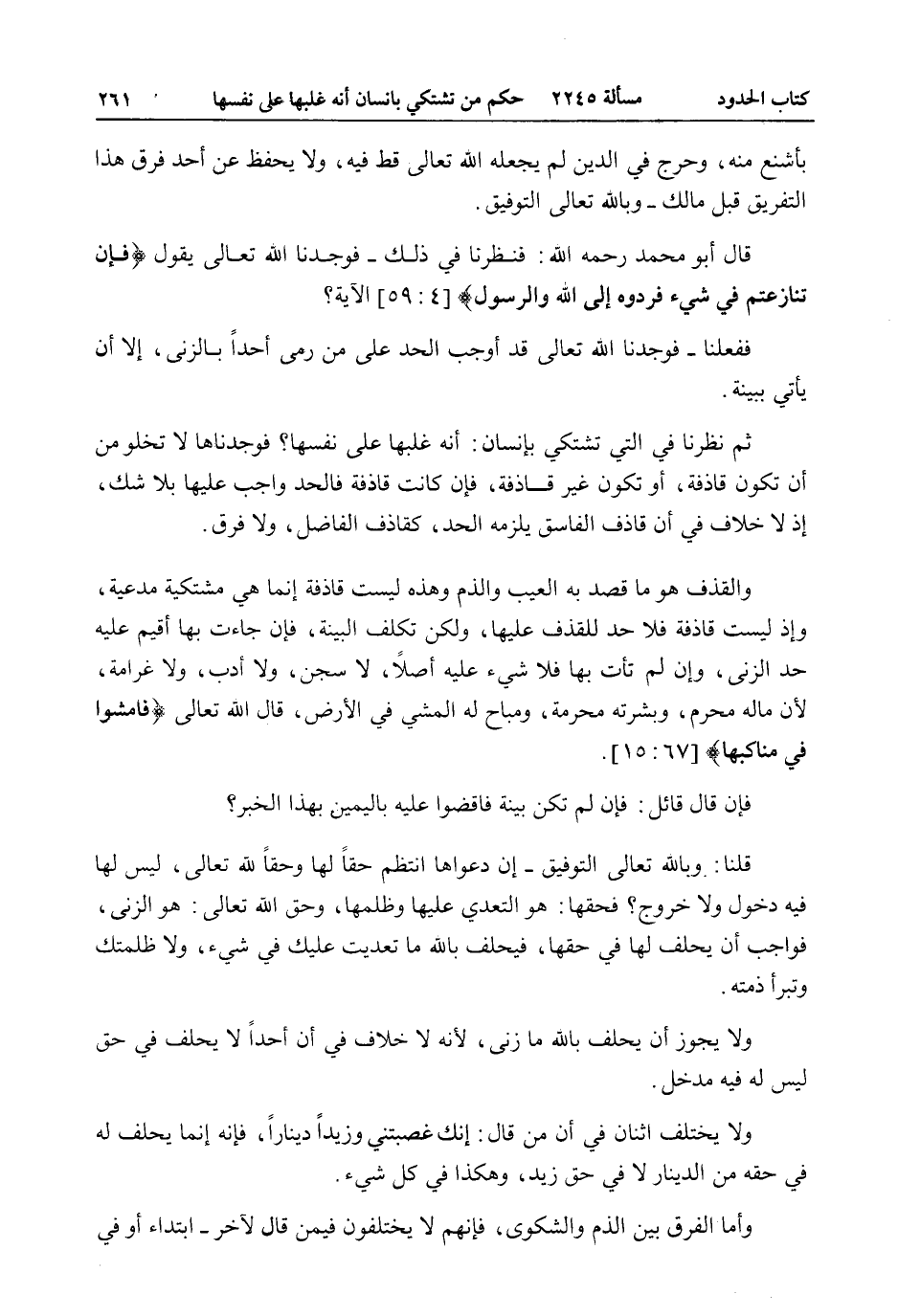 بِأَشْنَعَ مِنْهُ، وَحَرَجٌ فِي الدِّينِ لَمْ يَجْعَلْهُ اللَّهُ تَعَالَى قَطُّ فِيهِ، وَلَا يُحْفَظُ عَنْ أَحَدٍ فَرَّقَ هَذَا التَّفْرِيقَ قَبْلَ مَالِكٍ - وَبِاَللَّهِ تَعَالَى التَّوْفِيقُ. قَالَ أَبُو مُحَمَّدٍ - رَحِمَهُ اللَّهُ -: فَنَظَرْنَا فِي ذَلِكَ - فَوَجَدْنَا اللَّهَ تَعَالَى يَقُولُ {فَإِنْ تَنَازَعْتُمْ فِي شَيْءٍ فَرُدُّوهُ إِلَى اللَّهِ وَالرَّسُولِ} [النساء: 59] الْآيَةَ؟ فَفَعَلْنَا - فَوَجَدْنَا اللَّهَ تَعَالَى قَدْ أَوْجَبَ الْحَدَّ عَلَى مَنْ رَمَى أَحَدًا بِالزِّنَا، إلَّا أَنْ يَأْتِيَ بِبَيِّنَةٍ. ثُمَّ نَظَرْنَا فِي الَّتِي تَشْتَكِي بِإِنْسَانٍ: أَنَّهُ غَلَبَهَا عَلَى نَفْسِهَا؟ فَوَجَدْنَاهَا لَا تَخْلُو مِنْ أَنْ تَكُونَ قَاذِفَةً، أَوْ تَكُونَ غَيْرَ قَاذِفَةٍ، فَإِنْ كَانَتْ قَاذِفَةً فَالْحَدُّ وَاجِبٌ عَلَيْهَا بِلَا شَكٍّ، إذْ لَا خِلَافَ فِي أَنَّ قَاذِفَ الْفَاسِقِ يَلْزَمُهُ الْحَدُّ، كَقَاذِفِ الْفَاضِلِ، وَلَا فَرْقَ. وَالْقَذْفُ هُوَ مَا قُصِدَ بِهِ الْعَيْبُ وَالذَّمُّ وَهَذِهِ لَيْسَتْ قَاذِفَةً إنَّمَا هِيَ مُشْتَكِيَةٌ مُدَّعِيَةٌ، وَإِذْ لَيْسَتْ قَاذِفَةً فَلَا حَدَّ لِلْقَذْفِ عَلَيْهَا، وَلَكِنْ تُكَلَّفُ الْبَيِّنَةَ، فَإِنْ جَاءَتْ بِهَا أُقِيمَ عَلَيْهِ حَدُّ الزِّنَا، وَإِنْ لَمْ تَأْتِ بِهَا فَلَا شَيْءَ عَلَيْهِ أَصْلًا، لَا سِجْنَ، وَلَا أَدَبَ، وَلَا غَرَامَةَ؛ لِأَنَّ مَالَهُ مُحَرَّمٌ، وَبَشَرَتَهُ مُحَرَّمَةٌ، وَمُبَاحٌ لَهُ الْمَشْيُ فِي الْأَرْضِ، قَالَ اللَّهُ تَعَالَى {فَامْشُوا فِي مَنَاكِبِهَا} [الملك: 15] . فَإِنْ قَالَ قَائِلٌ: فَإِنْ لَمْ تَكُنْ بَيِّنَةٌ فَاقْضُوا عَلَيْهِ بِالْيَمِينِ بِهَذَا الْخَبَرِ؟ قُلْنَا: وَبِاَللَّهِ تَعَالَى التَّوْفِيقُ - إنَّ دَعْوَاهَا انْتَظَمَ حَقًّا لَهَا وَحَقًّا لِلَّهِ تَعَالَى، لَيْسَ لَهَا فِيهِ دُخُولٌ وَلَا خُرُوجٌ؟ فَحَقُّهَا: التَّعَدِّي عَلَيْهَا وَظُلْمُهَا، وَحَقُّ اللَّهِ تَعَالَى: هُوَ الزِّنَا، فَوَاجِبٌ أَنْ يَحْلِفَ لَهَا فِي حَقِّهَا، فَيَحْلِفُ بِاَللَّهِ مَا تَعَدَّيْت عَلَيْك فِي شَيْءٍ، وَلَا ظَلَمْتُك وَتَبْرَأُ ذِمَّتُهُ. وَلَا يَجُوزُ أَنْ يَحْلِفَ بِاَللَّهِ مَا زَنَى؛ لِأَنَّهُ لَا خِلَافَ فِي أَنَّ أَحَدًا لَا يَحْلِفُ فِي حَقٍّ لَيْسَ لَهُ فِيهِ مَدْخَلٌ. وَلَا يَخْتَلِفُ اثْنَانِ فِي أَنَّ مَنْ قَالَ: إنَّك غَصَبْتنِي وَزَيْدًا دِينَارًا، فَإِنَّهُ إنَّمَا يَحْلِفُ لَهُ فِي حَقِّهِ مِنْ الدِّينَارِ لَا فِي حَقِّ زَيْدٍ، وَهَكَذَا فِي كُلِّ شَيْءٍ. وَأَمَّا الْفَرْقُ بَيْنَ الذَّمِّ وَالشَّكْوَى، فَإِنَّهُمْ لَا يَخْتَلِفُونَ فِيمَنْ قَالَ لِآخَرَ - ابْتِدَاءً أَوْ فِي