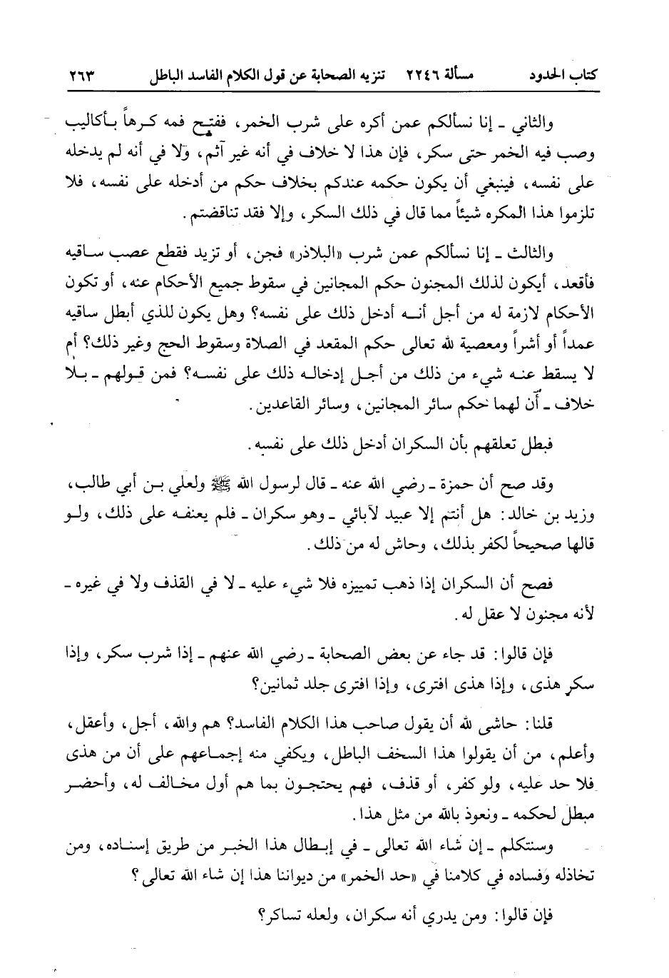 الثَّانِي - إنَّا نَسْأَلُكُمْ عَمَّنْ أُكْرِهَ عَلَى شُرْبِ الْخَمْرِ، فَفُتِحَ فَمُهُ كَرْهًا بِأَكَالِيبَ وَصُبَّ فِيهِ الْخَمْرُ حَتَّى سَكِرَ، فَإِنَّ هَذَا لَا خِلَافَ فِي أَنَّهُ غَيْرُ آثِمٍ، وَلَا فِي أَنَّهُ لَمْ يُدْخِلْهُ عَلَى نَفْسِهِ، فَيَنْبَغِي أَنْ يَكُونَ حُكْمُهُ عِنْدَكُمْ بِخِلَافِ حُكْمِ مَنْ أَدْخَلَهُ عَلَى نَفْسِهِ، فَلَا تُلْزِمُوا هَذَا الْمُكْرَهَ شَيْئًا مِمَّا قَالَ فِي ذَلِكَ السُّكْرِ، وَإِلَّا فَقَدْ تَنَاقَضْتُمْ. وَالثَّالِثُ - إنَّا نَسْأَلُكُمْ عَمَّنْ شَرِبَ الْبَلَاذِرَ فَجُنَّ، أَوْ تَزَيَّدَ فَقُطِعَ عَصَبُ سَاقَيْهِ فَأُقْعِدَ، أَيَكُونُ لِذَلِكَ الْمَجْنُونِ حُكْمُ الْمَجَانِينَ فِي سُقُوطِ جَمِيعِ الْأَحْكَامِ عَنْهُ، أَوْ تَكُونُ الْأَحْكَامُ لَازِمَةً لَهُ مِنْ أَجْلِ أَنَّهُ أَدْخَلَ ذَلِكَ عَلَى نَفْسِهِ؟ وَهَلْ يَكُونُ لِلَّذِي أَبْطَلَ سَاقَيْهِ عَمْدًا أَوْ أَشَرًا وَمَعْصِيَةً لِلَّهِ تَعَالَى حُكْمُ الْمُقْعَدِ فِي الصَّلَاةِ وَسُقُوطِ الْحَجِّ وَغَيْرِ ذَلِكَ؟ أَمْ لَا يَسْقُطُ عَنْهُ شَيْءٌ مِنْ ذَلِكَ مِنْ أَجْلِ إدْخَالِهِ ذَلِكَ عَلَى نَفْسِهِ؟ فَمِنْ قَوْلِهِمْ - بِلَا خِلَافٍ - إنَّ لَهُمَا حُكْمَ سَائِرِ الْمَجَانِينَ، وَسَائِرِ الْقَاعِدِينَ. فَبَطَلَ تَعَلُّقُهُمْ بِأَنَّ السَّكْرَانَ أَدْخَلَ ذَلِكَ عَلَى نَفْسِهِ. وَقَدْ صَحَّ «أَنَّ حَمْزَةَ - رَضِيَ اللَّهُ عَنْهُ - قَالَ لِرَسُولِ اللَّهِ - صَلَّى اللَّهُ عَلَيْهِ وَسَلَّمَ - وَلِعَلِيِّ بْنِ أَبِي طَالِبٍ، وَزَيْدِ بْنِ خَالِدٍ: هَلْ أَنْتُمْ إلَّا عَبِيدٌ لِآبَائِي - وَهُوَ سَكْرَانُ - فَلَمْ يُعَنِّفْهُ عَلَى ذَلِكَ» وَلَوْ قَالَهَا صَحِيحًا لَكَفَرَ بِذَلِكَ، وَحَاشَ لَهُ مِنْ ذَلِكَ. فَصَحَّ أَنَّ السَّكْرَانَ إذَا ذَهَبَ تَمْيِيزُهُ فَلَا شَيْءَ عَلَيْهِ - لَا فِي الْقَذْفِ وَلَا فِي غَيْرِهِ -؛ لِأَنَّهُ مَجْنُونٌ لَا عَقْلَ لَهُ. فَإِنْ قَالُوا: قَدْ جَاءَ عَنْ بَعْضِ الصَّحَابَةِ - رَضِيَ اللَّهُ عَنْهُمْ - إذَا شَرِبَ سَكِرَ، وَإِذَا سَكِرَ هَذَى، وَإِذَا هَذَى افْتَرَى، وَإِذَا افْتَرَى جُلِدَ ثَمَانِينَ؟ قُلْنَا: حَاشَى لِلَّهِ أَنْ يَقُولَ صَاحِبٌ هَذَا الْكَلَامَ الْفَاسِدَ؟ هُمْ وَاَللَّهِ، أَجَلُّ، وَأَعْقَلُ، وَأَعْلَمُ، مِنْ أَنْ يَقُولُوا هَذَا السُّخْفَ الْبَاطِلَ، وَيَكْفِي مِنْهُ إجْمَاعُهُمْ عَلَى أَنَّ مَنْ هَذَى فَلَا حَدَّ عَلَيْهِ، وَلَوْ كَفَرَ، أَوْ قَذَفَ، فَهُمْ يَحْتَجُّونَ بِمَا هُمْ أَوَّلُ مُخَالِفٍ لَهُ، وَأَحْضَرُ مُبْطِلٍ لِحُكْمِهِ - وَنَعُوذُ بِاَللَّهِ مِنْ مِثْلِ هَذَا. وَسَنَتَكَلَّمُ - إنْ شَاءَ اللَّهُ تَعَالَى - فِي إبْطَالِ هَذَا الْخَبَرِ مِنْ طَرِيقِ إسْنَادِهِ، وَمِنْ تَخَاذُلِهِ وَفَسَادِهِ فِي كَلَامِنَا فِي " حَدِّ الْخَمْرِ " مِنْ دِيوَانِنَا هَذَا إنْ شَاءَ اللَّهُ تَعَالَى فَإِنْ قَالُوا: وَمَنْ يَدْرِي أَنَّهُ سَكْرَانُ، وَلَعَلَّهُ تَسَاكَرَ؟
