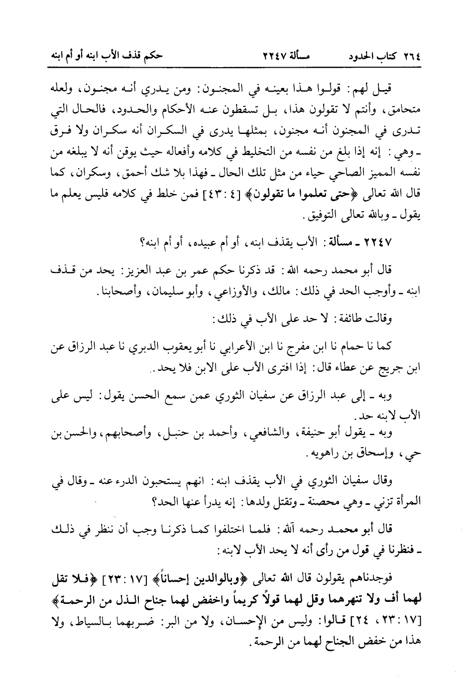2247 - مَسْأَلَةٌ: الْأَبُ يَقْذِفُ ابْنَهُ، أَوْ أُمَّ عَبِيدِهِ، أَوْ أُمَّ ابْنِهِ قَالَ أَبُو مُحَمَّدٍ - رَحِمَهُ اللَّهُ -: قَدْ ذَكَرْنَا حُكْمَ عُمَرَ بْنِ عَبْدِ الْعَزِيزِ: يُحَدُّ مَنْ قَذَفَ ابْنَهُ - وَأَوْجَبَ الْحَدَّ فِي ذَلِكَ: مَالِكٌ، وَالْأَوْزَاعِيُّ، وَأَبُو سُلَيْمَانَ، وَأَصْحَابُنَا. وَقَالَتْ طَائِفَةٌ: لَا حَدَّ عَلَى الْأَبِ فِي ذَلِكَ: كَمَا نا حُمَامٌ نا ابْنُ مُفَرِّجٍ نا ابْنُ الْأَعْرَابِيِّ نا أَبُو يَعْقُوبِ الدَّبَرِيُّ نا عَبْدُ الرَّزَّاقِ عَنْ ابْنِ جُرَيْجٍ عَنْ عَطَاءٍ قَالَ: إذَا افْتَرَى الْأَبُ عَلَى الِابْنِ فَلَا يُحَدُّ.