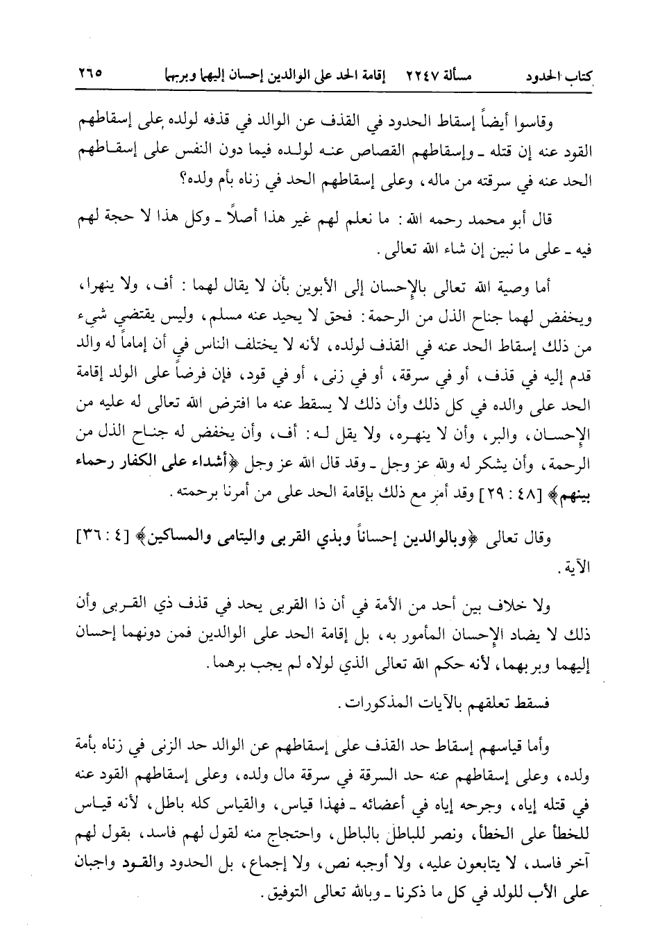 وَعَلَى إسْقَاطِهِمْ الْحَدَّ فِي زِنَاهُ بِأُمِّ وَلَدِهِ قَالَ أَبُو مُحَمَّدٍ - رَحِمَهُ اللَّهُ -: مَا نَعْلَمُ لَهُمْ غَيْرَ هَذَا أَصْلًا - وَكُلُّ هَذَا لَا حُجَّةَ لَهُمْ فِيهِ - عَلَى مَا نُبَيِّنُ إنْ شَاءَ اللَّهُ تَعَالَى. أَمَّا وَصِيَّةُ اللَّهِ تَعَالَى بِالْإِحْسَانِ إلَى الْأَبَوَيْنِ بِأَنْ لَا يُقَالَ لَهُمَا: أُفٍّ، وَلَا يُنْهَرَا، وَيُخْفَضَ لَهُمَا جَنَاحُ الذُّلِّ مِنْ الرَّحْمَةِ: فَحَقٌّ لَا يَحِيدُ عَنْهُ مُسْلِمٌ، وَلَيْسَ يَقْتَضِي شَيْءٌ مِنْ ذَلِكَ إسْقَاطَ الْحَدِّ عَنْهُ فِي الْقَذْفِ لِوَلَدِهِ؛ لِأَنَّهُ لَا يَخْتَلِفُ النَّاسُ فِي أَنَّ إمَامًا لَهُ وَالِدٌ قَدِمَ إلَيْهِ فِي قَذْفٍ، أَوْ فِي سَرِقَةٍ أَوْ فِي زِنًا، أَوْ فِي قَوَدٍ، فَإِنْ فَرَضَا عَلَى الْوَلَدِ إقَامَةَ الْحَدِّ عَلَى وَالِدِهِ فِي كُلِّ ذَلِكَ وَأَنَّ ذَلِكَ لَا يُسْقِطُ عَنْهُ مَا افْتَرَضَ اللَّهُ تَعَالَى لَهُ عَلَيْهِ مِنْ الْإِحْسَانِ، وَالْبِرِّ، وَأَنْ لَا يَنْهَرَهُ، وَلَا يَقُلْ لَهُ: أُفٍّ، وَأَنْ يَخْفِضَ لَهُ جَنَاحَ الذُّلِّ مِنْ الرَّحْمَةِ، وَأَنْ يَشْكُرَ لَهُ وَلِلَّهِ عَزَّ وَجَلَّ - وَقَدْ قَالَ اللَّهُ عَزَّ وَجَلَّ {أَشِدَّاءُ عَلَى الْكُفَّارِ رُحَمَاءُ بَيْنَهُمْ} [الفتح: 29] وَقَدْ أَمَرَ مَعَ ذَلِكَ بِإِقَامَةِ الْحَدِّ عَلَى مَنْ أَمَرَنَا بِرَحْمَتِهِ. وَقَالَ تَعَالَى {وَبِالْوَالِدَيْنِ إِحْسَانًا وَبِذِي الْقُرْبَى وَالْيَتَامَى وَالْمَسَاكِينِ} [النساء: 36] الْآيَةَ. وَلَا خِلَافَ بَيْنَ أَحَدٍ مِنْ الْأُمَّةِ فِي أَنَّ ذَا الْقُرْبَى يُحَدُّ فِي قَذْفِ ذِي الْقُرْبَى وَأَنَّ ذَلِكَ لَا يُضَادَّ الْإِحْسَانَ الْمَأْمُورَ بِهِ، بَلْ إقَامَةُ الْحَدِّ عَلَى الْوَالِدَيْنِ فَمِنْ دُونِهِمَا إحْسَانٌ إلَيْهِمَا وَبِرٌّ بِهِمَا؛ لِأَنَّهُ حُكْمُ اللَّهِ تَعَالَى الَّذِي لَوْلَاهُ لَمْ يَجِبْ بِرُّهُمَا. فَسَقَطَ تَعَلُّقُهُمْ بِالْآيَاتِ الْمَذْكُورَاتِ.