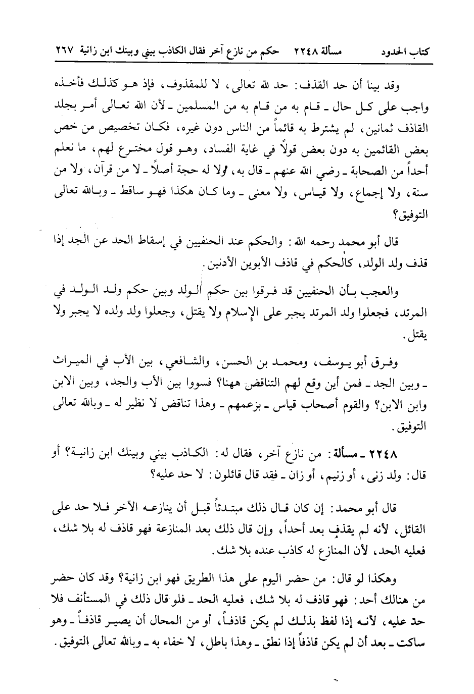 2248 - مَسْأَلَةٌ: مَنْ نَازَعَ آخَرَ، فَقَالَ لَهُ: الْكَاذِبُ بَيْنِي وَبَيْنَك ابْنُ زَانِيَةٍ أَوْ قَالَ: وَلَدُ زِنًا، أَوْ زَنِيمٌ، أَوْ زَانٍ - فَقَدْ قَالَ قَائِلُونَ: لَا حَدَّ عَلَيْهِ قَالَ أَبُو مُحَمَّدٍ: إنْ كَانَ قَالَ ذَلِكَ مُبْتَدِئًا قَبْلَ أَنْ يُنَازِعَهُ الْآخَرُ فَلَا حَدَّ عَلَى الْقَائِلِ؛ لِأَنَّهُ لَمْ يَقْذِفْ بَعْدُ أَحَدًا، وَإِنْ قَالَ ذَلِكَ بَعْدَ الْمُنَازَعَةِ فَهُوَ قَاذِفٌ لَهُ بِلَا شَكٍّ، فَعَلَيْهِ الْحَدُّ؛ لِأَنَّ الْمُنَازِعَ لَهُ كَاذِبٌ عِنْدَهُ بِلَا شَكٍّ. وَهَكَذَا لَوْ قَالَ: مَنْ حَضَرَ الْيَوْمَ عَلَى هَذَا الطَّرِيقِ فَهُوَ ابْنُ زَانِيَةٍ وَقَدْ كَانَ حَضَرَ مِنْ هُنَالِكَ أَحَدٌ: فَهُوَ قَاذِفٌ لَهُ بِلَا شَكٍّ، فَعَلَيْهِ الْحَدُّ - فَلَوْ قَالَ ذَلِكَ فِي الْمُسْتَأْنَفِ فَلَا حَدَّ عَلَيْهِ؛ لِأَنَّهُ إذَا لَفَظَ بِذَلِكَ لَمْ يَكُنْ قَاذِفًا، أَوْ مِنْ الْمُحَالِ أَنْ يَصِيرَ قَاذِفًا - وَهُوَ سَاكِتٌ - بَعْدَ أَنْ لَمْ يَكُنْ قَاذِفًا إذَا نَطَقَ - وَهَذَا بَاطِلٌ، لَا خَفَاءَ بِهِ - بِاَللَّهِ تَعَالَى التَّوْفِيقُ.
