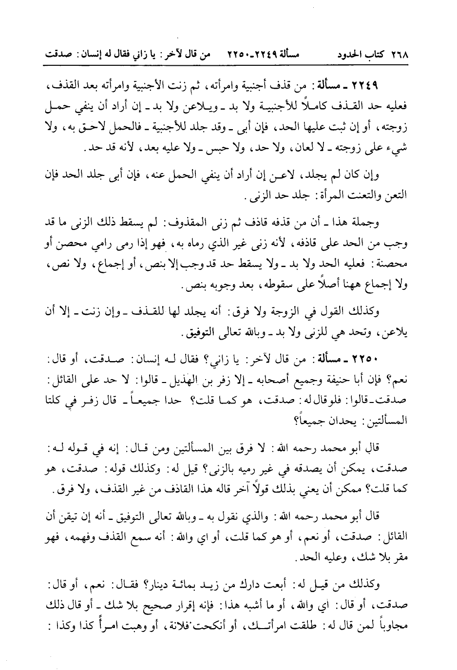 2250 - مَسْأَلَةٌ: مَنْ قَالَ لِآخَرَ: يَا زَانٍ؟ فَقَالَ لَهُ إنْسَانٌ: صَدَقْت، أَوْ قَالَ: نَعَمْ فَإِنَّ أَبَا حَنِيفَةَ وَجَمِيعَ أَصْحَابِهِ - إلَّا زُفَرَ بْنَ الْهُذَيْلِ - قَالُوا: لَا حَدَّ عَلَى الْقَائِلِ: صَدَقْت - قَالُوا: فَلَوْ قَالَ لَهُ: صَدَقْت، هُوَ كَمَا قُلْت؟ حُدَّا جَمِيعًا - قَالَ زُفَرُ فِي كِلْتَا الْمَسْأَلَتَيْنِ: يُحَدَّانِ جَمِيعًا قَالَ أَبُو مُحَمَّدٍ - رَحِمَهُ اللَّهُ -: لَا فَرْقَ بَيْنَ الْمَسْأَلَتَيْنِ وَمَنْ قَالَ: إنَّهُ فِي قَوْلٍ لَهُ: صَدَقْت، يُمْكِنُ أَنْ يُصَدِّقَهُ فِي غَيْرِ رَمْيِهِ بِالزِّنَا؟ قِيلَ لَهُ: وَكَذَلِكَ قَوْلُهُ: صَدَقْت، هُوَ كَمَا قُلْت؟ مُمْكِنٌ أَنْ يَعْنِيَ بِذَلِكَ قَوْلًا آخَرَ قَالَهُ هَذَا الْقَاذِفُ مِنْ غَيْرِ الْقَذْفِ، وَلَا فَرْقَ. قَالَ أَبُو مُحَمَّدٍ - رَحِمَهُ اللَّهُ -: وَاَلَّذِي نَقُولُ بِهِ - وَبِاَللَّهِ تَعَالَى التَّوْفِيقُ - إنَّهُ إنْ تَيَقَّنَ أَنَّ الْقَائِلَ: صَدَقْت، أَوْ نَعَمْ، أَوْ هُوَ كَمَا قُلْت، أَوْ إي وَاَللَّهِ: أَنَّهُ سَمِعَ الْقَذْفَ وَفَهِمَهُ، فَهُوَ مُقِرٌّ بِلَا شَكٍّ، وَعَلَيْهِ الْحَدُّ. وَكَذَلِكَ مَنْ قِيلَ لَهُ: أَبِعْت دَارَك مِنْ زَيْدٍ بِمِائَةِ دِينَارٍ؟ فَقَالَ: نَعَمْ، أَوْ قَالَ: صَدَقْت، أَوْ قَالَ: إي وَاَللَّهِ، أَوْ مَا أَشْبَهَ هَذَا: فَإِنَّهُ إقْرَارٌ صَحِيحٌ بِلَا شَكٍّ - أَوْ قَالَ ذَلِكَ مُجَاوِبًا لِمَنْ قَالَ لَهُ: طَلَّقْت امْرَأَتَك، أَوْ أَنْكَحْت فُلَانَةَ، أَوْ وَهَبْت امْرَأً كَذَا وَكَذَا.