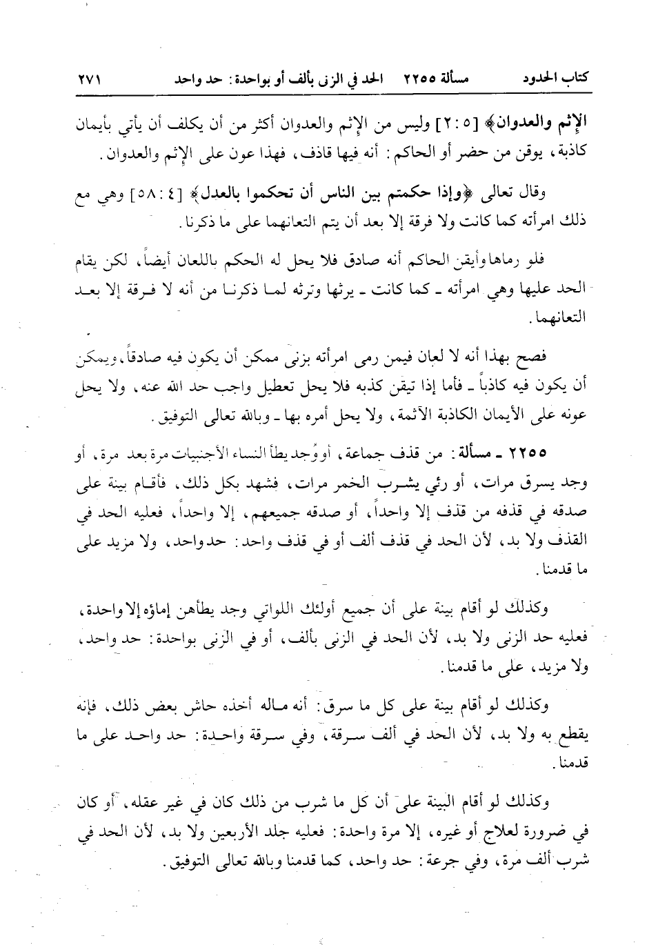 2255 - مَسْأَلَةٌ: مَنْ قَذَفَ جَمَاعَةً، أَوْ وُجِدَ يَطَأُ النِّسَاءَ الْأَجْنَبِيَّاتِ مَرَّةً بَعْدَ مَرَّةٍ، أَوْ وُجِدَ يَسْرِقُ مَرَّاتٍ، أَوْ رُئِيَ يَشْرَبُ الْخَمْرَ مَرَّاتٍ، فَشَهِدَ بِكُلِّ ذَلِكَ، فَأَقَامَ بَيِّنَةً عَلَى صِدْقِهِ فِي قَذْفِهِ مَنْ قَذَفَ إلَّا وَاحِدًا، أَوْ صَدَّقَهُ جَمِيعُهُمْ، إلَّا وَاحِدًا، فَعَلَيْهِ الْحَدُّ فِي الْقَذْفِ وَلَا بُدَّ؛ لِأَنَّ الْحَدَّ فِي قَذْفِ أَلْفٍ أَوْ فِي قَذْفِ وَاحِدٍ: حَدٌّ وَاحِدٌ، وَلَا مَزِيدَ عَلَى مَا قَدَّمْنَا. وَكَذَلِكَ لَوْ أَقَامَ بَيِّنَةً عَلَى أَنَّ جَمِيعَ أُولَئِكَ اللَّوَاتِي وُجِدَ يَطَأُهُنَّ إمَاؤُهُ إلَّا وَاحِدَةً، فَعَلَيْهِ حَدُّ الزِّنَا وَلَا بُدَّ؛ لِأَنَّ الْحَدَّ فِي الزِّنَا بِأَلْفٍ، أَوْ فِي الزِّنَا بِوَاحِدَةٍ: حَدٌّ وَاحِدٌ، وَلَا مَزِيدَ، عَلَى مَا قَدَّمْنَا. وَكَذَلِكَ لَوْ أَقَامَ بَيِّنَةً عَلَى كُلِّ مَا سَرَقَ: أَنَّهُ مَالُهُ أَخَذَهُ حَاشَ بَعْضَ ذَلِكَ، فَإِنَّهُ يُقْطَعُ بِهِ وَلَا بُدَّ؛ لِأَنَّ الْحَدَّ فِي أَلْفِ سَرِقَةٍ، وَفِي سَرِقَةٍ وَاحِدَةٍ: حَدٌّ وَاحِدٌ عَلَى مَا قَدَّمْنَا، وَكَذَلِكَ لَوْ أَقَامَ الْبَيِّنَةَ عَلَى أَنَّ كُلَّ مَا شَرِبَ مِنْ ذَلِكَ كَانَ فِي غَيْرِ عَقْلِهِ، أَوْ كَانَ فِي ضَرُورَةٍ لِعِلَاجٍ أَوْ غَيْرِهِ، إلَّا مَرَّةً وَاحِدَةً: فَعَلَيْهِ جَلْدُ الْأَرْبَعِينَ وَلَا بُدَّ؛ لِأَنَّ الْحَدَّ فِي شُرْبِ أَلْفِ مَرَّةٍ، وَفِي جَرْعَةٍ: حَدٌّ وَاحِدٌ، كَمَا قَدَّمْنَا وَبِاَللَّهِ تَعَالَى التَّوْفِيقُ.