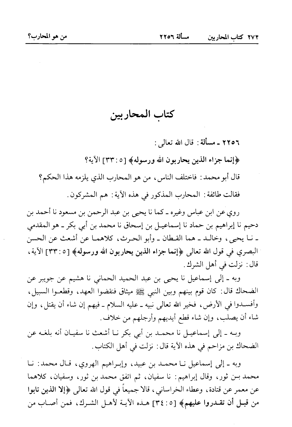 َ 2256 - مَسْأَلَةٌ: قَالَ اللَّهُ تَعَالَى: {إِنَّمَا جَزَاءُ الَّذِينَ يُحَارِبُونَ اللَّهَ وَرَسُولَهُ} [المائدة: 33] الْآيَةَ قَالَ أَبُو مُحَمَّدٍ: فَاخْتَلَفَ النَّاسُ، مَنْ هُوَ الْمُحَارِبُ الَّذِي يَلْزَمُهُ هَذَا الْحُكْمُ؟ فَقَالَتْ طَائِفَةٌ: الْمُحَارِبُ الْمَذْكُورُ فِي هَذِهِ الْآيَةِ: هُمْ الْمُشْرِكُونَ. رُوِيَ عَنْ ابْنِ عَبَّاسٍ وَغَيْرِهِ - كَمَا نا يَحْيَى بْنُ عَبْدِ الرَّحْمَنِ بْنِ مَسْعُودٍ نا أَحْمَدُ بْنُ دُحَيْمٍ نا إبْرَاهِيمُ بْنُ حَمَّادٍ نا إسْمَاعِيلُ بْنُ إِسْحَاقَ نا مُحَمَّدُ بْنُ أَبِي بَكْرٍ - هُوَ الْمُقَدَّمِيُّ - نا يَحْيَى، وَخَالِدٌ - هُمَا الْقَطَّانُ - وَأَبُو الْحَارِثِ، كِلَاهُمَا عَنْ أَشْعَثَ عَنْ الْحَسَنِ الْبَصْرِيِّ فِي قَوْلِ اللَّهِ تَعَالَى {إِنَّمَا جَزَاءُ الَّذِينَ يُحَارِبُونَ اللَّهَ وَرَسُولَهُ} [المائدة: 33] الْآيَةَ، قَالَ: نَزَلَتْ فِي أَهْلِ الشِّرْكِ. وَبِهِ - إلَى إسْمَاعِيلَ نا يَحْيَى بْنُ عَبْدِ الْحَمِيدِ الْحِمَّانِيُّ نا هُشَيْمٌ عَنْ جُوَيْبِرٍ عَنْ الضَّحَّاكِ قَالَ: كَانَ قَوْمٌ بَيْنَهُمْ وَبَيْنَ النَّبِيِّ - صَلَّى اللَّهُ عَلَيْهِ وَسَلَّمَ - مِيثَاقٌ فَنَقَضُوا الْعَهْدَ، وَقَطَعُوا السَّبِيلَ، وَأَفْسَدُوا فِي الْأَرْضِ، فَخَيَّرَ اللَّهُ تَعَالَى نَبِيَّهُ - عَلَيْهِ السَّلَامُ - فِيهِمْ إنْ شَاءَ أَنْ يَقْتُلَ، وَإِنْ شَاءَ أَنْ يَصْلُبَ، وَإِنْ شَاءَ قَطَعَ أَيْدِيَهُمْ وَأَرْجُلَهُمْ مِنْ خِلَافٍ.