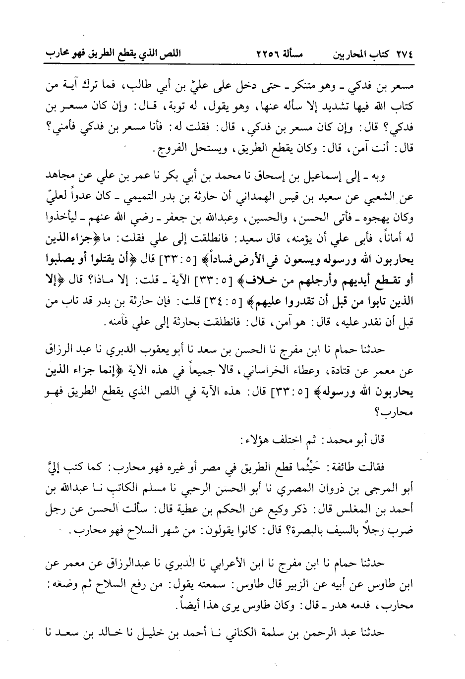 حَدَّثَنَا حُمَامٌ نا ابْنُ مُفَرِّجٍ نا الْحَسَنُ بْنُ سَعْدٍ نا أَبُو يَعْقُوبِ الدَّبَرِيُّ نا عَبْدُ الرَّزَّاقِ عَنْ مَعْمَرٍ عَنْ قَتَادَةَ، وَعَطَاءٍ الْخُرَاسَانِيِّ، قَالَا جَمِيعًا فِي هَذِهِ الْآيَةِ {إِنَّمَا جَزَاءُ الَّذِينَ يُحَارِبُونَ اللَّهَ وَرَسُولَهُ} [المائدة: 33] قَالَ: هَذِهِ الْآيَةُ فِي اللِّصِّ الَّذِي يَقْطَعُ الطَّرِيقَ فَهُوَ مُحَارِبٌ قَالَ أَبُو مُحَمَّدٍ: ثُمَّ اخْتَلَفَ هَؤُلَاءِ: فَقَالَتْ طَائِفَةٌ: حَيْثُمَا قَطَعَ الطَّرِيقَ فِي مِصْرٍ أَوْ غَيْرِهِ فَهُوَ مُحَارِبٌ: كَمَا كَتَبَ إلَيَّ أَبُو الْمُرَجَّى بْنُ ذَرْوَانَ الْمِصْرِيُّ نا أَبُو الْحَسَنِ الرَّحَبِيُّ نا مُسْلِمٌ الْكَاتِبُ نا عَبْدُ اللَّهِ بْنُ أَحْمَدَ بْنِ الْمُغَلِّسِ قَالَ: ذَكَرَ وَكِيعٌ عَنْ الْحَكَمِ بْنِ عَطِيَّةَ قَالَ: سَأَلْت الْحَسَنَ عَنْ رَجُلٍ ضَرَبَ رَجُلًا بِالسَّيْفِ بِالْبَصْرَةِ؟ قَالَ: كَانُوا يَقُولُونَ: مَنْ شَهَرَ السِّلَاحَ فَهُوَ مُحَارِبٌ. حَدَّثَنَا حُمَامٌ نا ابْنُ مُفَرِّجٍ نا ابْنُ الْأَعْرَابِيِّ نا الدَّبَرِيُّ نا عَبْدُ الرَّزَّاقِ عَنْ مَعْمَرٍ عَنْ ابْنِ طَاوُسٍ عَنْ أَبِيهِ عَنْ الزُّبَيْرِ قَالَ طَاوُسٌ: سَمِعْته يَقُولُ: مَنْ رَفَعَ السِّلَاحَ ثُمَّ وَضَعَهُ: مُحَارِبٌ، فَدَمُهُ هَدَرٌ - قَالَ: وَكَانَ طَاوُسٌ يَرَى هَذَا أَيْضًا. حَدَّثَنَا عَبْدُ الرَّحْمَنِ بْنُ سَلَمَةَ الْكِنَانِيُّ نا أَحْمَدُ بْنُ خَلِيلٍ نا خَالِدُ بْنُ سَعْدٍ نا