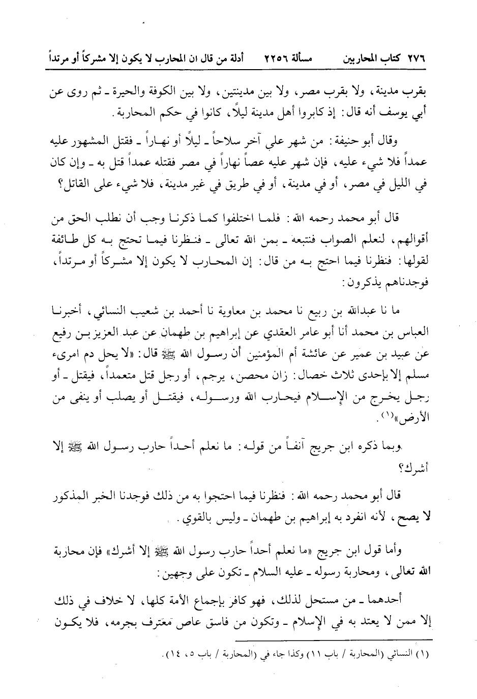 بِقُرْبِ مَدِينَةٍ، وَلَا بِقُرْبِ مِصْرٍ وَلَا بَيْنَ مَدِينَتَيْنِ، وَلَا بَيْنَ الْكُوفَةِ وَالْحِيرَةِ - ثُمَّ رُوِيَ عَنْ أَبِي يُوسُفَ أَنَّهُ قَالَ: إذْ كَابَرُوا أَهْلَ مَدِينَةٍ لَيْلًا، كَانُوا فِي حُكْمِ الْمُحَارَبَةِ. وَقَالَ أَبُو حَنِيفَةَ: مَنْ شَهَرَ عَلَى آخَرَ سِلَاحًا - لَيْلًا أَوْ نَهَارًا - فَقَتَلَهُ الْمَشْهُورُ عَلَيْهِ عَمْدًا فَلَا شَيْءَ عَلَيْهِ، فَإِنْ شَهَرَ عَلَيْهِ عَصًا نَهَارًا فِي مِصْرٍ فَقَتَلَهُ عَمْدًا قُتِلَ بِهِ - وَإِنْ كَانَ فِي اللَّيْلِ فِي مِصْرٍ، أَوْ فِي مَدِينَةٍ، أَوْ فِي طَرِيقٍ فِي غَيْرِ مَدِينَةٍ، فَلَا شَيْءَ عَلَى الْقَاتِلِ قَالَ أَبُو مُحَمَّدٍ - رَحِمَهُ اللَّهُ -: فَلَمَّا اخْتَلَفُوا كَمَا ذَكَرْنَا وَجَبَ أَنْ نَطْلُبَ الْحَقَّ مِنْ أَقْوَالِهِمْ، لِنَعْلَمَ الصَّوَابَ فَنَتَّبِعُهُ - بِمَنِّ اللَّهِ تَعَالَى - فَنَظَرْنَا فِيمَا تَحْتَجُّ بِهِ كُلُّ طَائِفَةٍ لِقَوْلِهَا: فَنَظَرْنَا فِيمَا احْتَجَّ بِهِ مَنْ قَالَ: إنَّ الْمُحَارِبَ لَا يَكُونُ إلَّا مُشْرِكًا أَوْ مُرْتَدًّا، فَوَجَدْنَاهُمْ يَذْكُرُونَ: مَا نا عَبْدُ اللَّهِ بْنُ رَبِيعٍ نا مُحَمَّدُ بْنُ مُعَاوِيَةَ نا أَحْمَدُ بْنُ شُعَيْبٍ النَّسَائِيّ، أَخْبَرَنَا الْعَبَّاسُ بْنُ مُحَمَّدٍ أَنَا أَبُو عَامِرٍ الْعَقَدِيُّ عَنْ إبْرَاهِيمَ بْنِ طَهْمَانَ عَنْ عَبْدِ الْعَزِيزِ بْنِ رُفَيْعٍ عَنْ عُبَيْدِ بْنِ عُمَيْرٍ عَنْ عَائِشَةَ أُمِّ الْمُؤْمِنِينَ أَنَّ رَسُولَ اللَّهِ - صَلَّى اللَّهُ عَلَيْهِ وَسَلَّمَ - قَالَ: «لَا يَحِلُّ دَمُ امْرِئٍ مُسْلِمٍ إلَّا بِإِحْدَى ثَلَاثِ خِصَالٍ: زَانٍ مُحْصَنٌ، يُرْجَمُ، أَوْ رَجُلٌ قَتَلَ مُتَعَمِّدًا، فَيُقْتَلُ - أَوْ رَجُلٌ يَخْرُجُ مِنْ الْإِسْلَامِ فَيُحَارِبُ اللَّهَ وَرَسُولَهُ، فَيُقْتَلُ أَوْ يُصَلَّبُ أَوْ يُنْفَى مِنْ الْأَرْضِ» . وَبِمَا ذَكَرَهُ ابْنُ جُرَيْجٍ آنِفًا مِنْ قَوْلِهِ: مَا نَعْلَمُ أَحَدًا حَارَبَ رَسُولَ اللَّهِ - صَلَّى اللَّهُ عَلَيْهِ وَسَلَّمَ - إلَّا أَشْرَكَ قَالَ أَبُو مُحَمَّدٍ - رَحِمَهُ اللَّهُ -: فَنَظَرْنَا فِيمَا احْتَجُّوا بِهِ مِنْ ذَلِكَ فَوَجَدْنَا الْخَبَرَ الْمَذْكُورَ لَا يَصِحُّ؛ لِأَنَّهُ انْفَرَدَ بِهِ إبْرَاهِيمُ بْنُ طَهْمَانَ - وَلَيْسَ بِالْقَوِيِّ. وَأَمَّا قَوْلُ ابْنِ جُرَيْجٍ " مَا نَعْلَمُ أَحَدًا حَارَبَ رَسُولَ اللَّهِ - صَلَّى اللَّهُ عَلَيْهِ وَسَلَّمَ - إلَّا أَشْرَكَ " فَإِنَّ مُحَارَبَةَ اللَّهِ تَعَالَى، وَمُحَارَبَةَ رَسُولِهِ - عَلَيْهِ السَّلَامُ - تَكُونُ عَلَى وَجْهَيْنِ: أَحَدُهُمَا - مِنْ مُسْتَحِلٍّ لِذَلِكَ، فَهُوَ كَافِرٌ بِإِجْمَاعِ الْأُمَّةِ كُلِّهَا، لَا خِلَافَ فِي ذَلِكَ إلَّا مِمَّنْ لَا يُعْتَدُّ بِهِ فِي الْإِسْلَامِ - وَتَكُونُ مِنْ فَاسِقٍ عَاصٍ مُعْتَرِفٍ بِجُرْمِهِ، فَلَا يَكُونُ